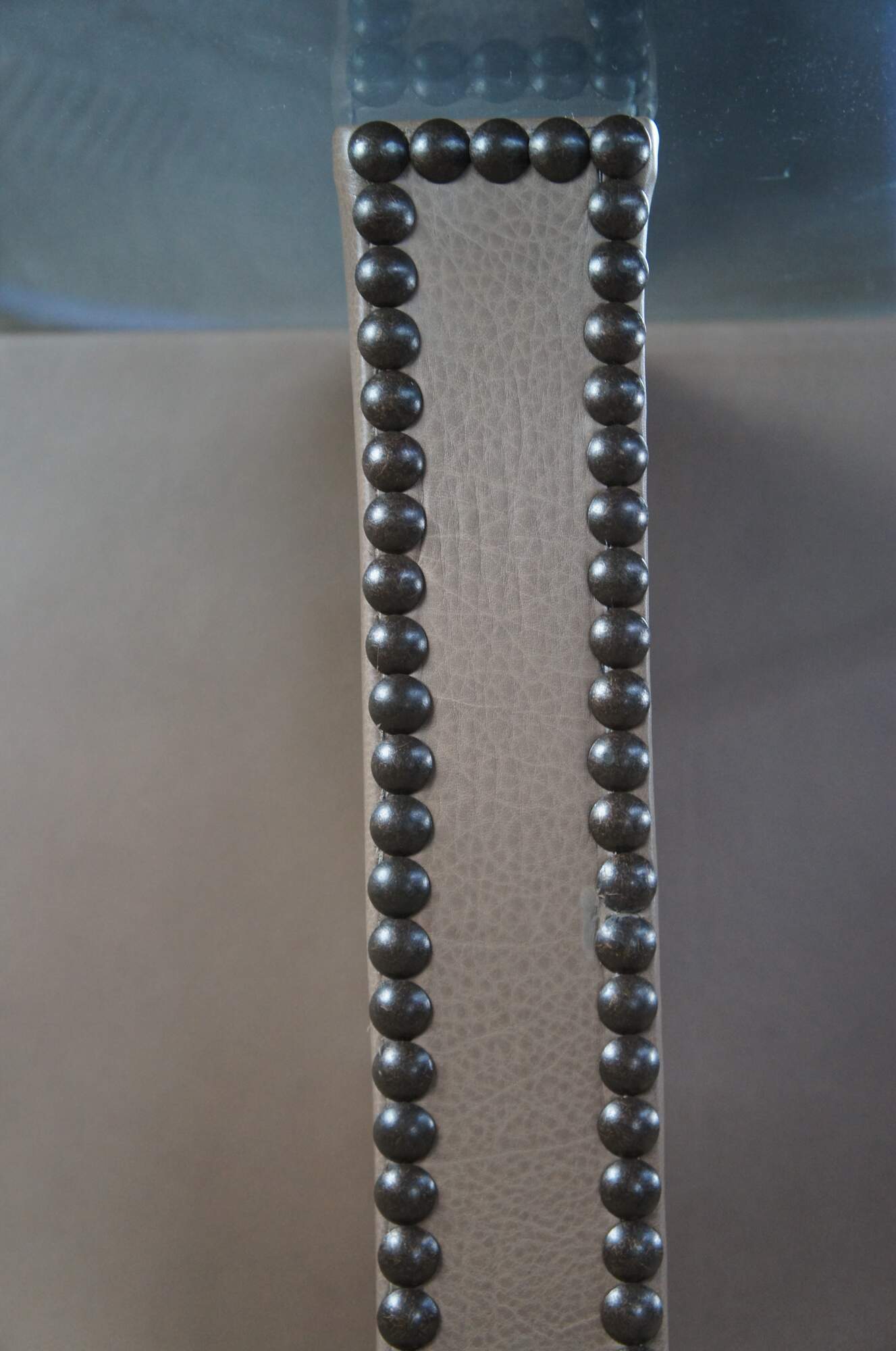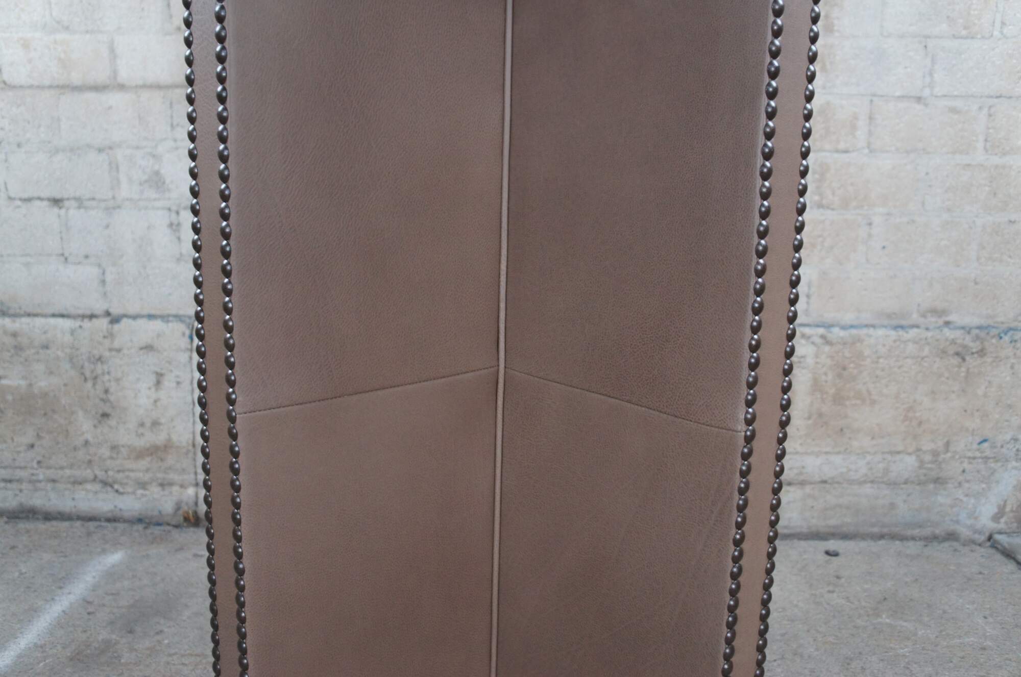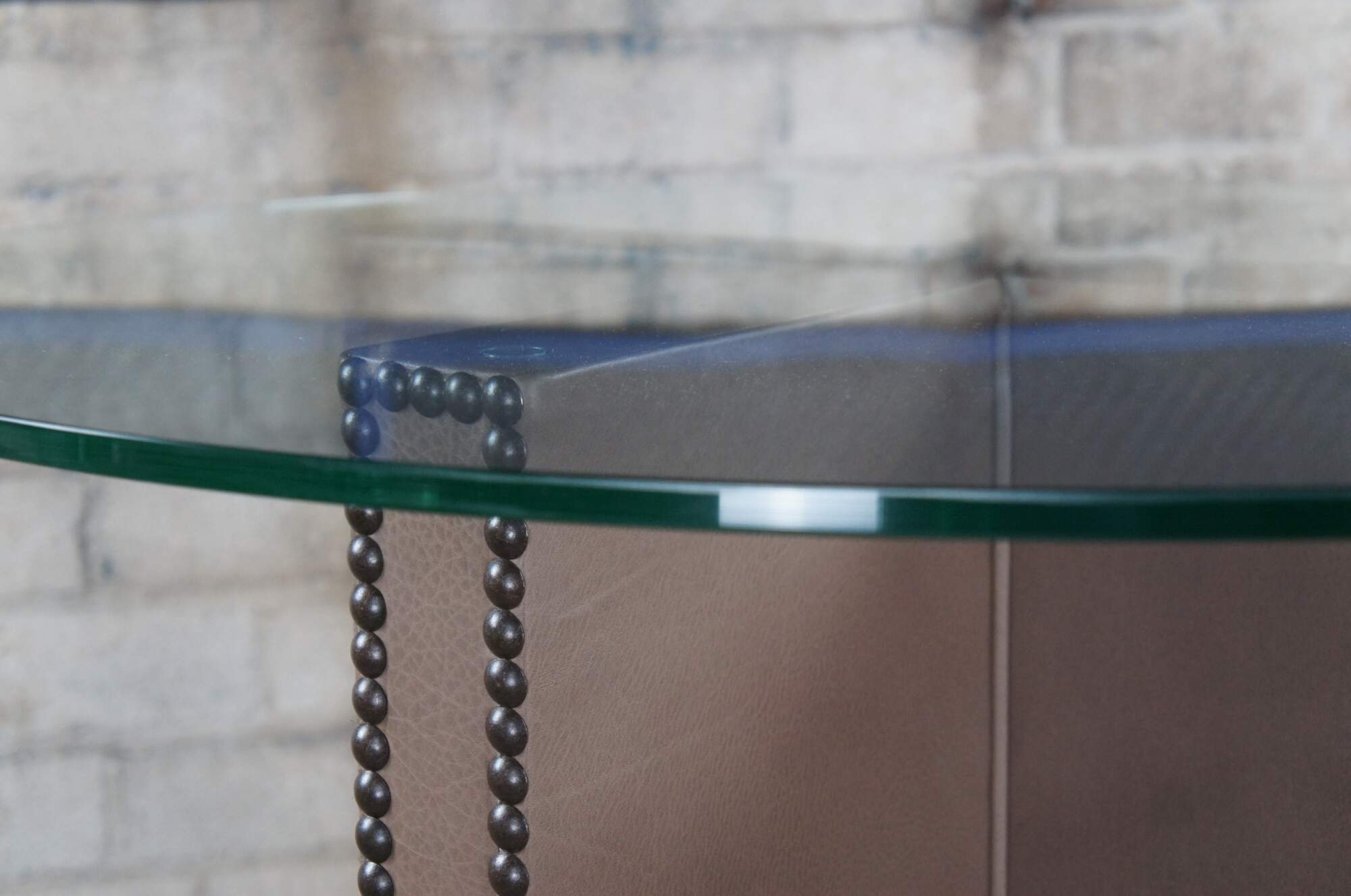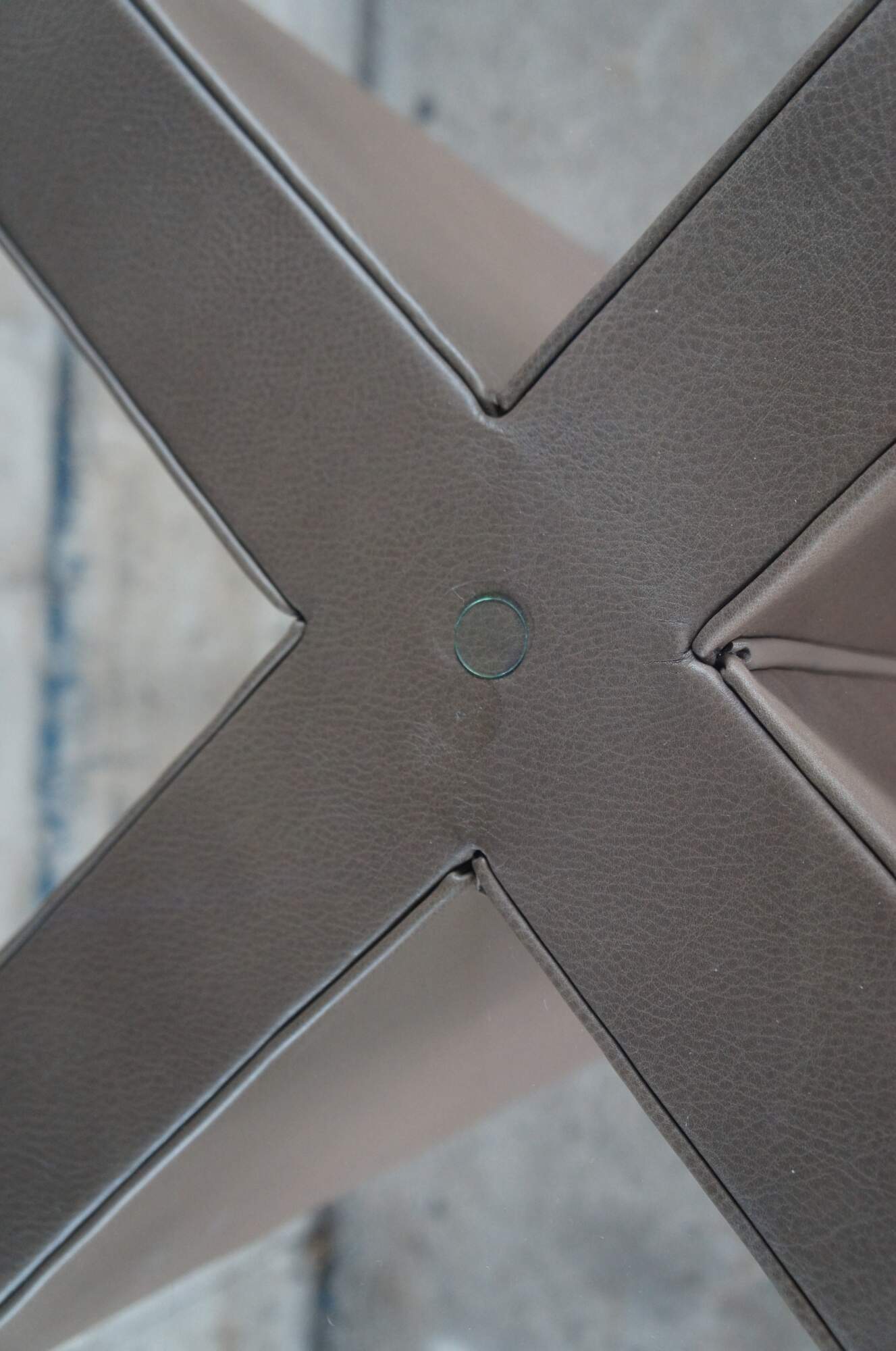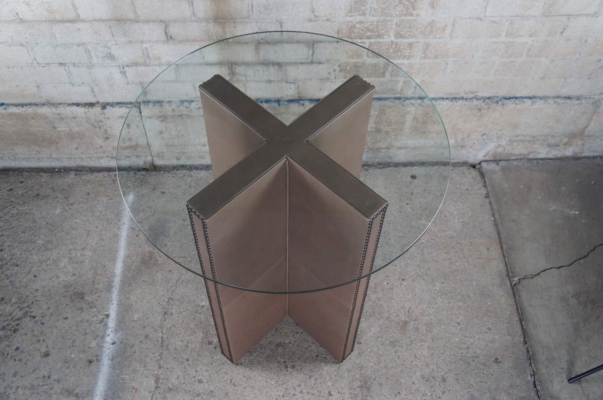 Pair of Brown Leather "X" form handmade pub or bistro tables. Features nailhead trim and round polished glass tops.