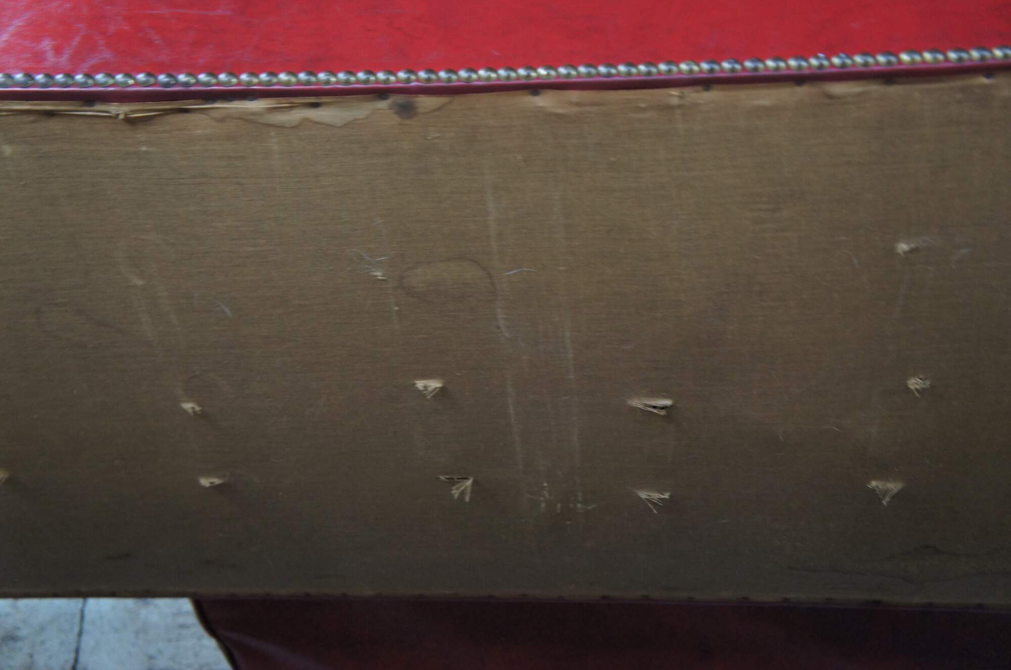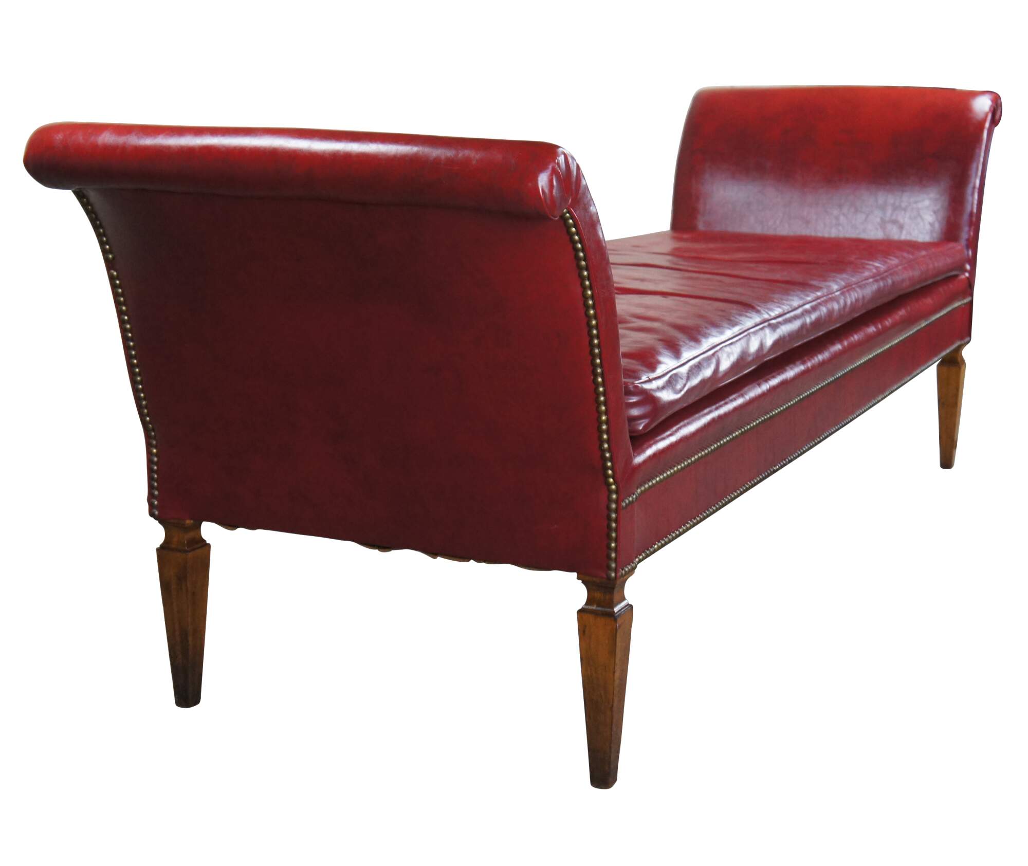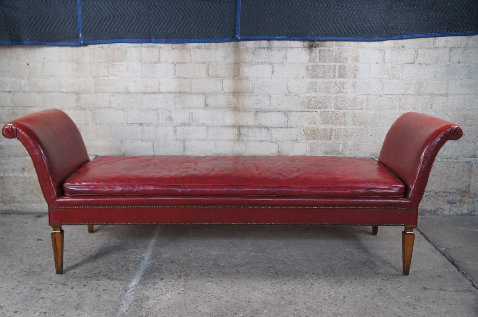 Large Mid 20th Century Chaise Lounge, bench or daybed. Features a long red leather upholstered frame with flared and scrolled arms over square tapered mahogany feet. Includes nailhead trim.