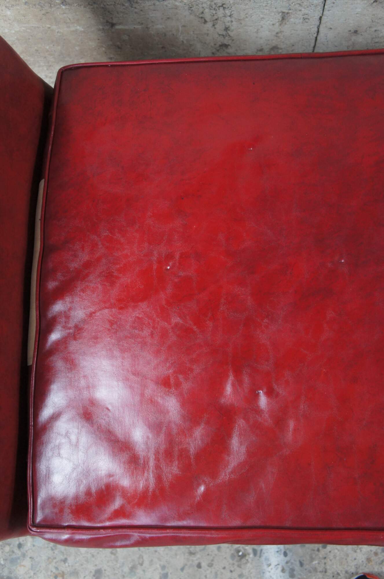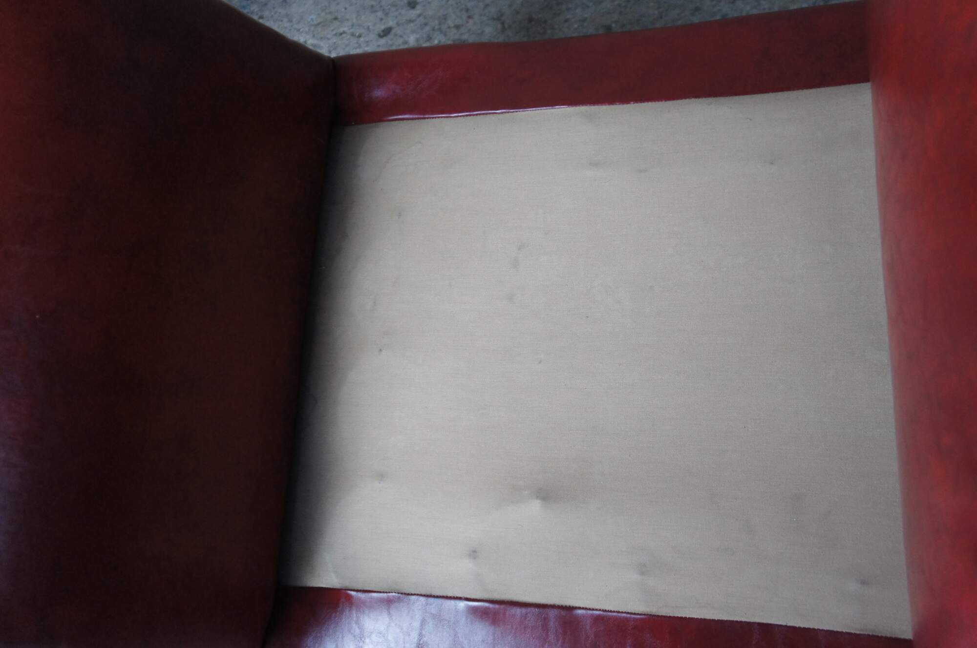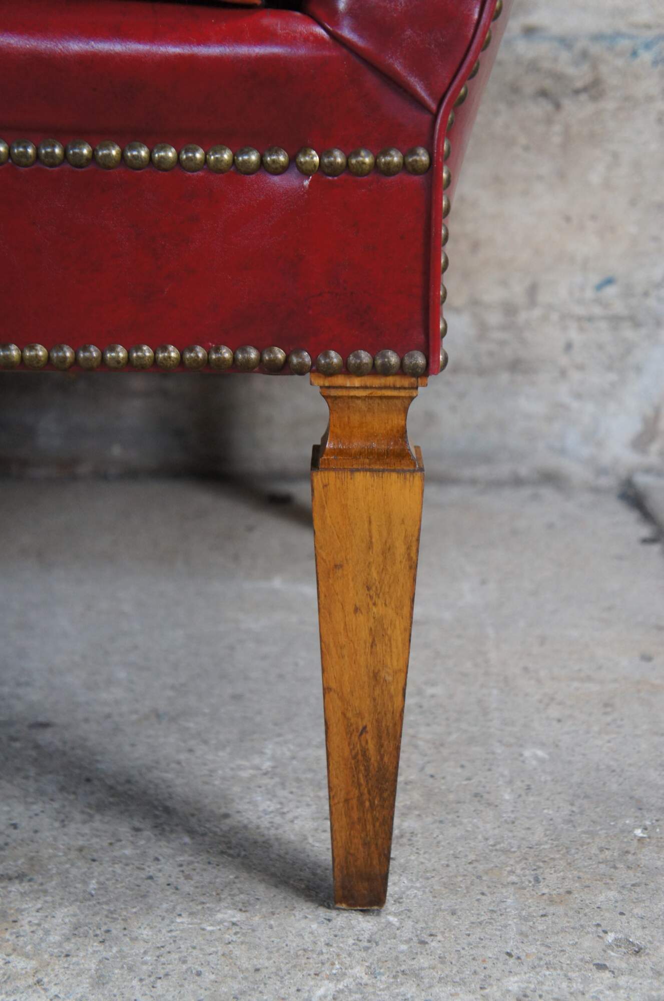 Large Mid 20th Century Chaise Lounge, bench or daybed. Features a long red leather upholstered frame with flared and scrolled arms over square tapered mahogany feet. Includes nailhead trim.