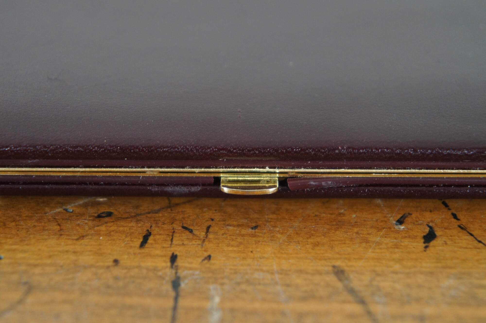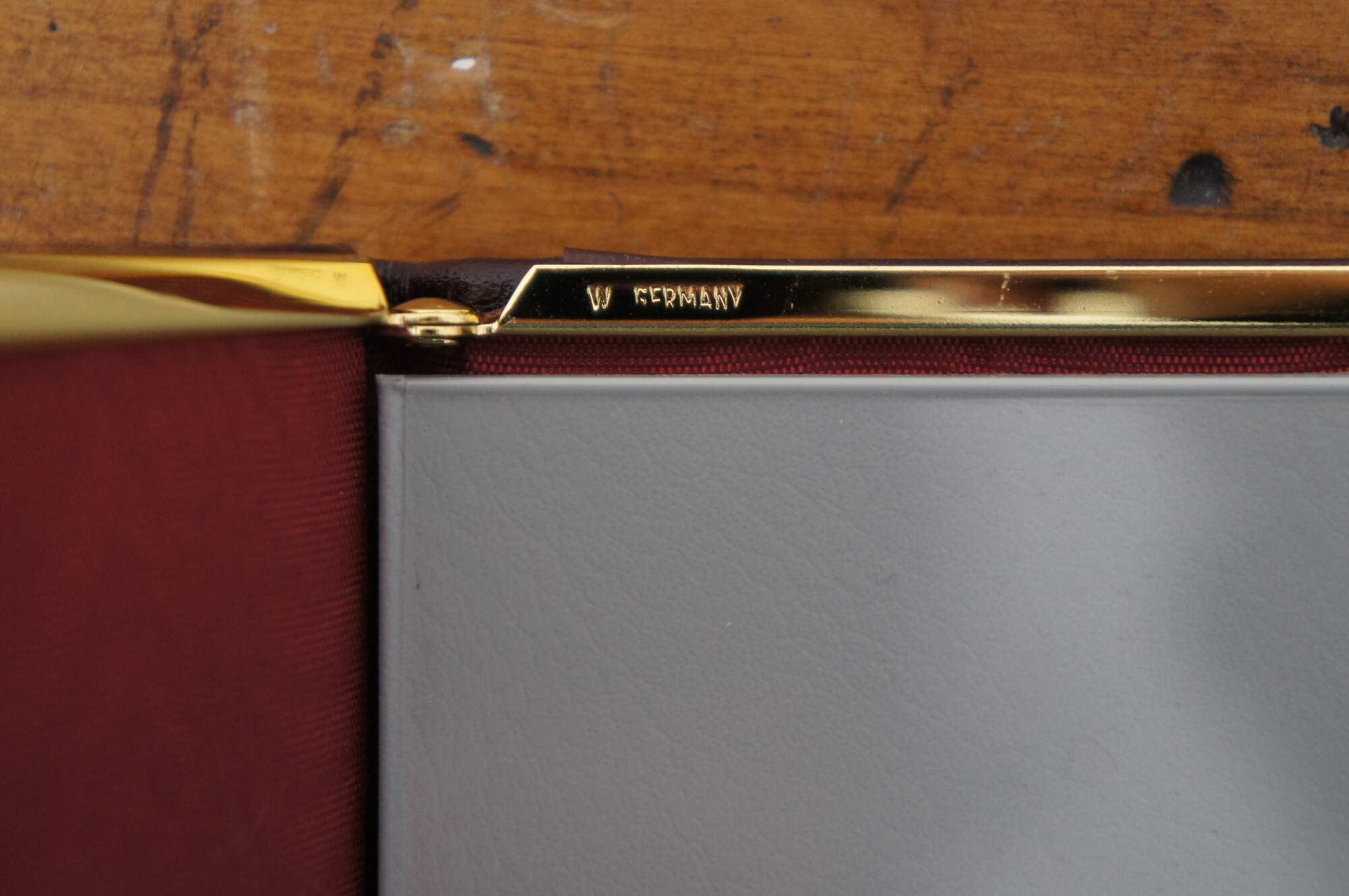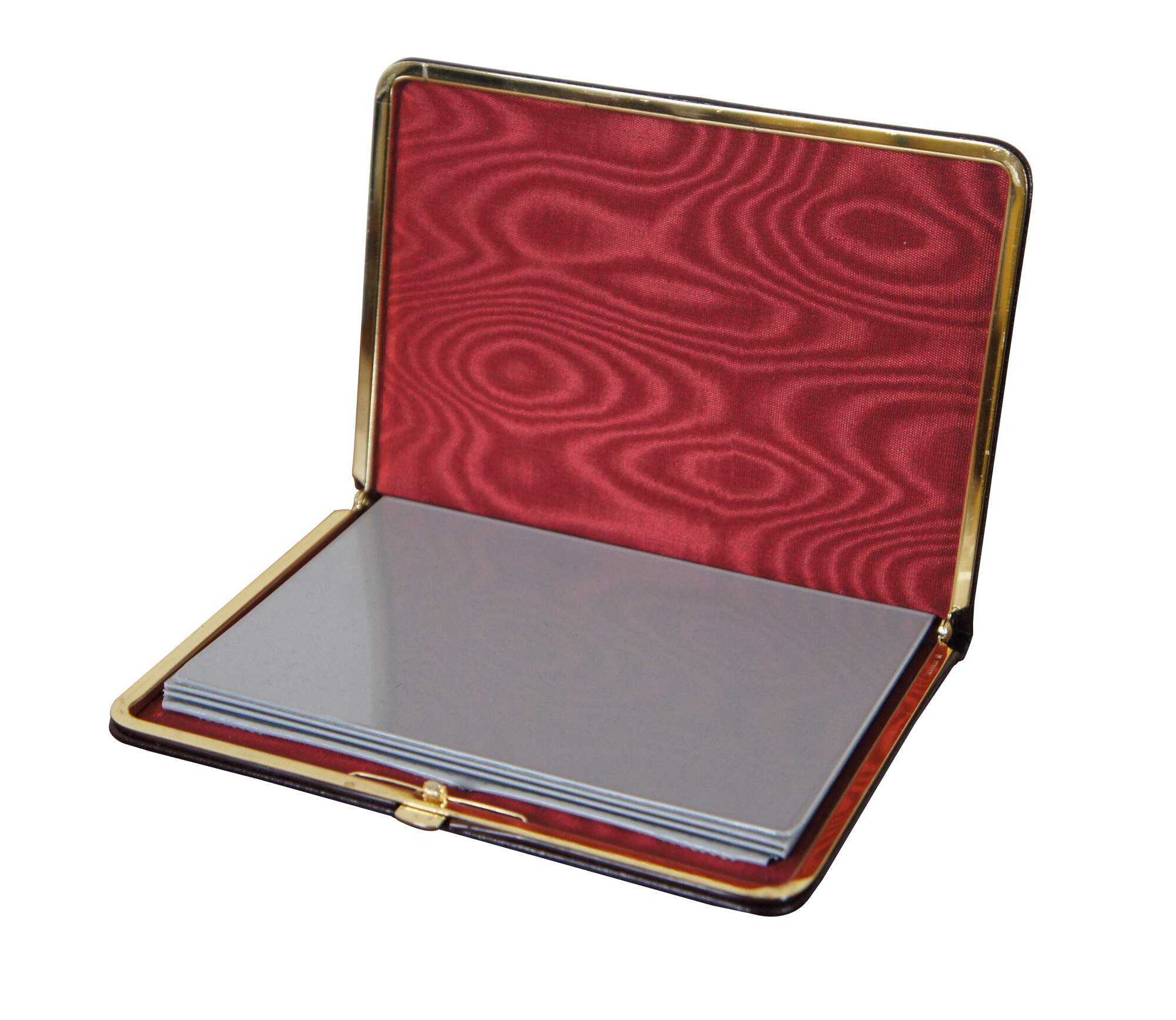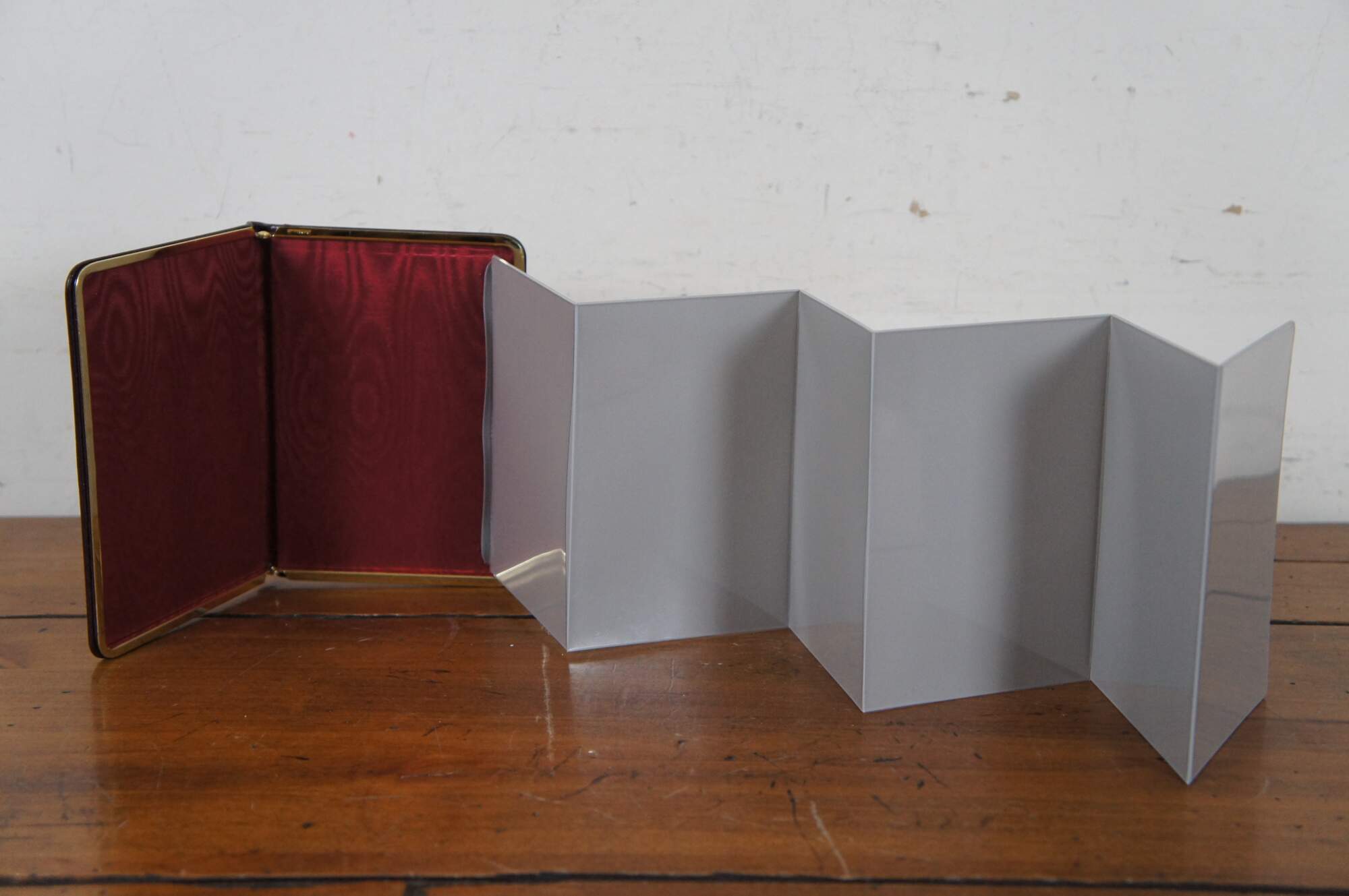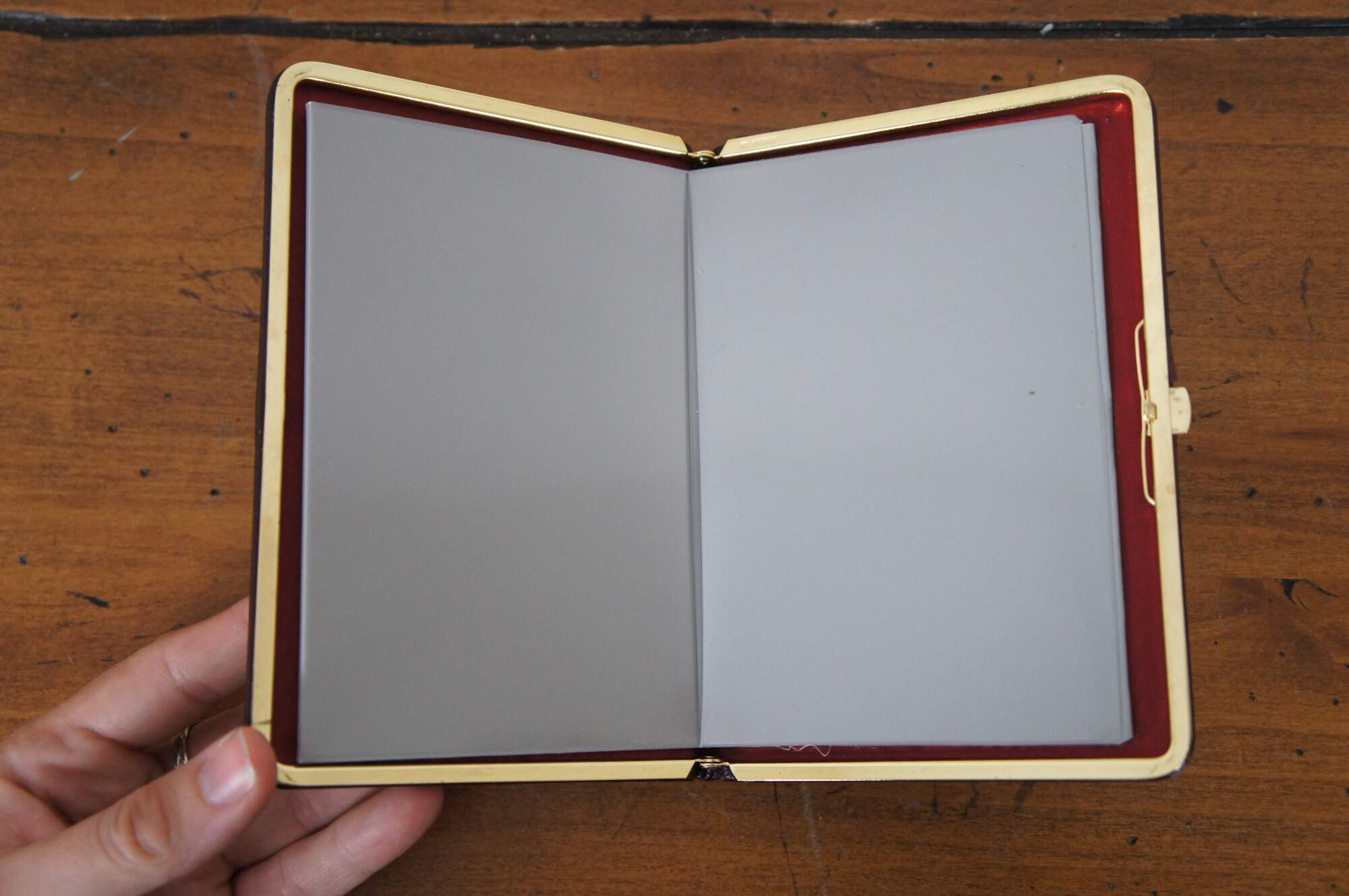 Vintage Brookstone photo album case in burgundy leather with red silk lining and brass clasp (West Germany) and accordion style photo slots with space for 12 pictures.
