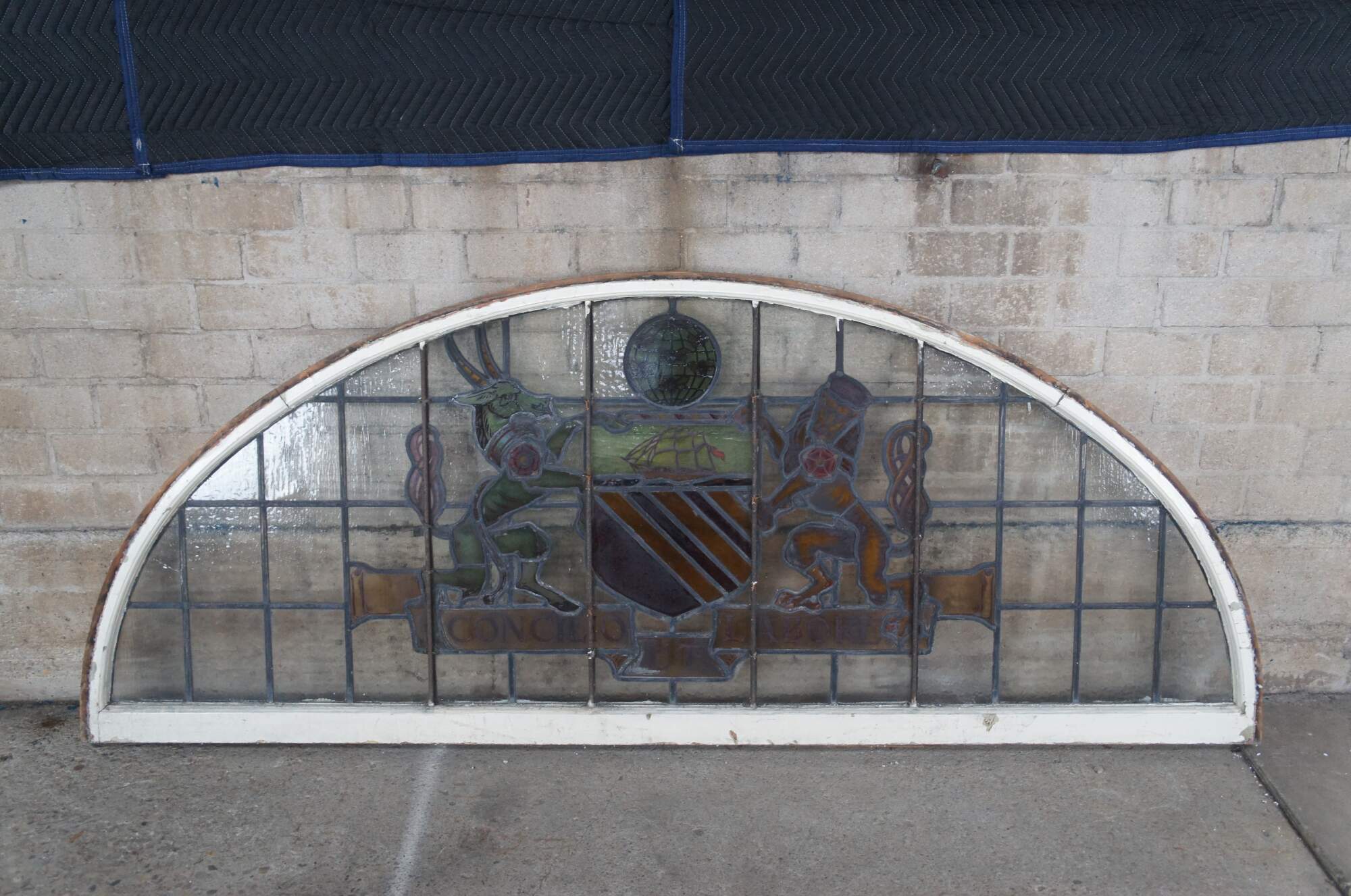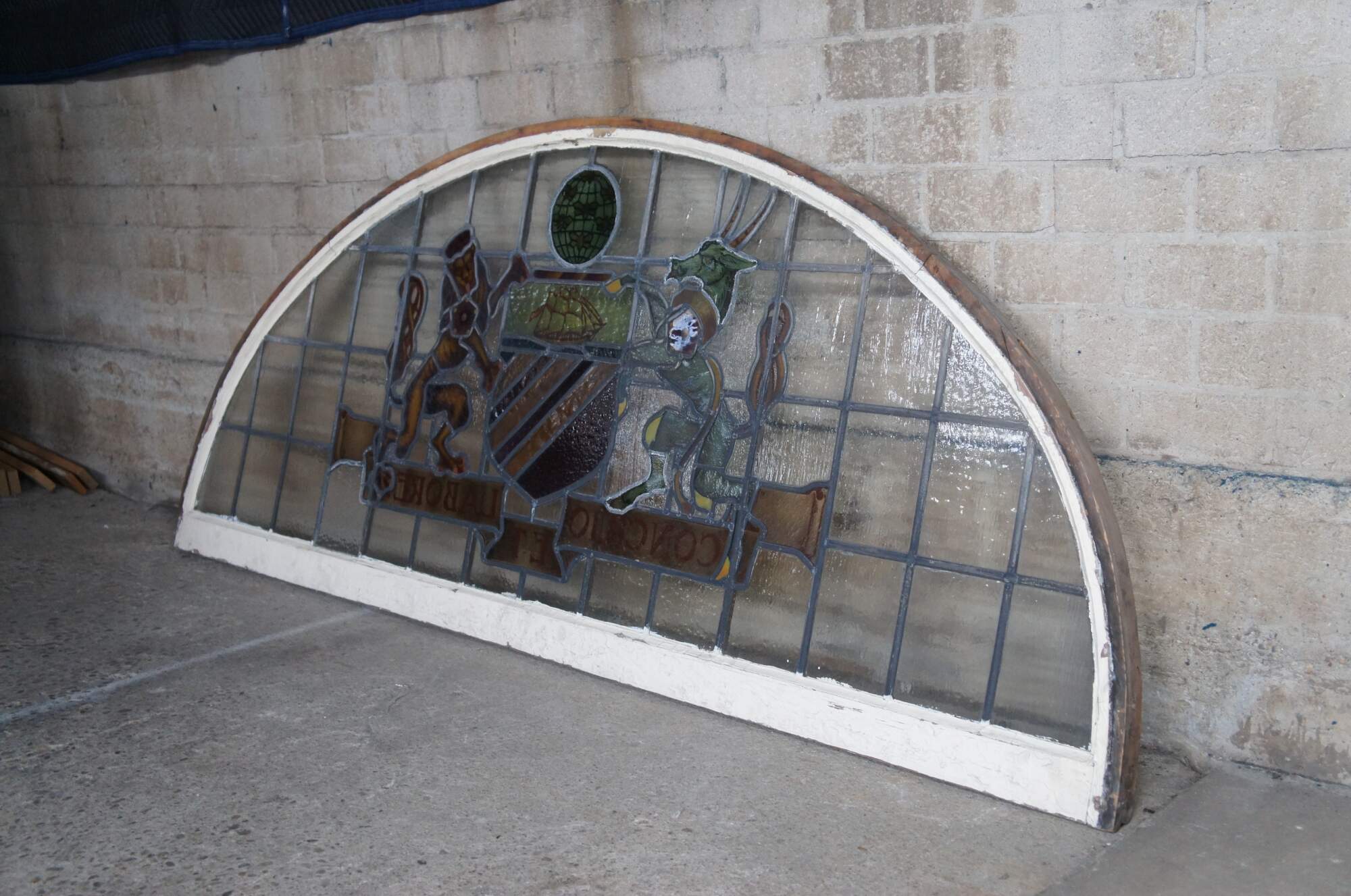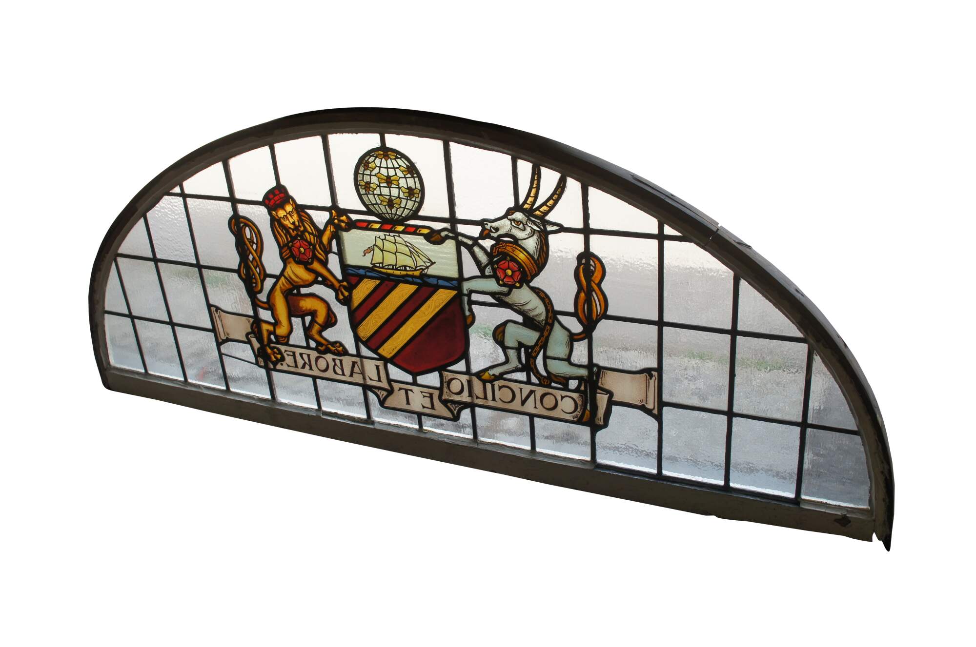 A fantastic very large pair of exceedingly rare leaded stained glass Palladian window panels, circa late 19th century. Features the Manchester England Coat of Arms, aptly titled 'Concilio et Labore' translated to 'By Counsel and Work' or 'Wisdom and Effort'. At the center is a heraldic Antelope and Lion centered around a shield beneath a ship and world globe with bees. The glass is boldly colored and impeccably designed. The coat of arms is centered over a large leaded lattice design and framed wood with an antique white finish. Removed from a prominent municipal building in England. Restored & Professionally Crated.