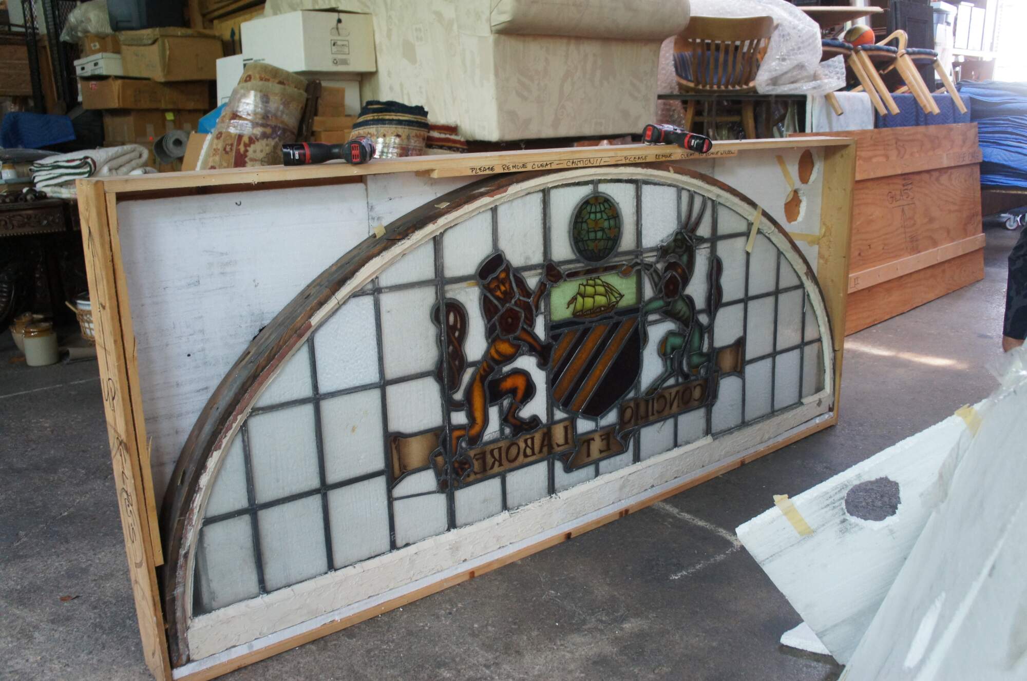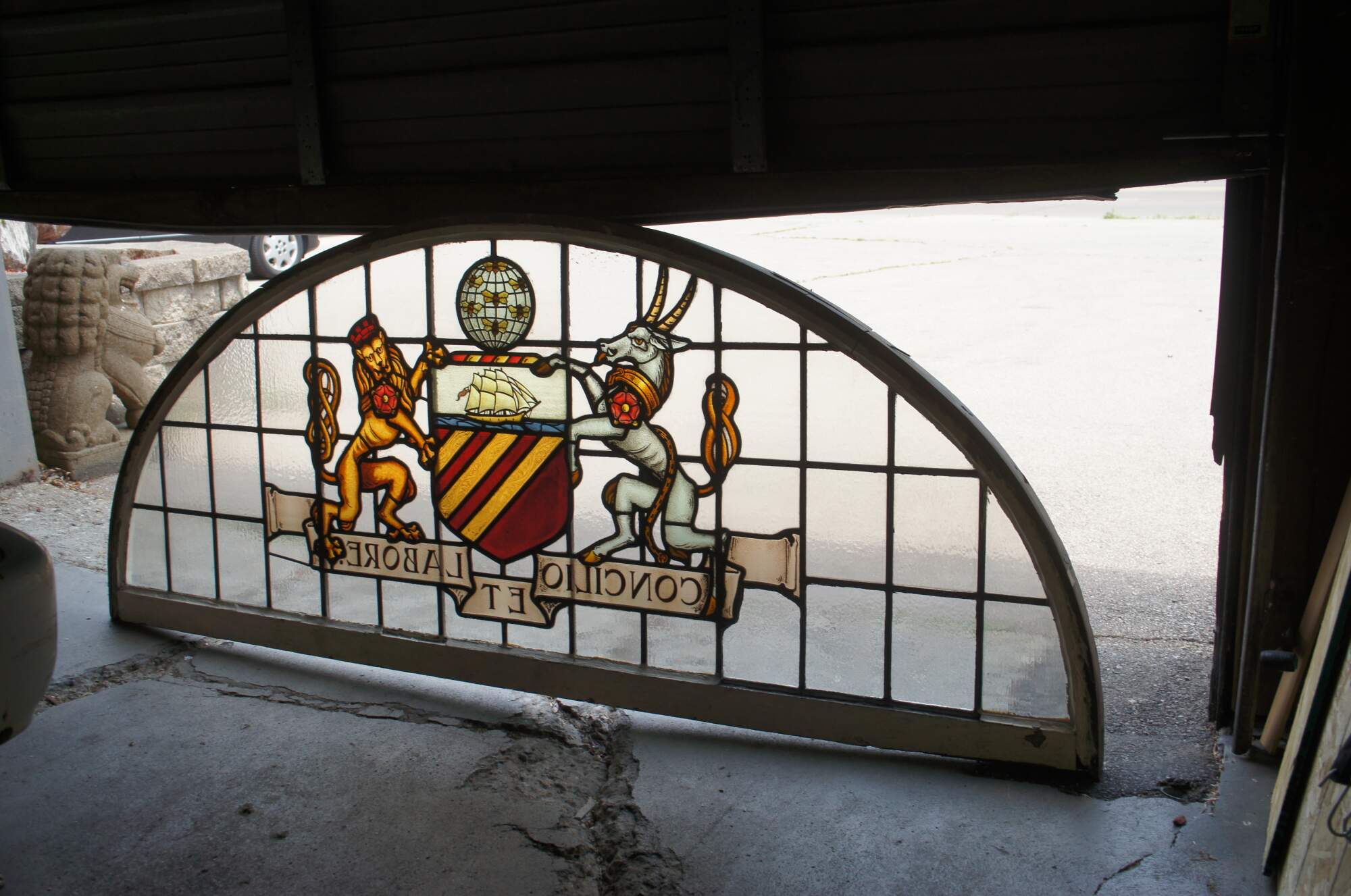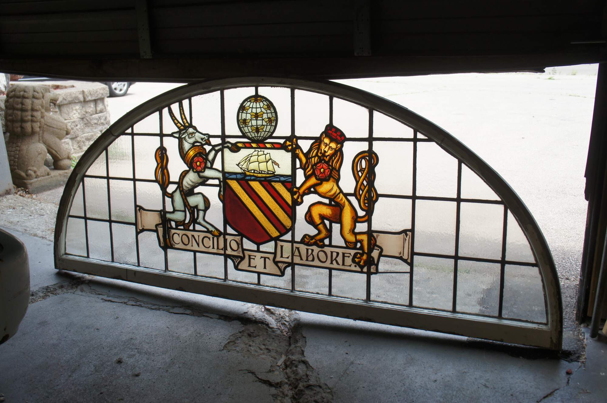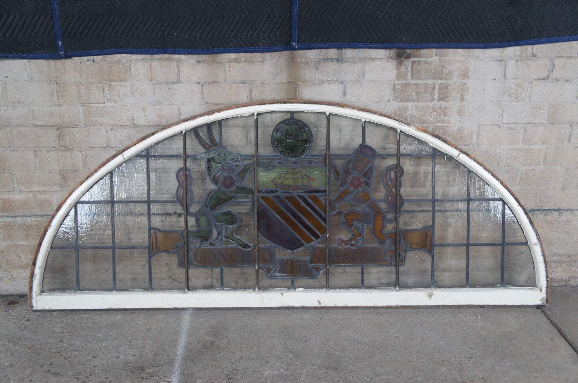 A fantastic very large pair of exceedingly rare leaded stained glass Palladian window panels, circa late 19th century. Features the Manchester England Coat of Arms, aptly titled 'Concilio et Labore' translated to 'By Counsel and Work' or 'Wisdom and Effort'. At the center is a heraldic Antelope and Lion centered around a shield beneath a ship and world globe with bees. The glass is boldly colored and impeccably designed. The coat of arms is centered over a large leaded lattice design and framed wood with an antique white finish. Removed from a prominent municipal building in England. Restored & Professionally Crated.