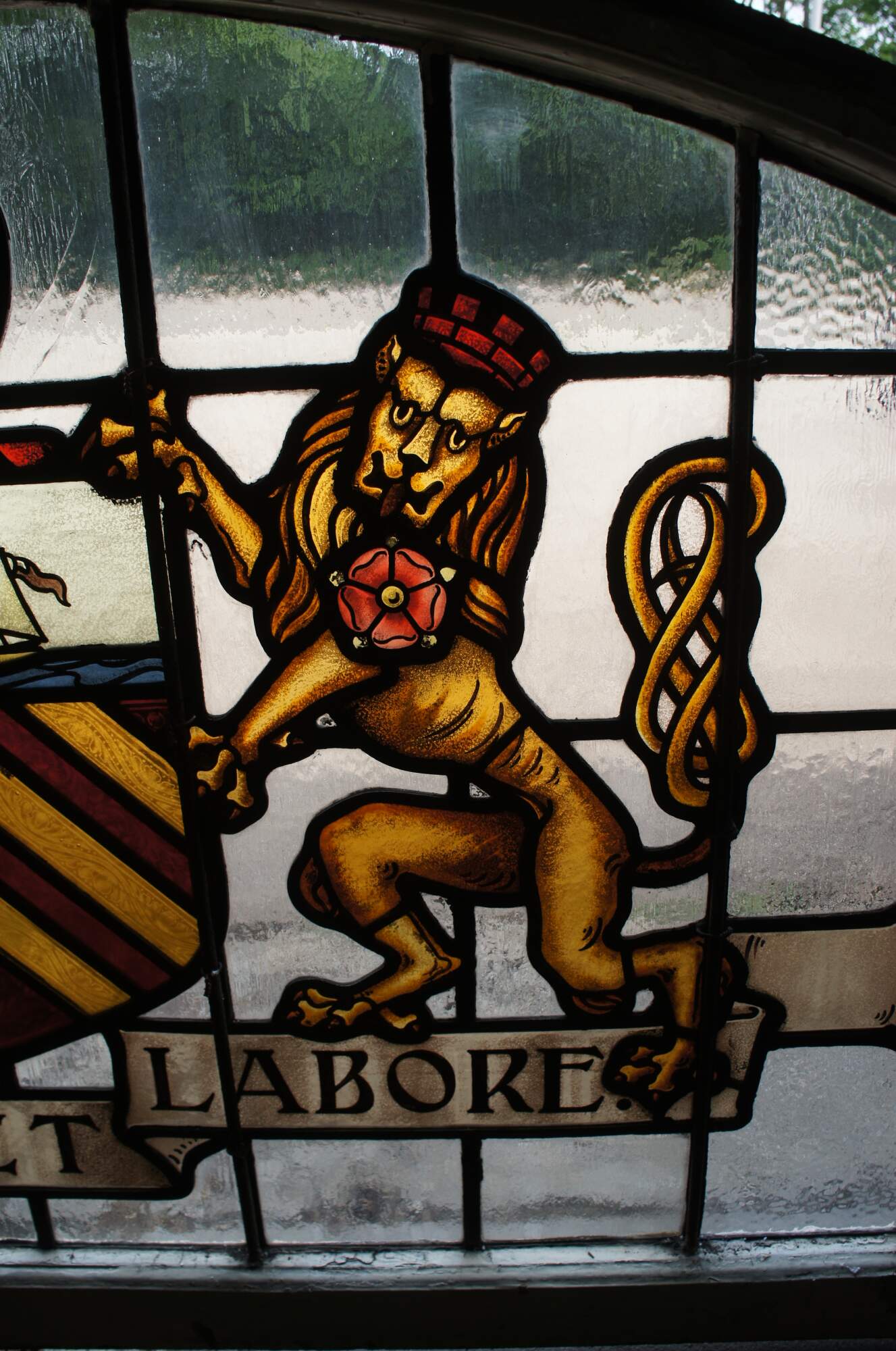 • Either side of the shield are an antelope and a lion, derived from the arms of King Henry IV, which can be seen from the red Lancaster rose on their shoulders