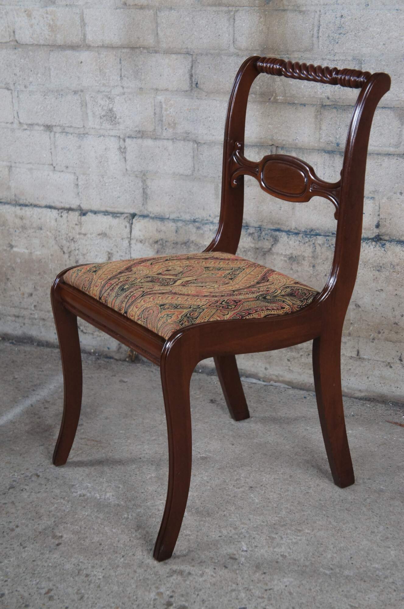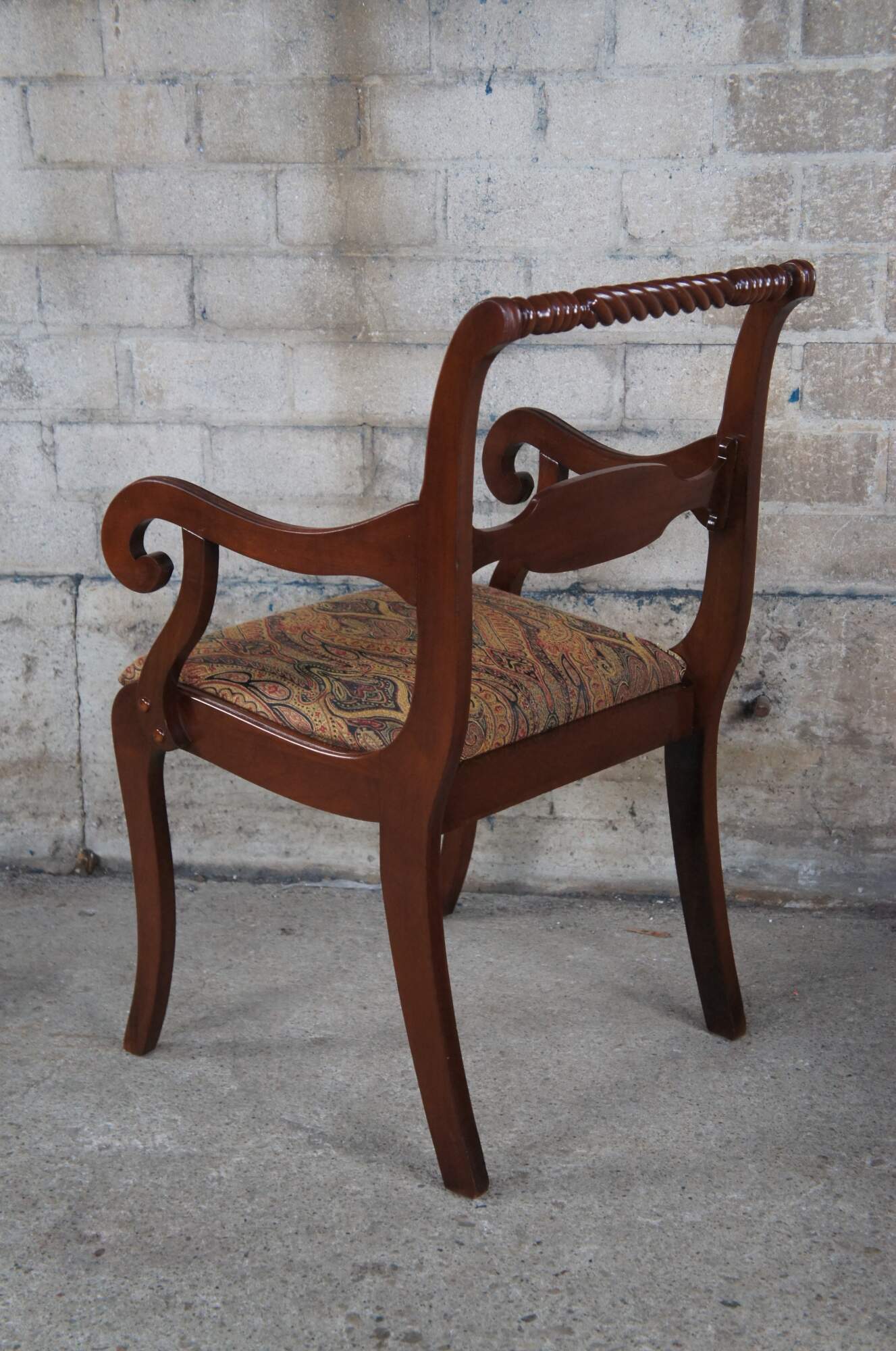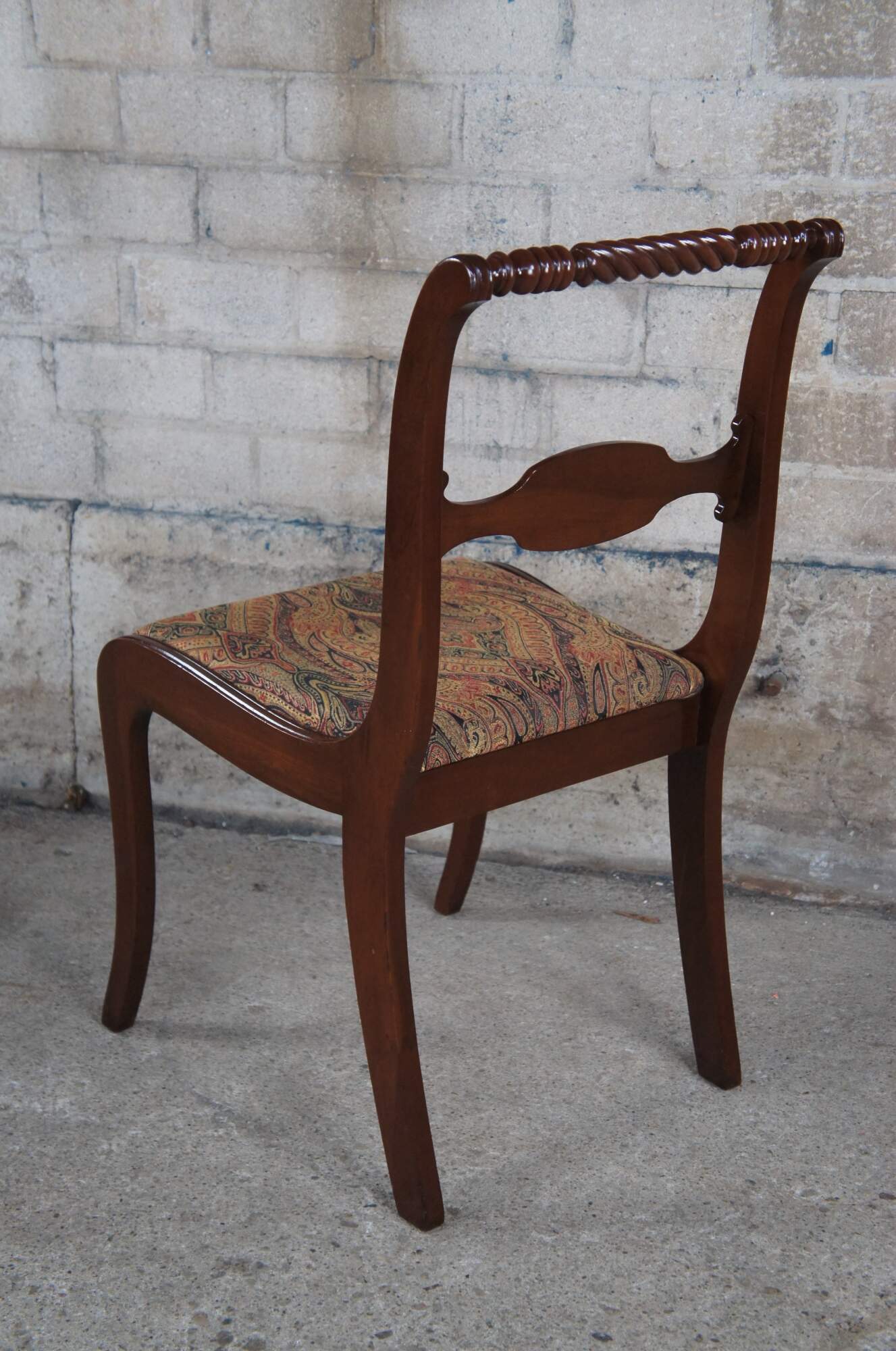 Set of six Antique Styled by Park dining chairs. Made of cherry featuring an open back design with barley twisted and fluted accents and paisley seat.