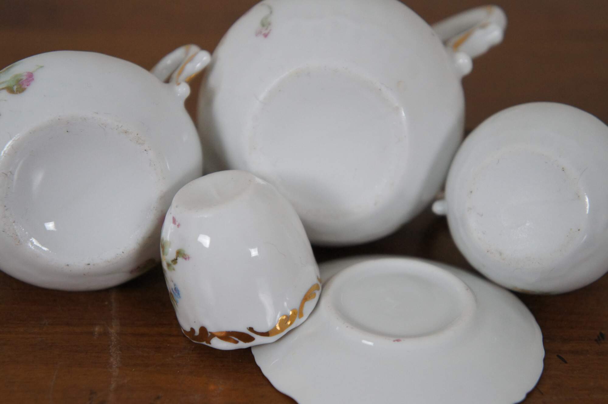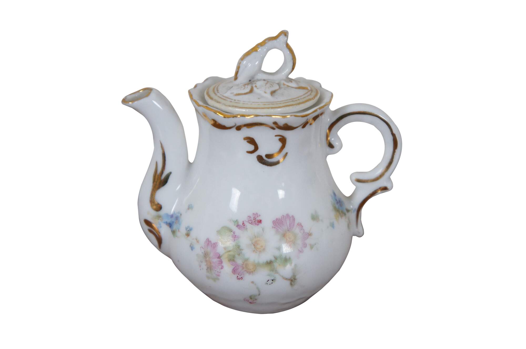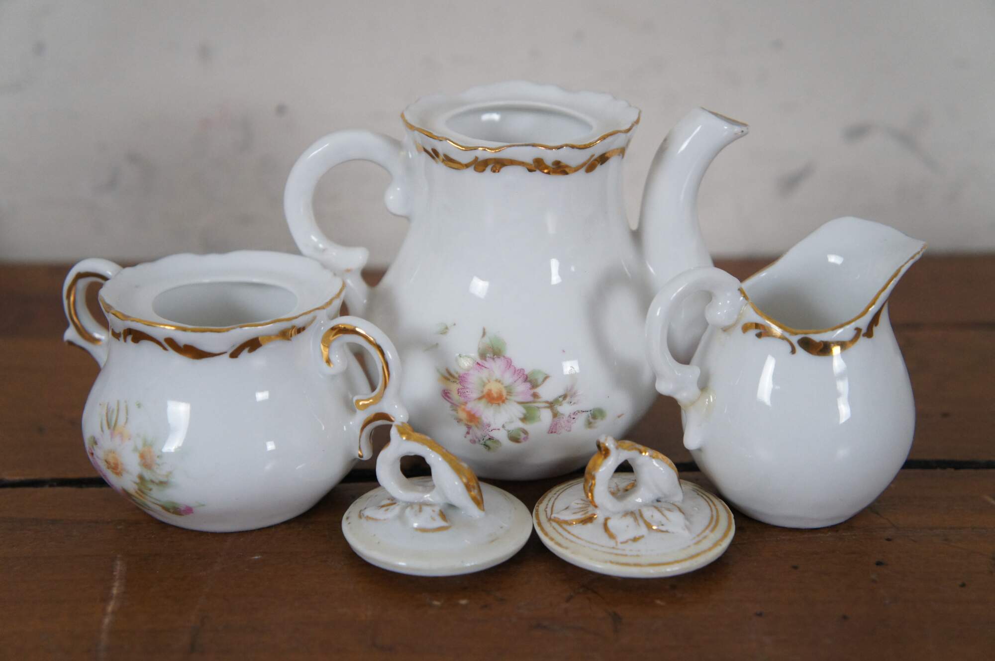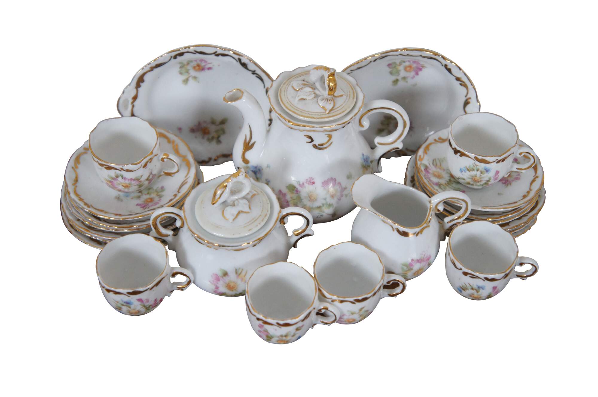 Early 20th century child’s miniature / dollhouse porcelain tea set featuring gently scalloped edges with gilded foliate accents and a printed pattern of pink and white daisies and blue forget-me-nots. Set includes 2 serving plates, 6 dessert plates, 6 saucers, 6 teacups, teapot with lid, sugar bowl with lid, and creamer.