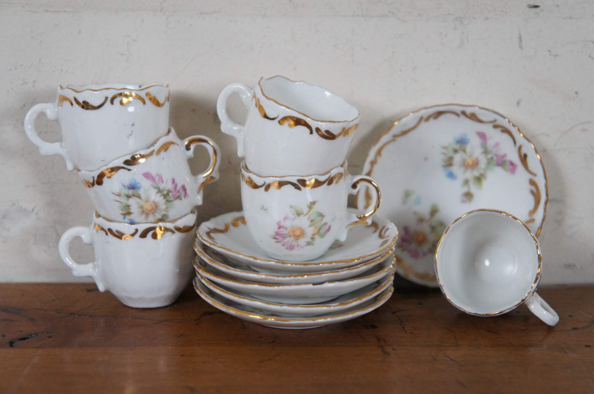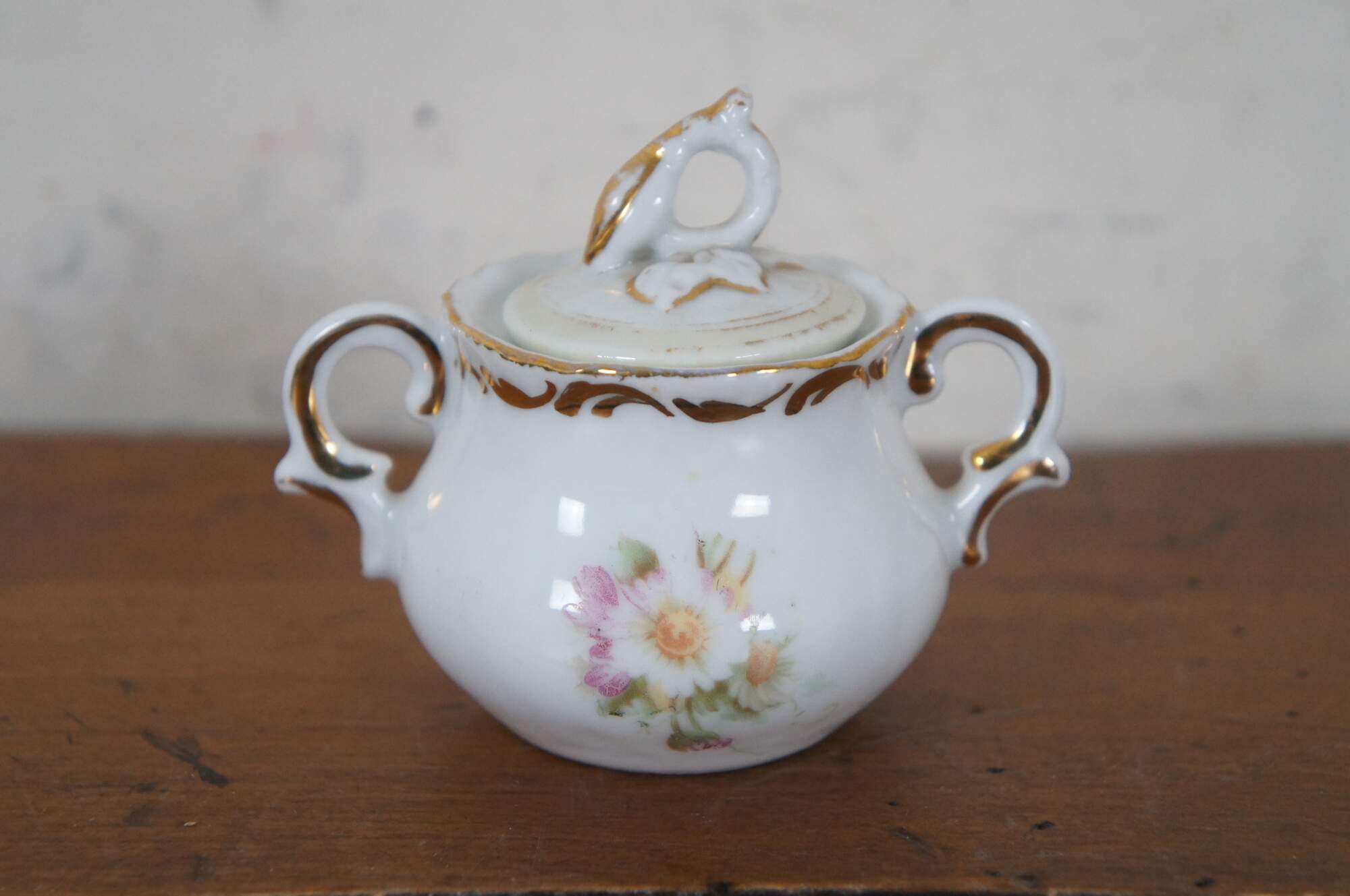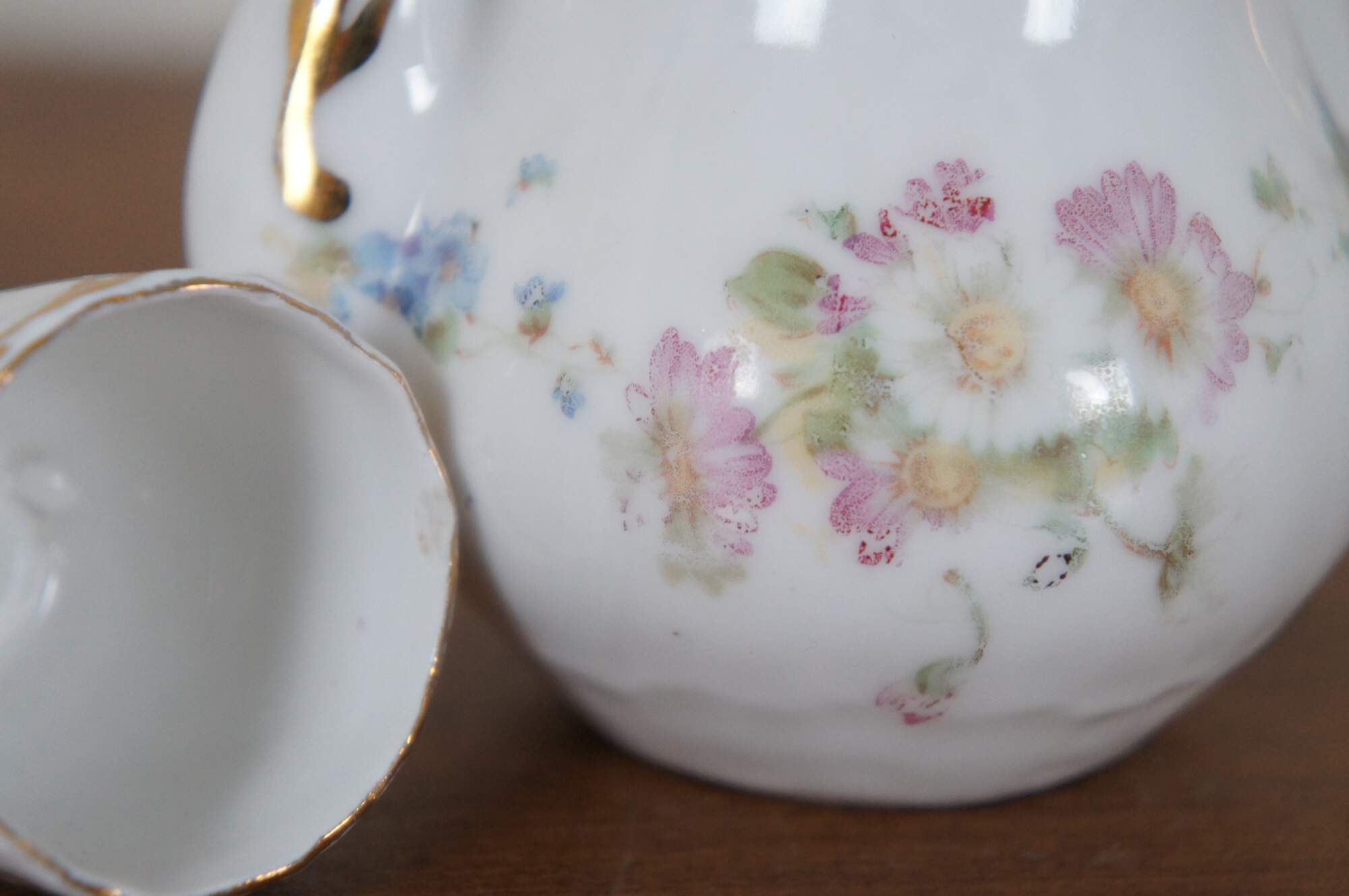 Early 20th century child’s miniature / dollhouse porcelain tea set featuring gently scalloped edges with gilded foliate accents and a printed pattern of pink and white daisies and blue forget-me-nots. Set includes 2 serving plates, 6 dessert plates, 6 saucers, 6 teacups, teapot with lid, sugar bowl with lid, and creamer.