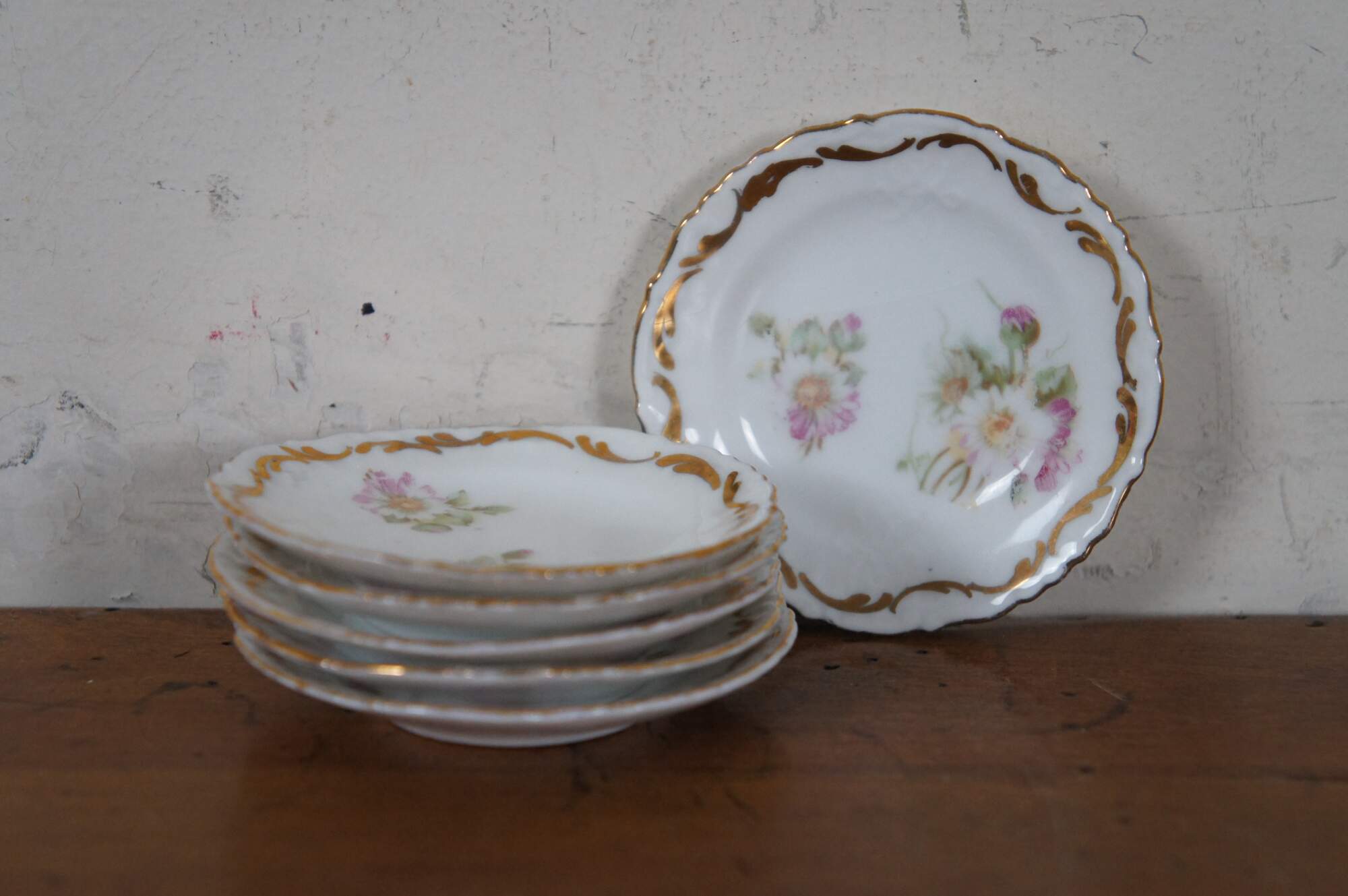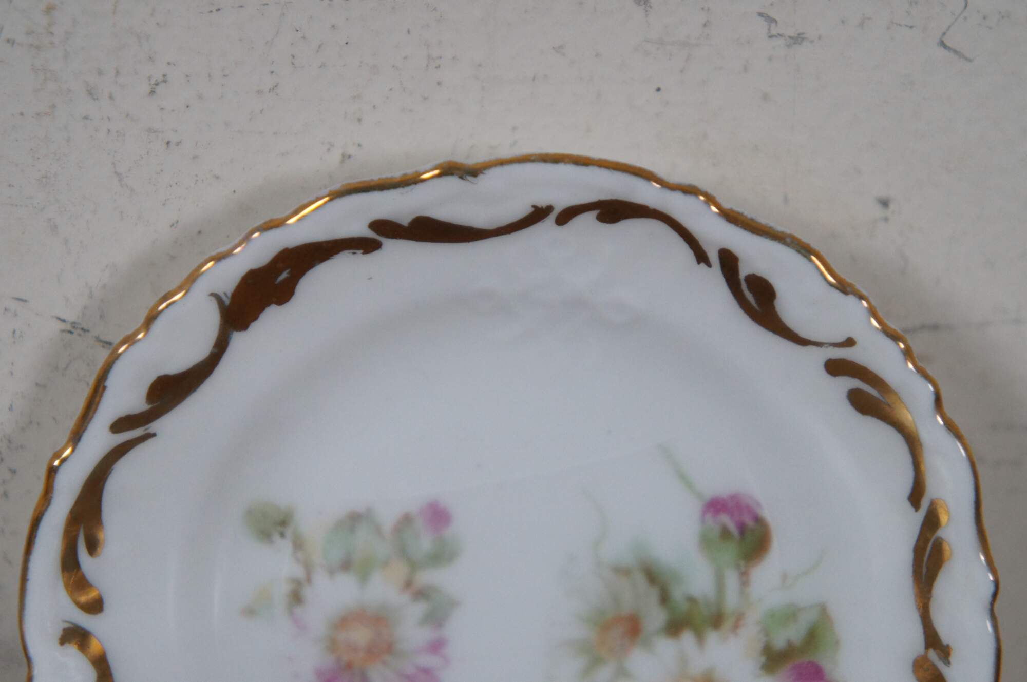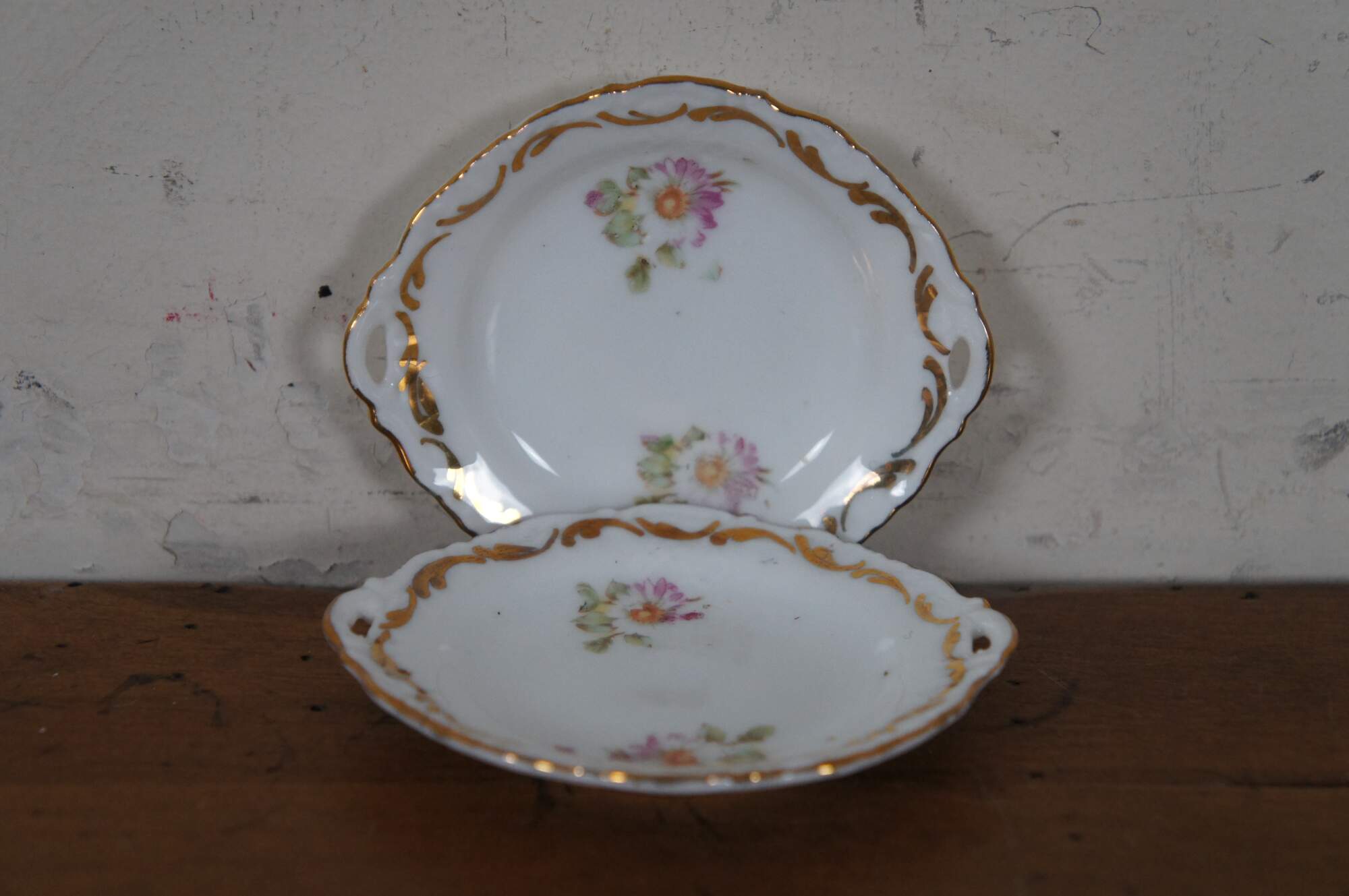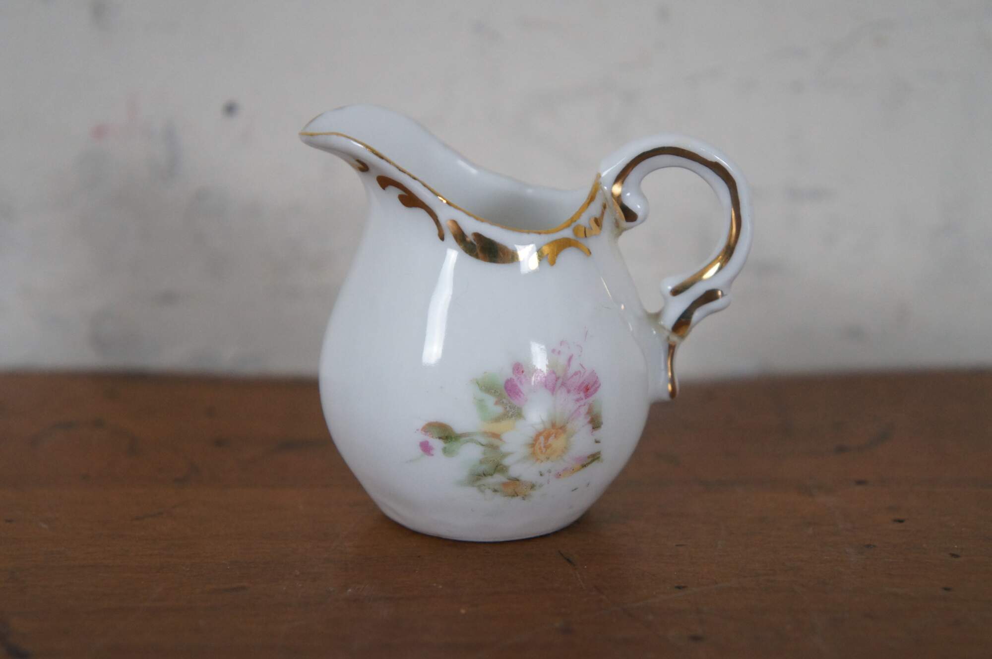 Early 20th century child’s miniature / dollhouse porcelain tea set featuring gently scalloped edges with gilded foliate accents and a printed pattern of pink and white daisies and blue forget-me-nots. Set includes 2 serving plates, 6 dessert plates, 6 saucers, 6 teacups, teapot with lid, sugar bowl with lid, and creamer.