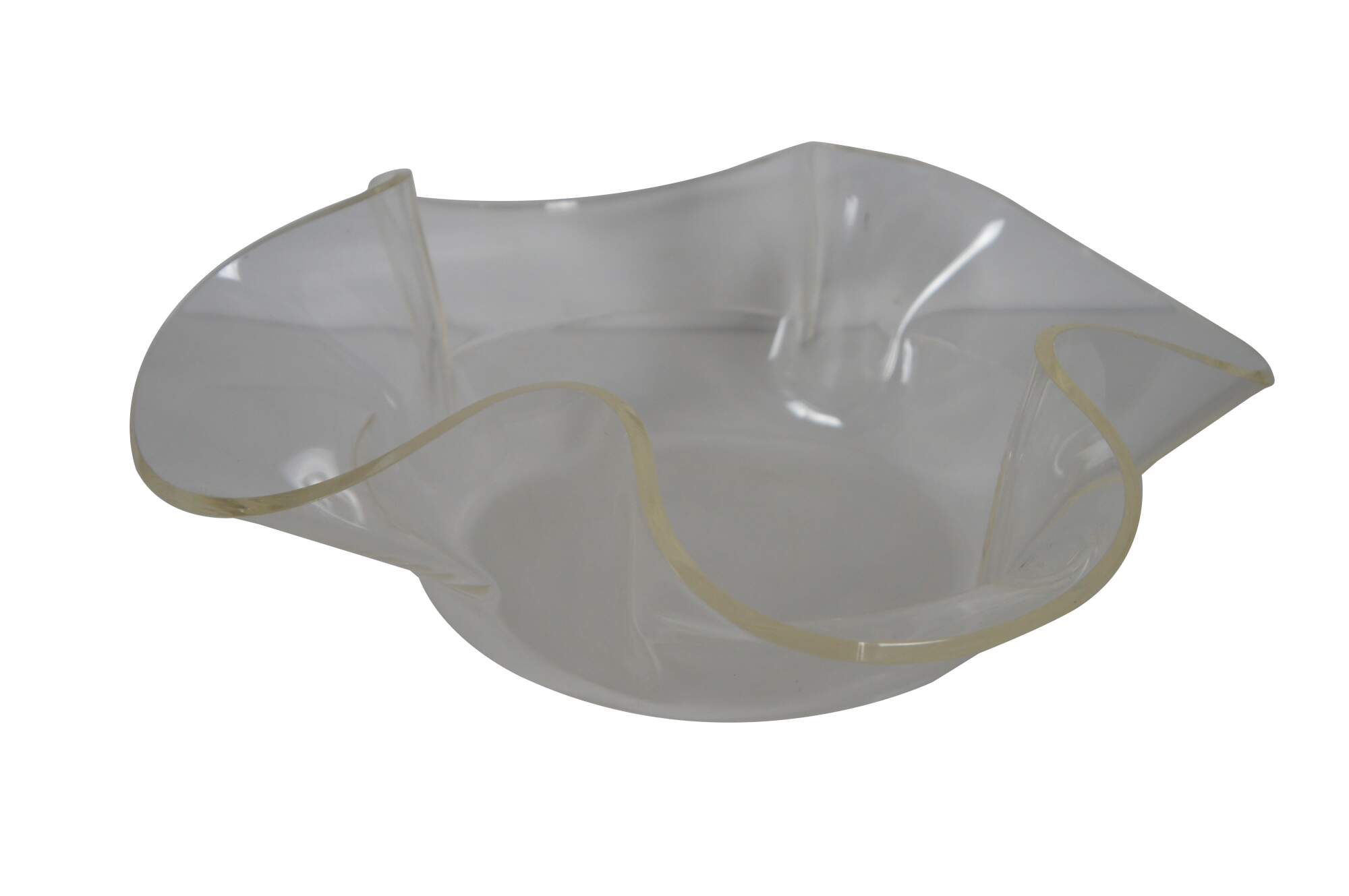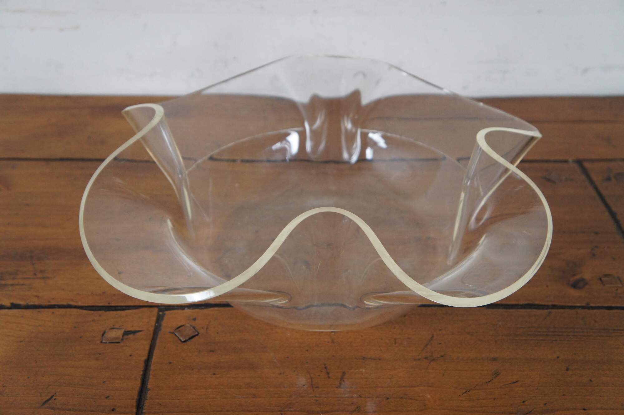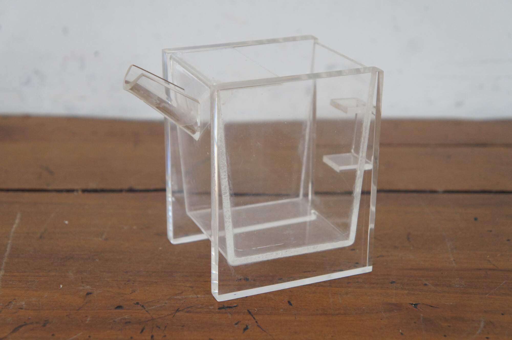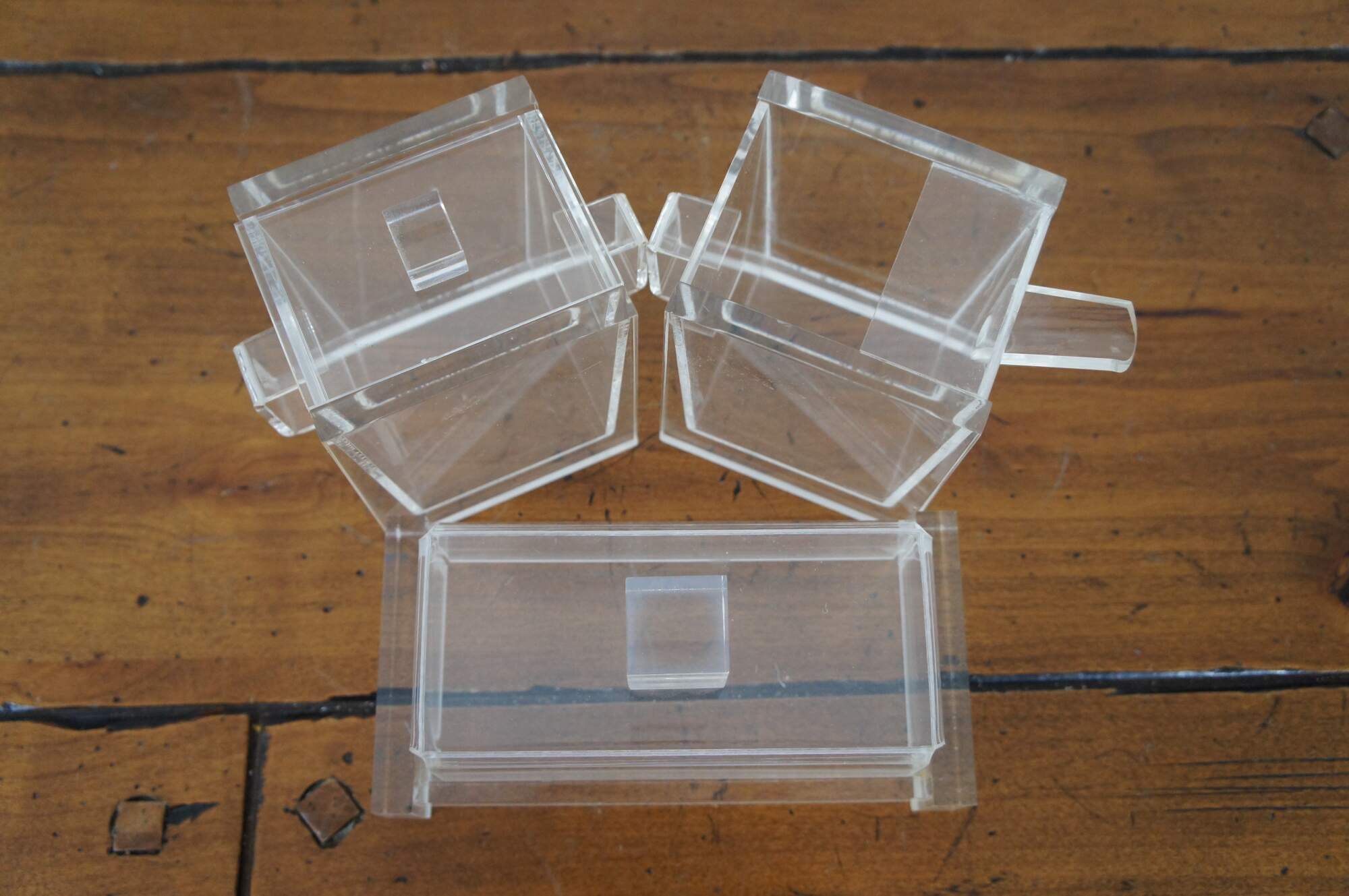 Mid century serving set crafted of clear lucite / acrylic, including one fruit bowl / centerpiece, butter dish with lid, sugar bowl with lid and cream pitcher. The fruit bowl features a rounded shape with pinched / free form sides. The other pieces feature an angular cubic geometric shapes.
