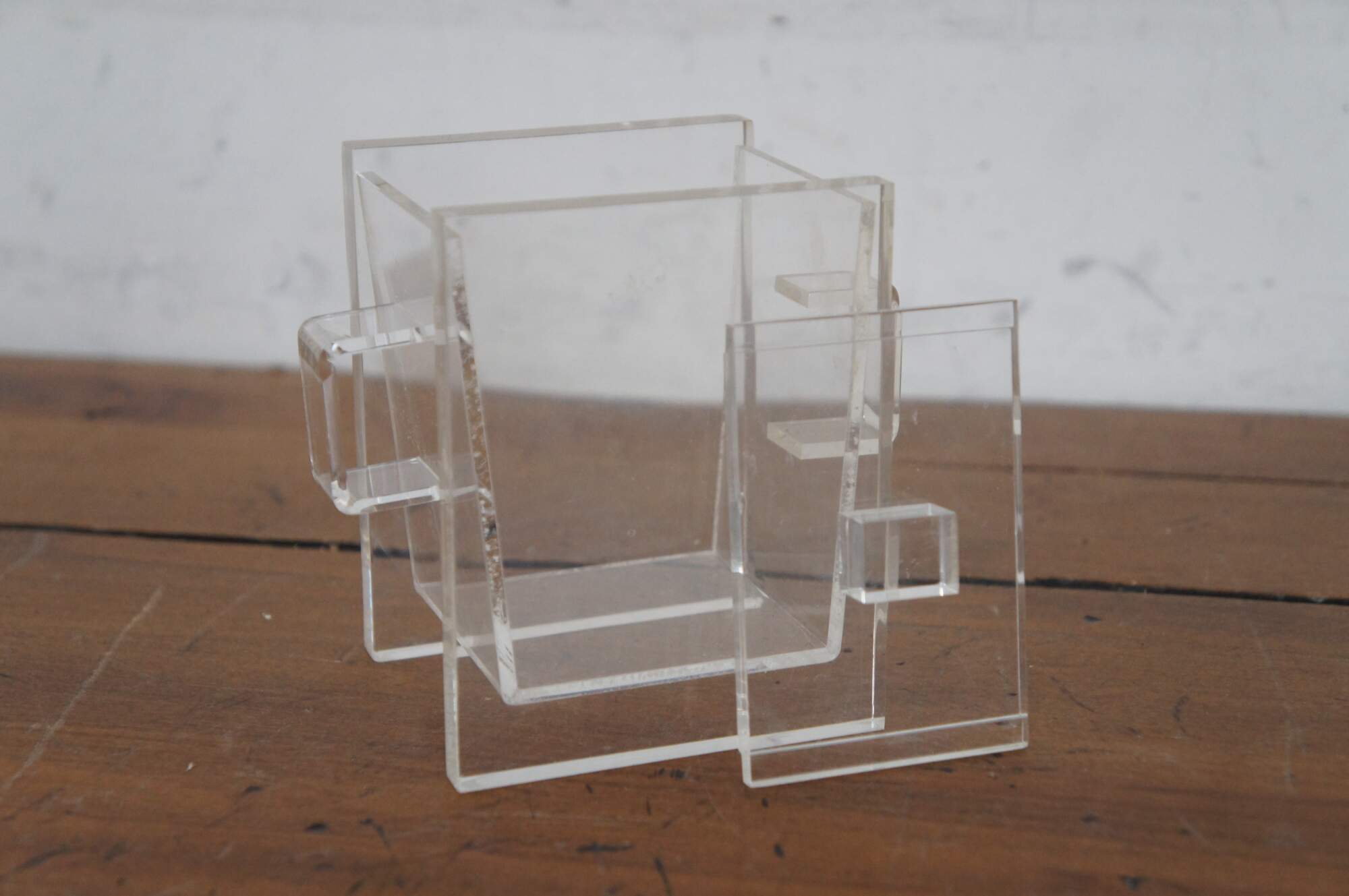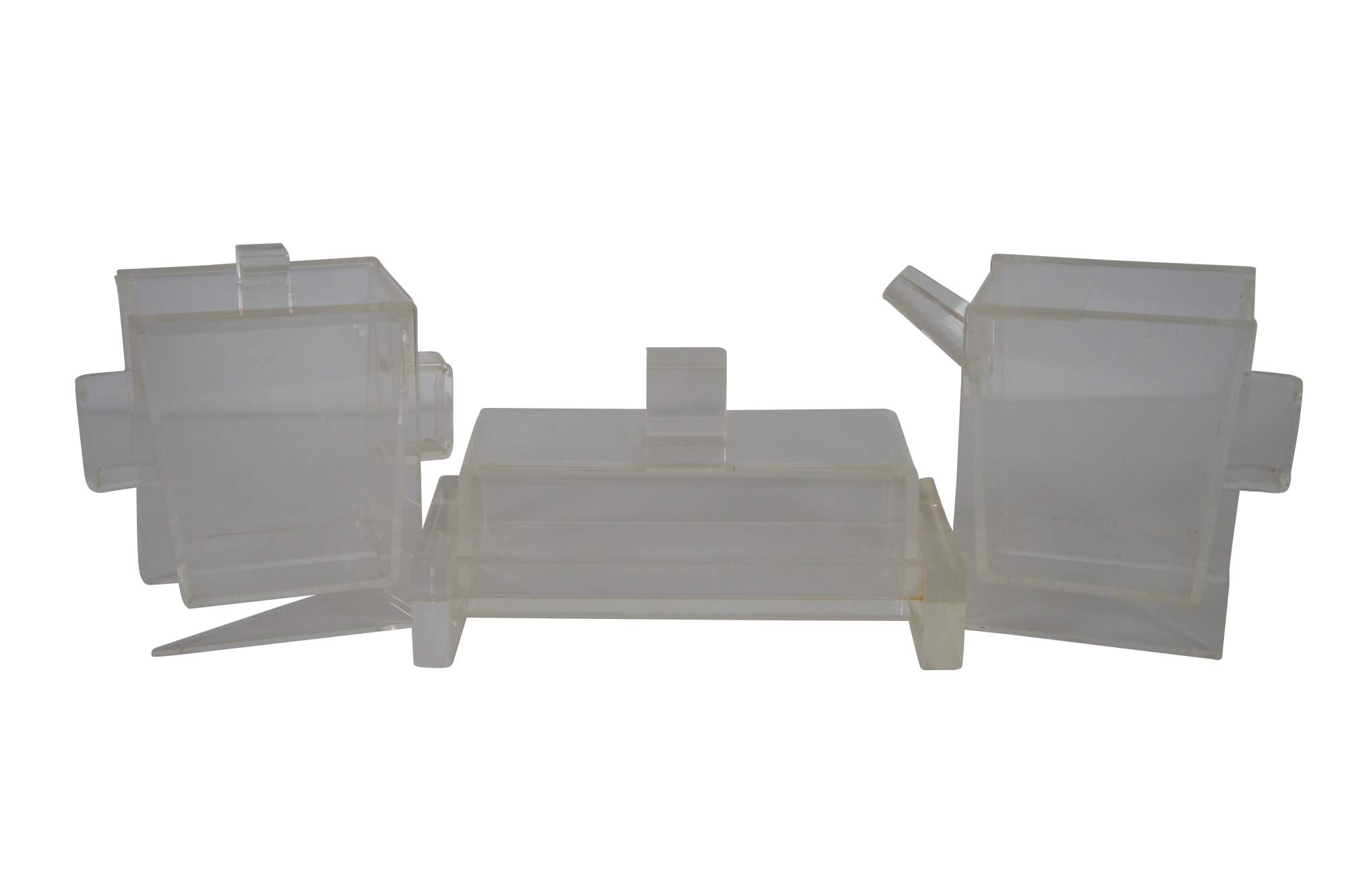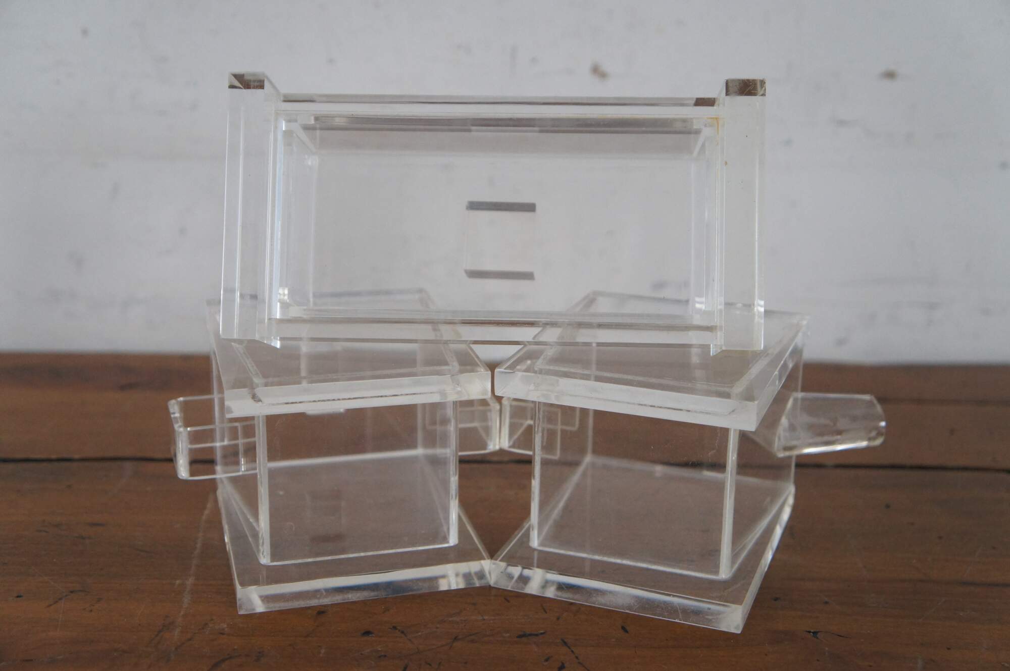 Mid century serving set crafted of clear lucite / acrylic, including one fruit bowl / centerpiece, butter dish with lid, sugar bowl with lid and cream pitcher. The fruit bowl features a rounded shape with pinched / free form sides. The other pieces feature an angular cubic geometric shapes.