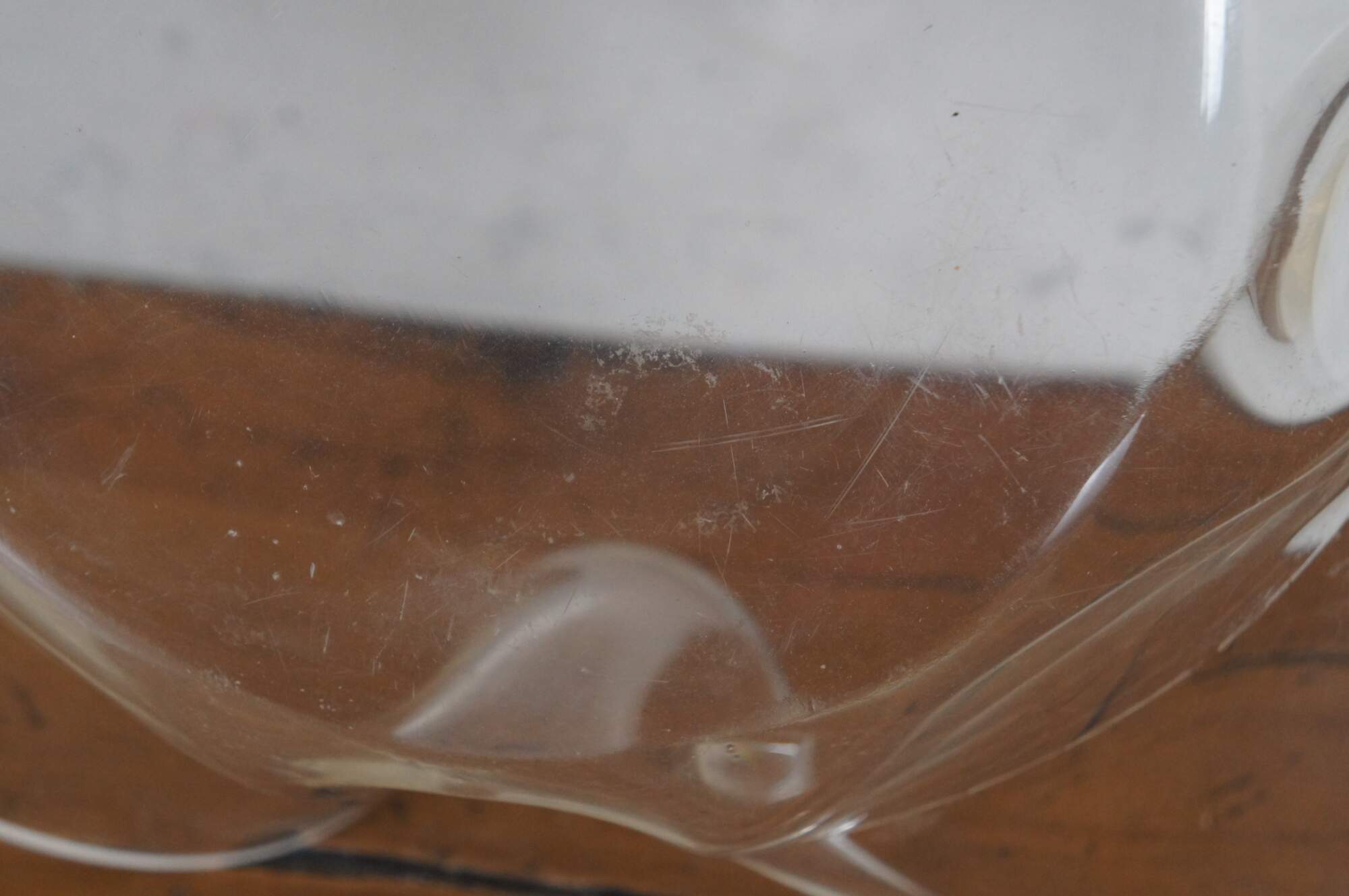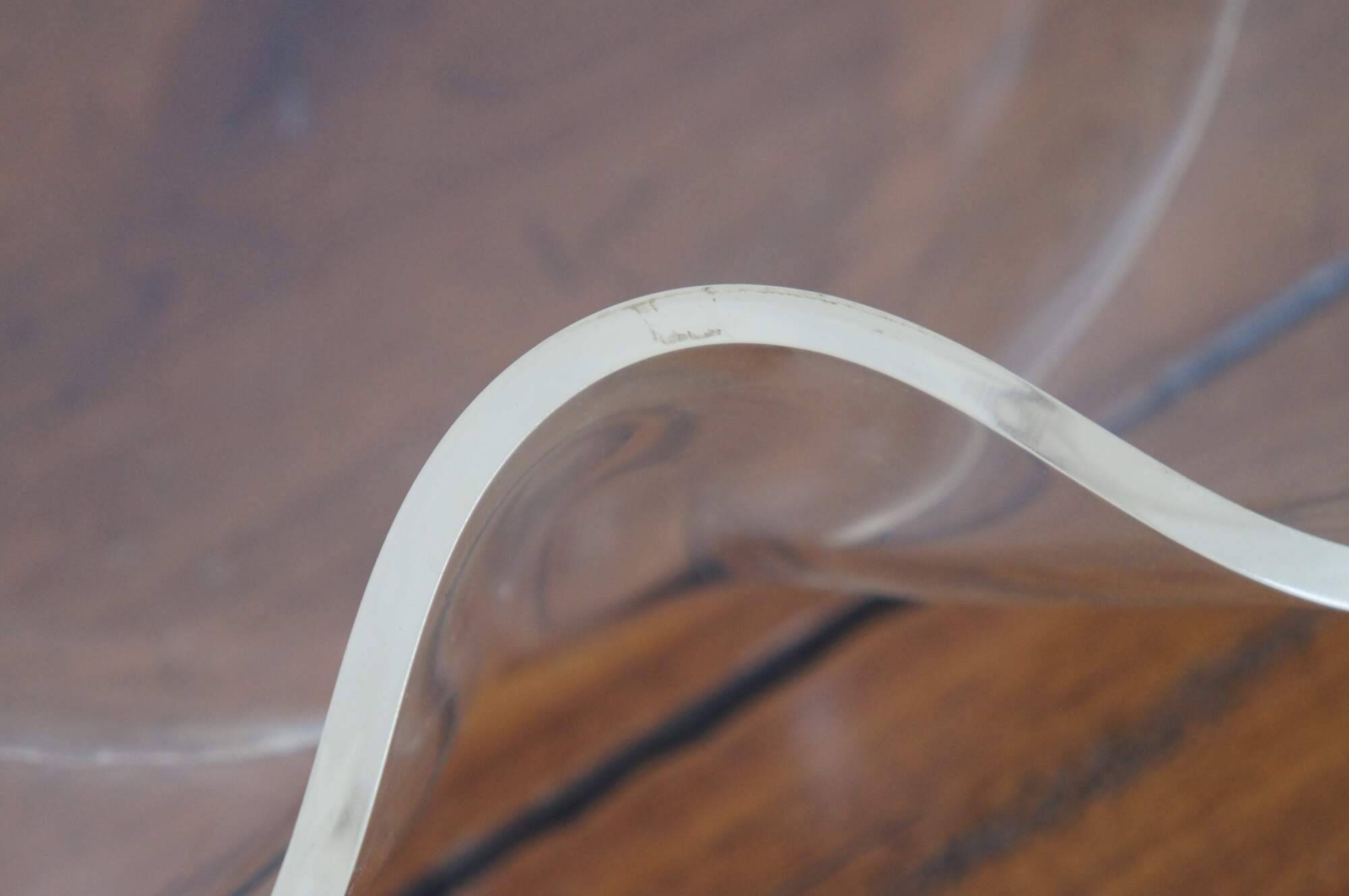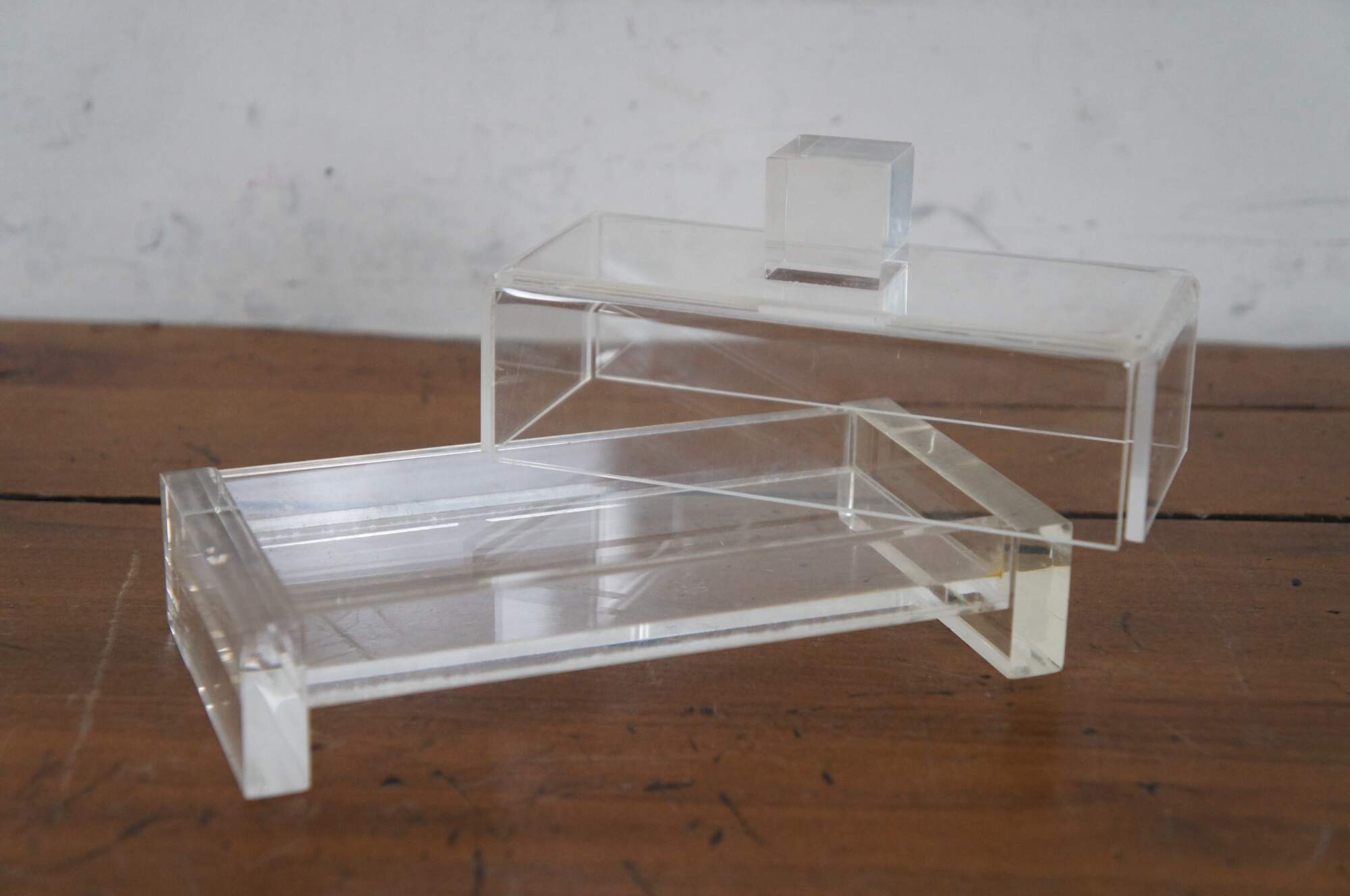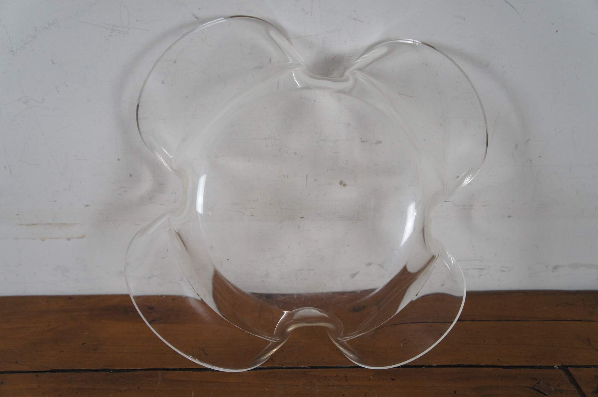 Mid century serving set crafted of clear lucite / acrylic, including one fruit bowl / centerpiece, butter dish with lid, sugar bowl with lid and cream pitcher. The fruit bowl features a rounded shape with pinched / free form sides. The other pieces feature an angular cubic geometric shapes.