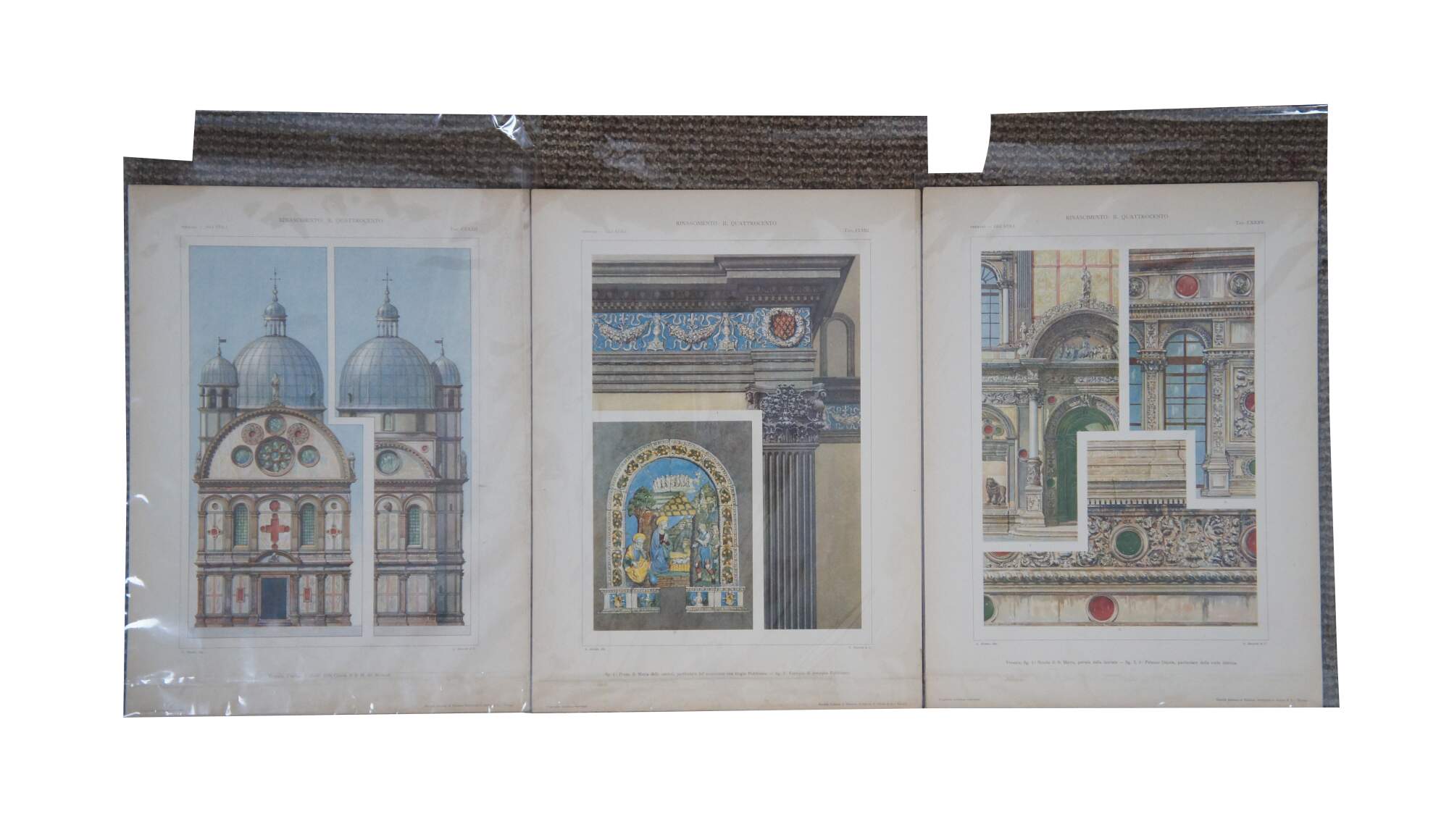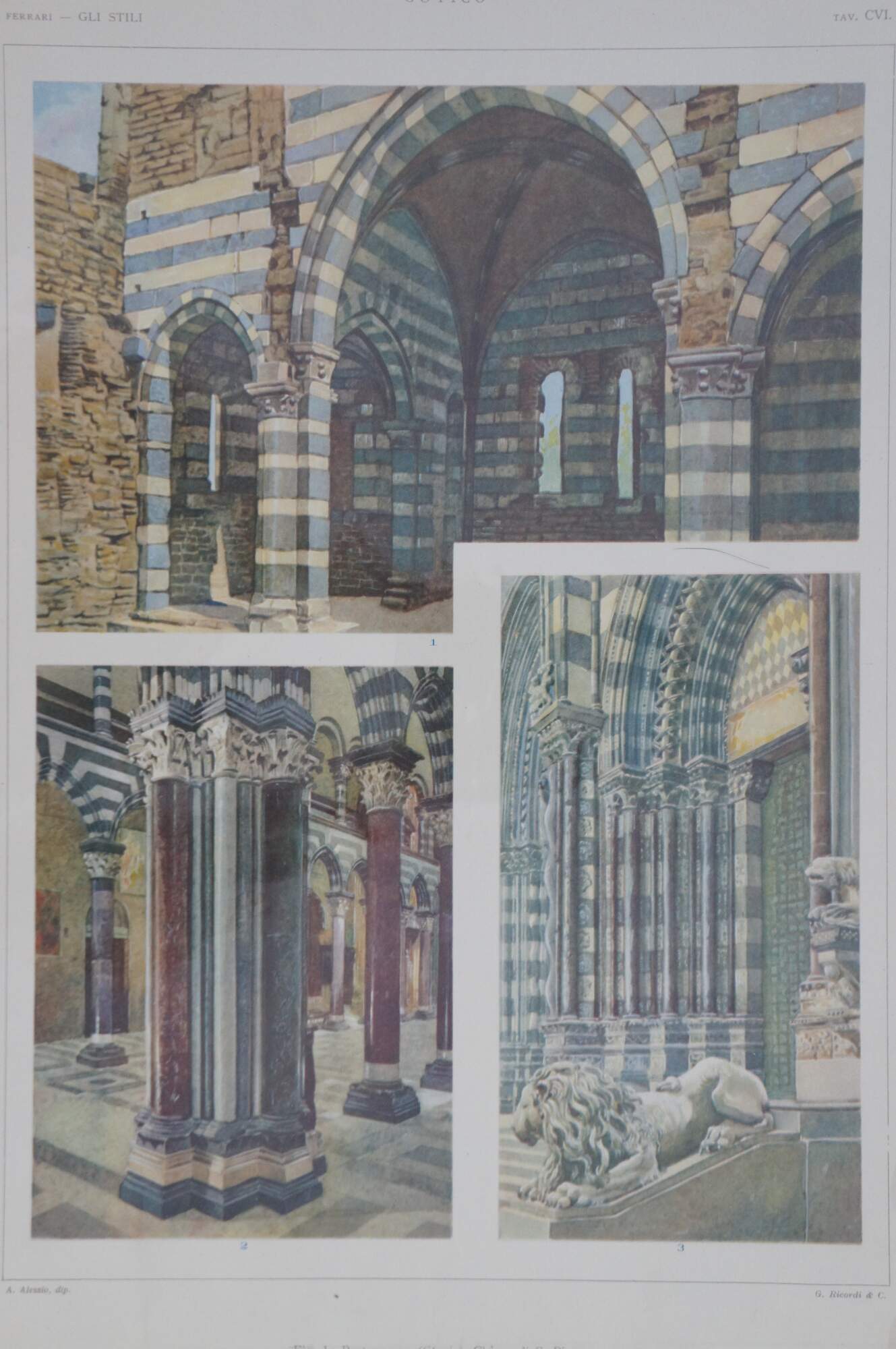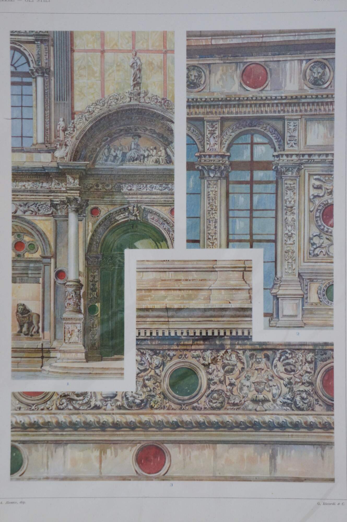 Set of five late 19th century colored Italian architectural etchings from the folio “Gli Stili Nella Forma e Nel Colore – Dalle origini al Rinascimento” (Styles in Shape and Color – From the origins to the Renaissance) by Giulio Ferrari. Engraved by A. Alessio. Published by G. Ricordi & C. of Milan. Copyright by Societa Italiana di Edizioni Artistiche C. Crudo & C. - Torino (Italian Society of Artistic Publishing C. Crudo & C. - Turin)