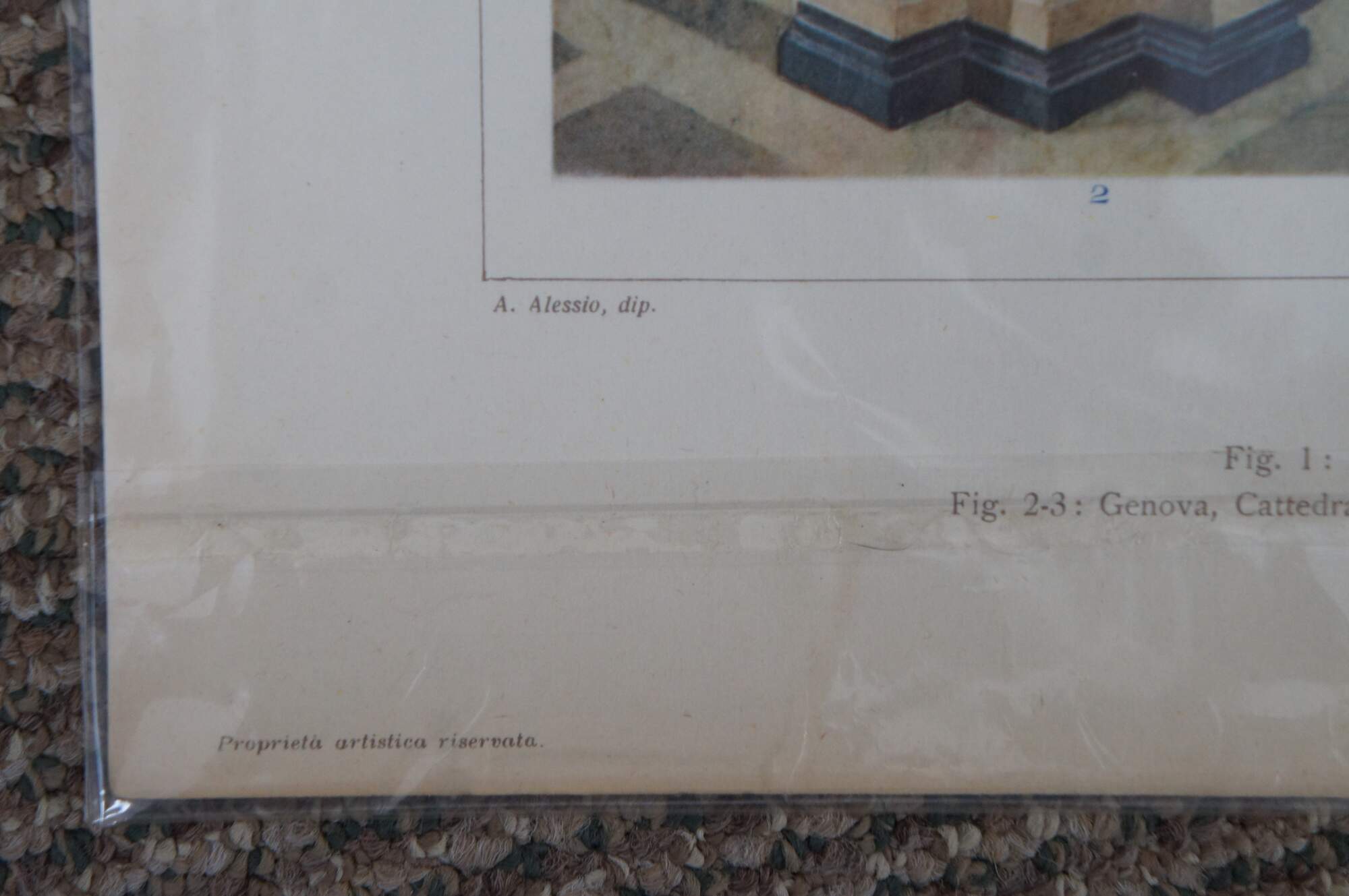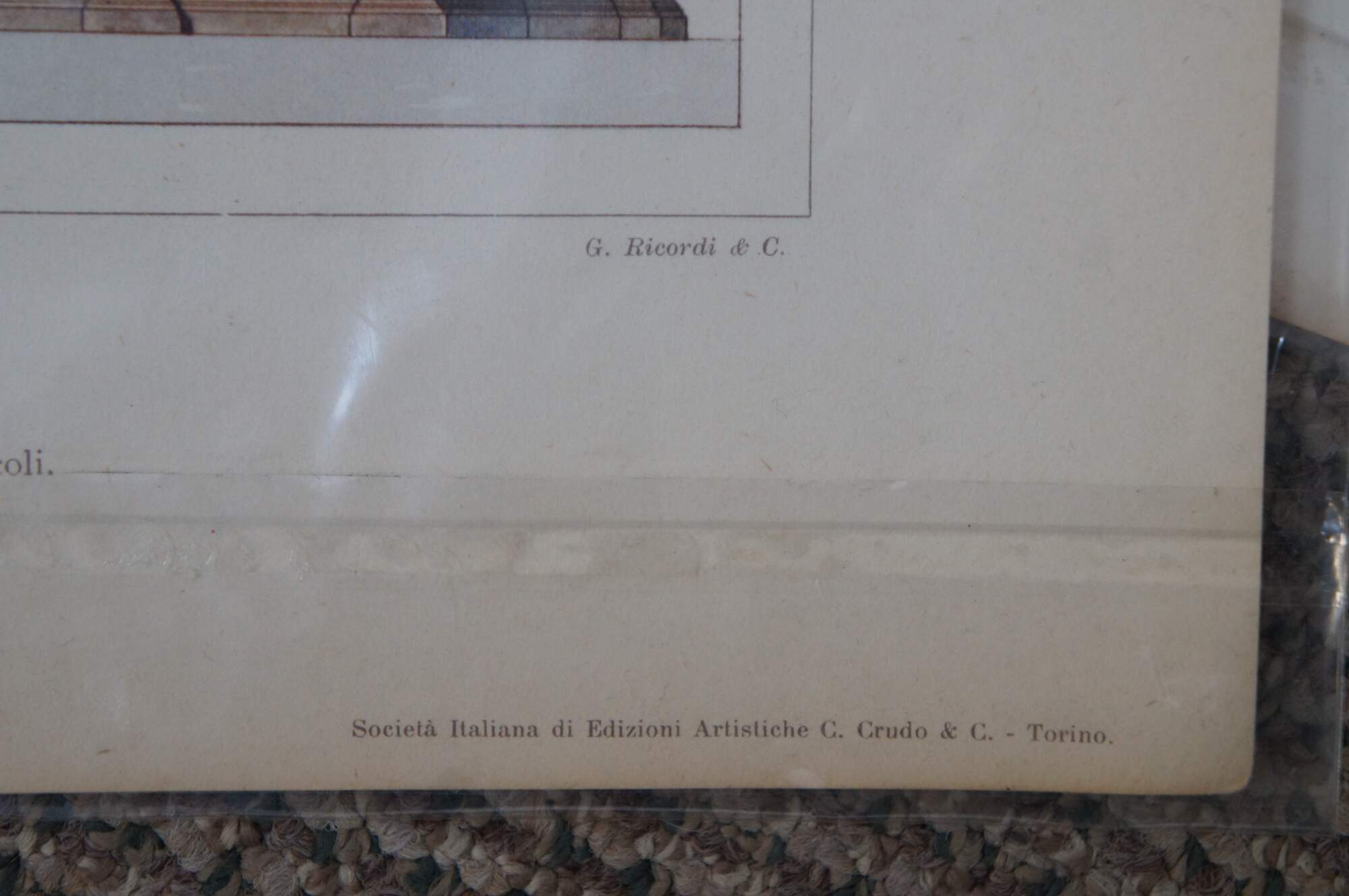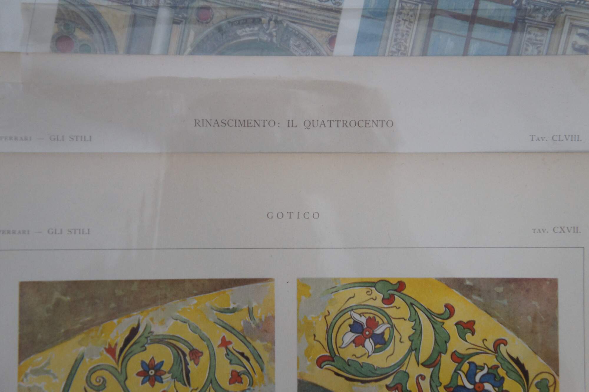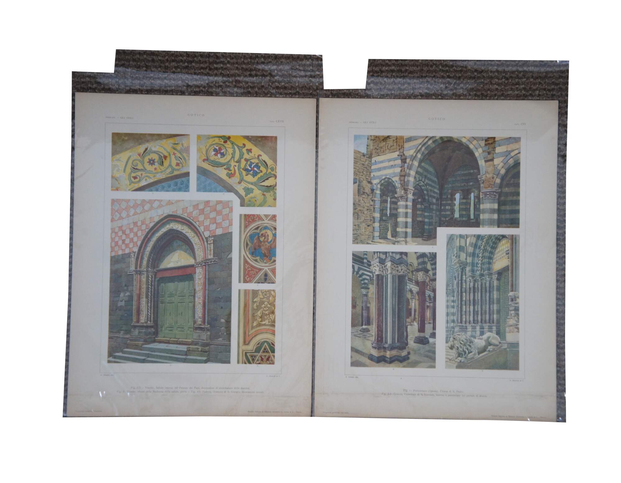 Set of five late 19th century colored Italian architectural etchings from the folio “Gli Stili Nella Forma e Nel Colore – Dalle origini al Rinascimento” (Styles in Shape and Color – From the origins to the Renaissance) by Giulio Ferrari. Engraved by A. Alessio. Published by G. Ricordi & C. of Milan. Copyright by Societa Italiana di Edizioni Artistiche C. Crudo & C. - Torino (Italian Society of Artistic Publishing C. Crudo & C. - Turin)