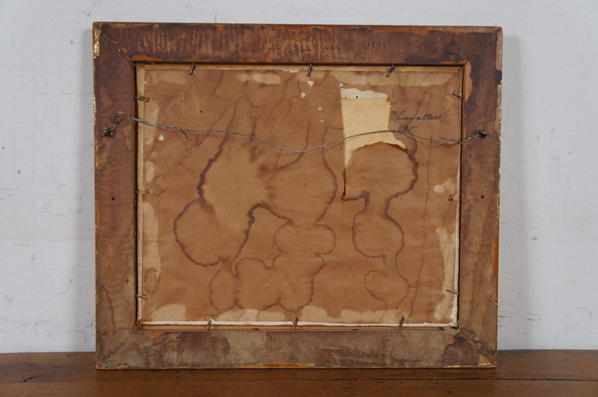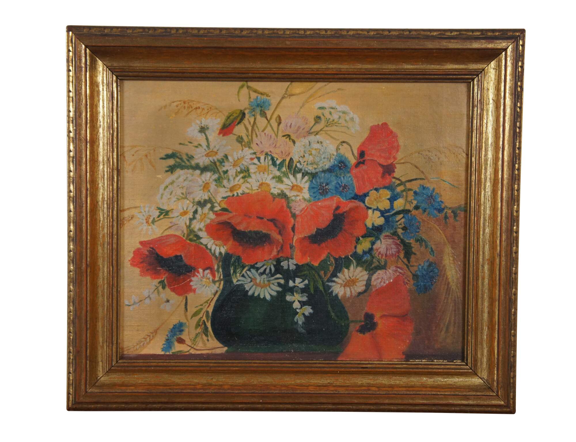 Antique floral bouquet oil painting on canvas by American folk artist Irene Showalter of Versailles Ohio, circa 1935. The still life scene features a grouping of flowers in a vase, framed in gold.