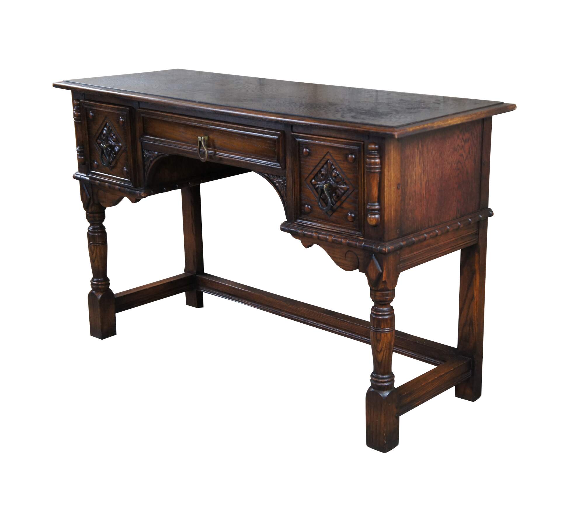 An impressive Spanish Revival dressing table by Saginaw Furniture, circa late 1930s to early 40s. Made from oak with three dovetailed drawers. Features a rectangular frame with intriguing diamond pattern acanthus carved accents with matching spandrels. The stiles are accented by quarter cut turned and applied spindles and raised diamonds over turned legs. Drawer pulls are made from iron with a rustic gold toned finish.