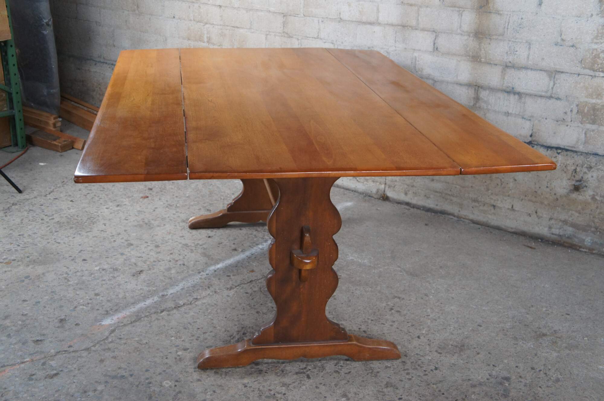 Vintage Cushman Colonial Creation drop leaf country farmhouse dining table. Made of rock maple featuring rectangular form with two large long drop leaves over a serpentine trestle base. A Genuine Cushman Colonial Creation made in Bennington Vermont.