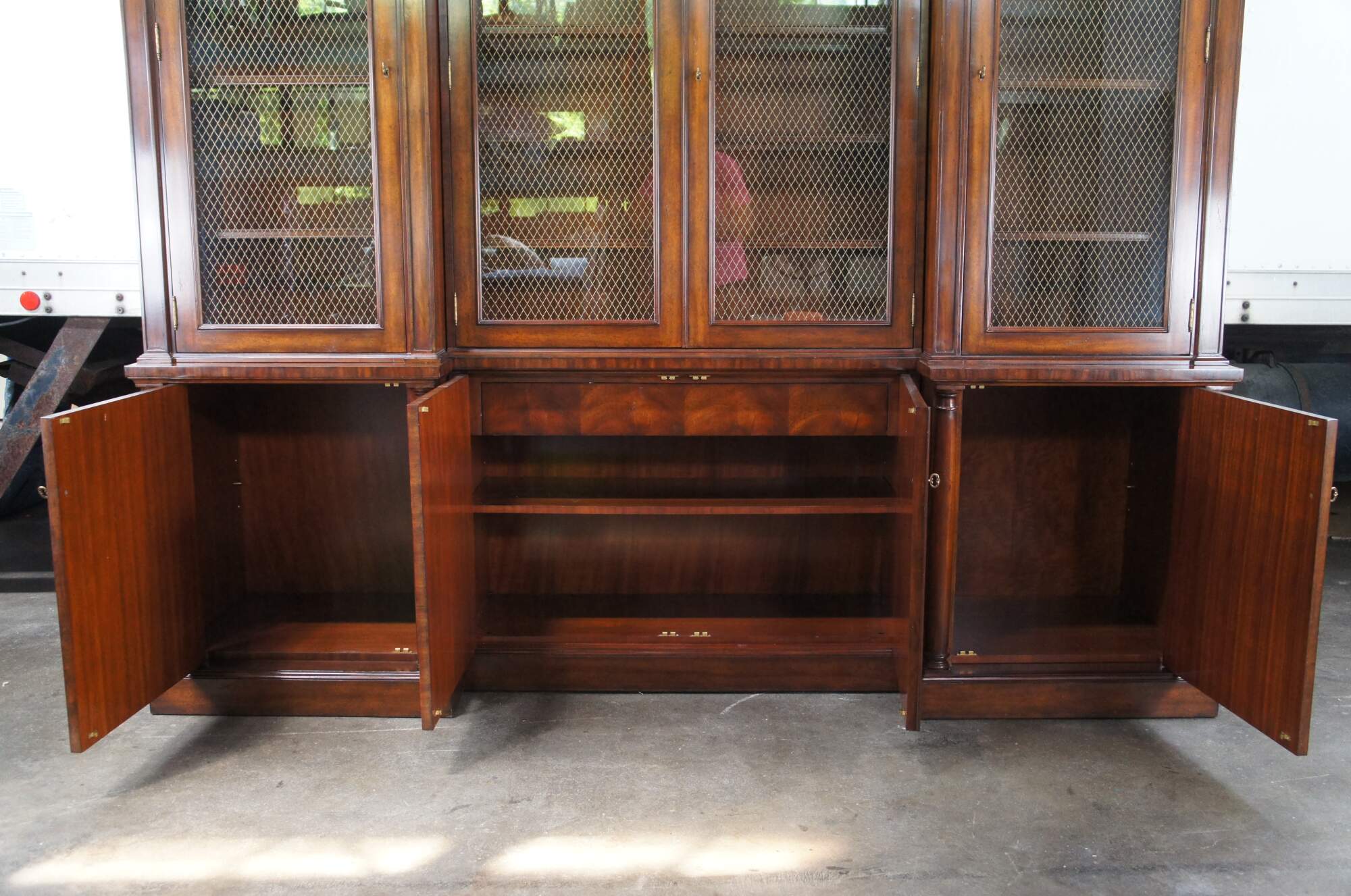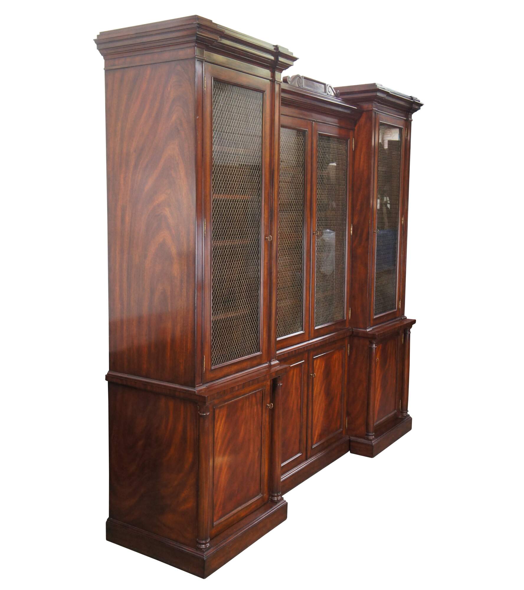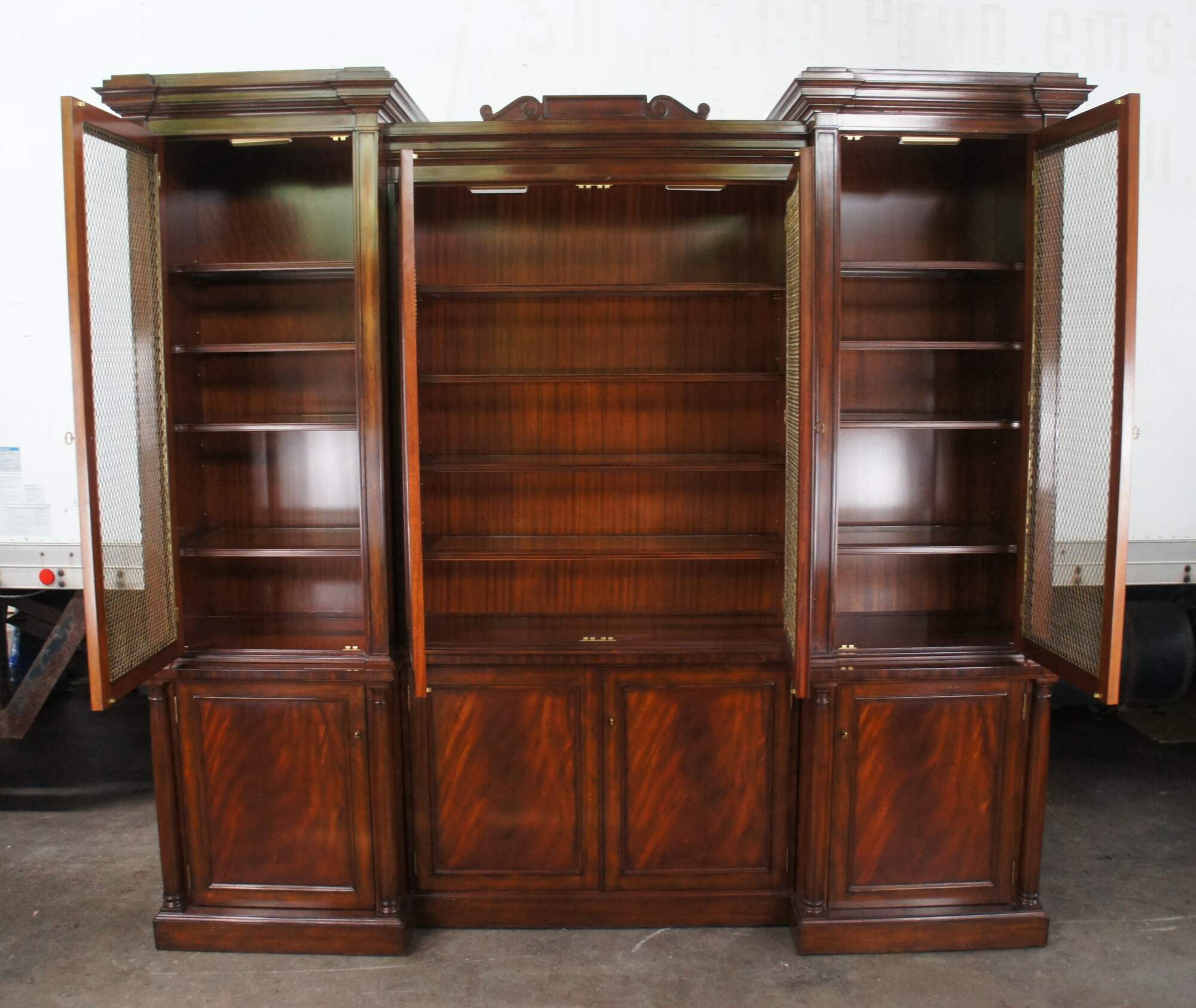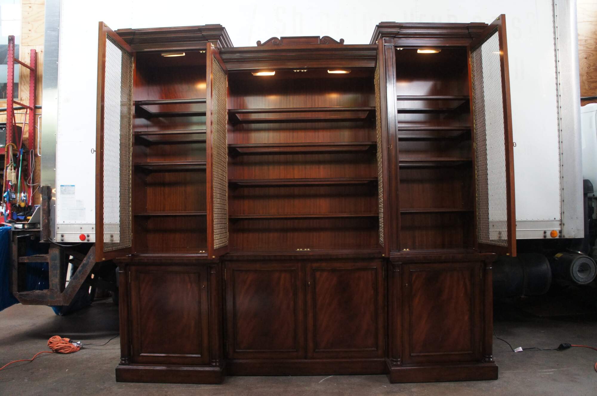 Ralph Laurens Noble Estate Bunching China 1840-22 , circa last quarter 20th century. An exceptional display cabinet drawing inspiration from English Georgian and Chippendale styling. Made from mahogany with two outer cabinets that break forward from the central unit adding depth and dimension. Features an illuminated interior with brass lattice covered doors and wooden shelves with glass inserts. The lower cabints showcase flame mahogany doors flanked by beautifully turned columns. Opens to shelving for additional storage and a silverware drawer. Interior lighting is adjusted to one of three settings by the touch of a button. Lattice brass hinges open for ease of cleaning the glass.