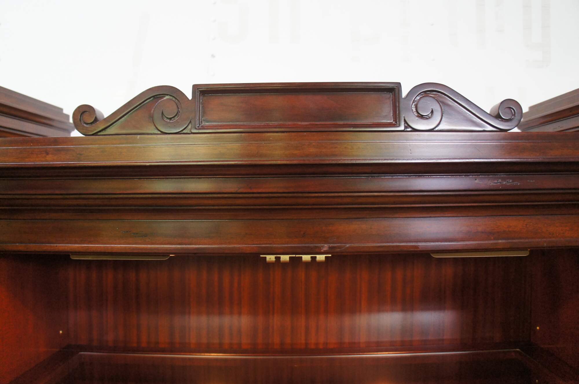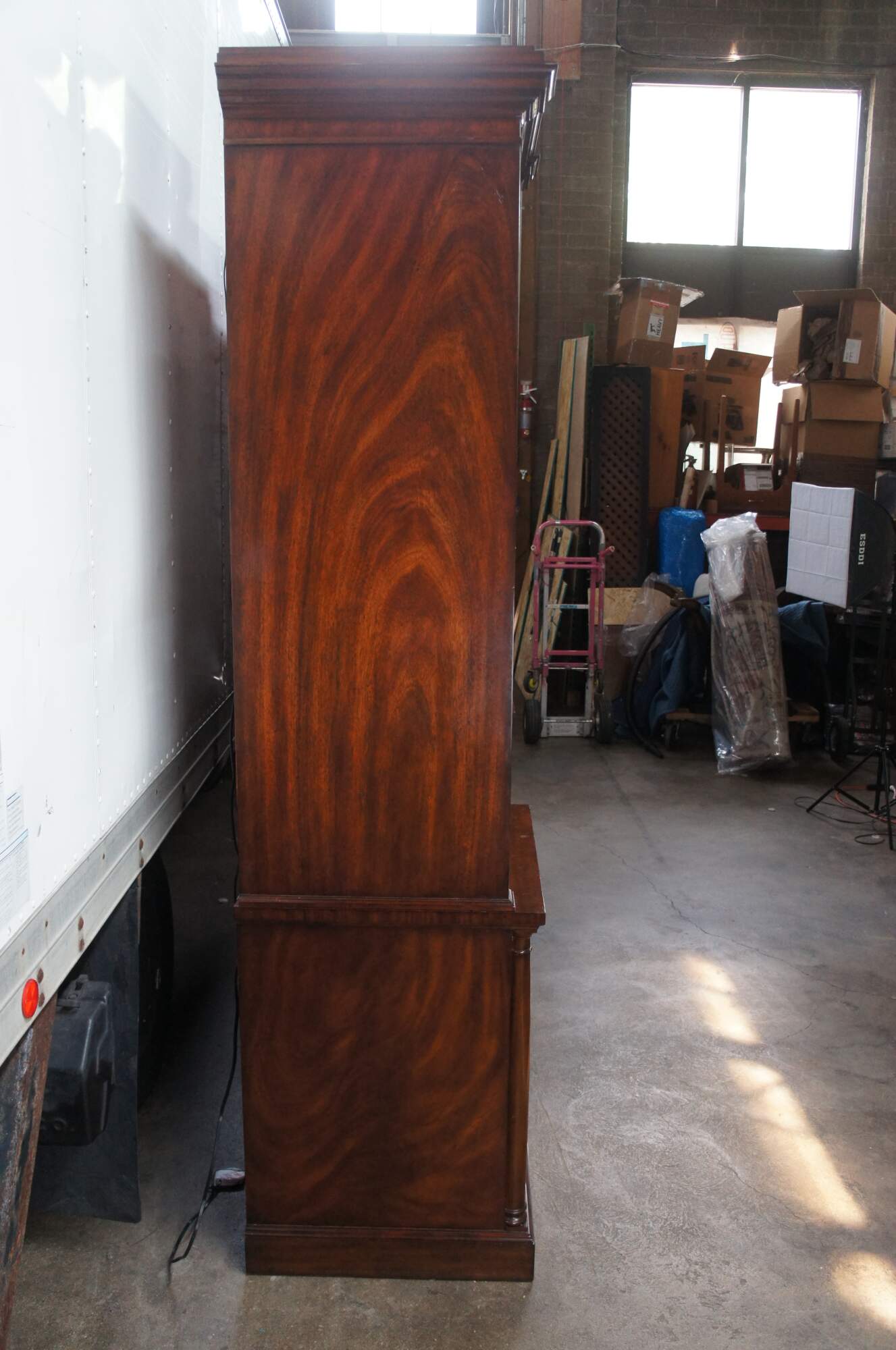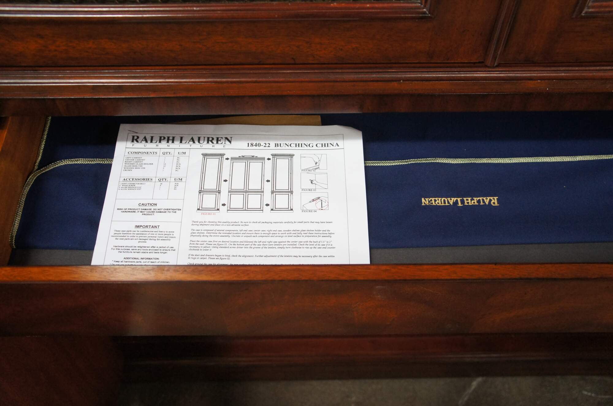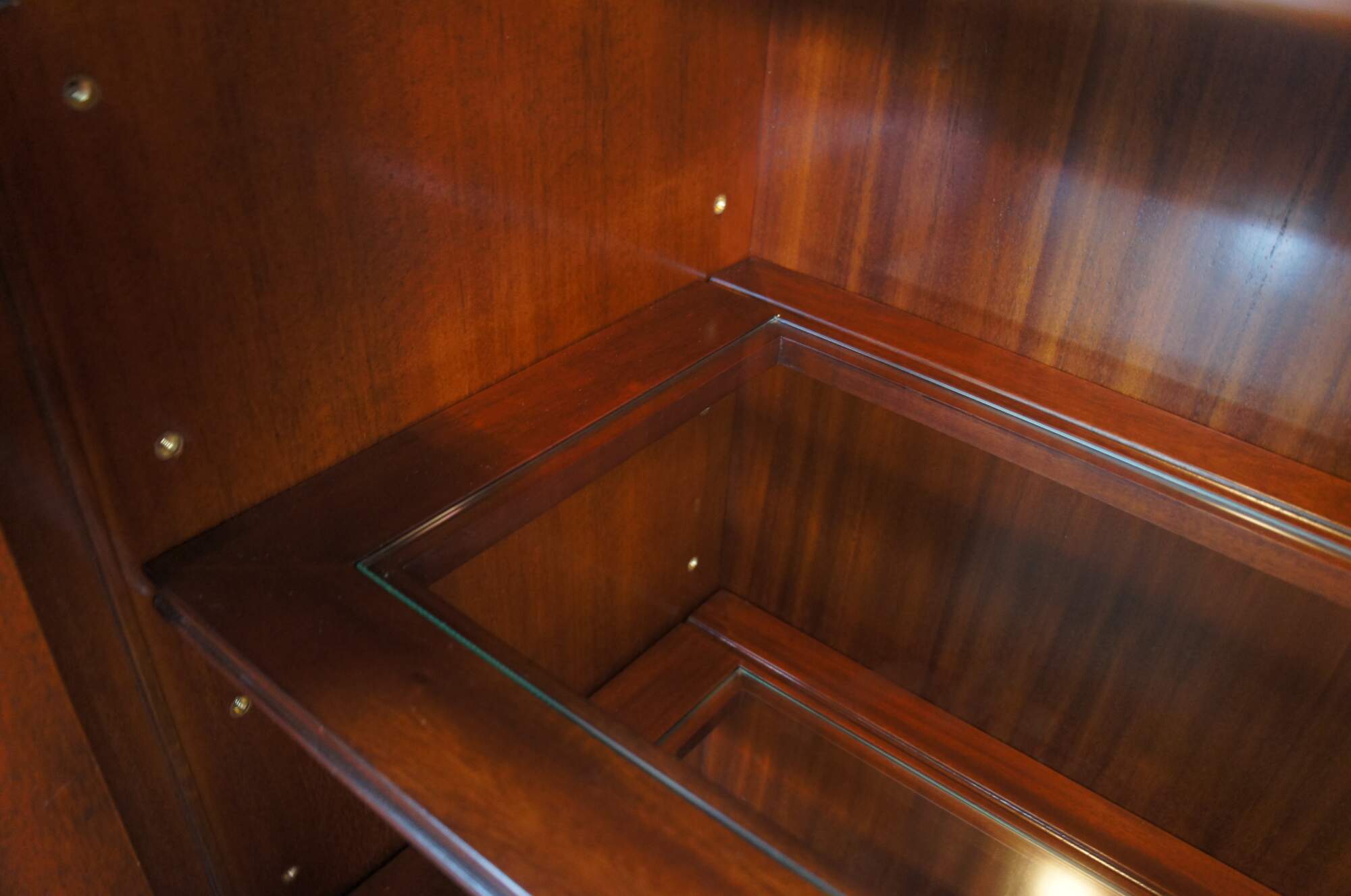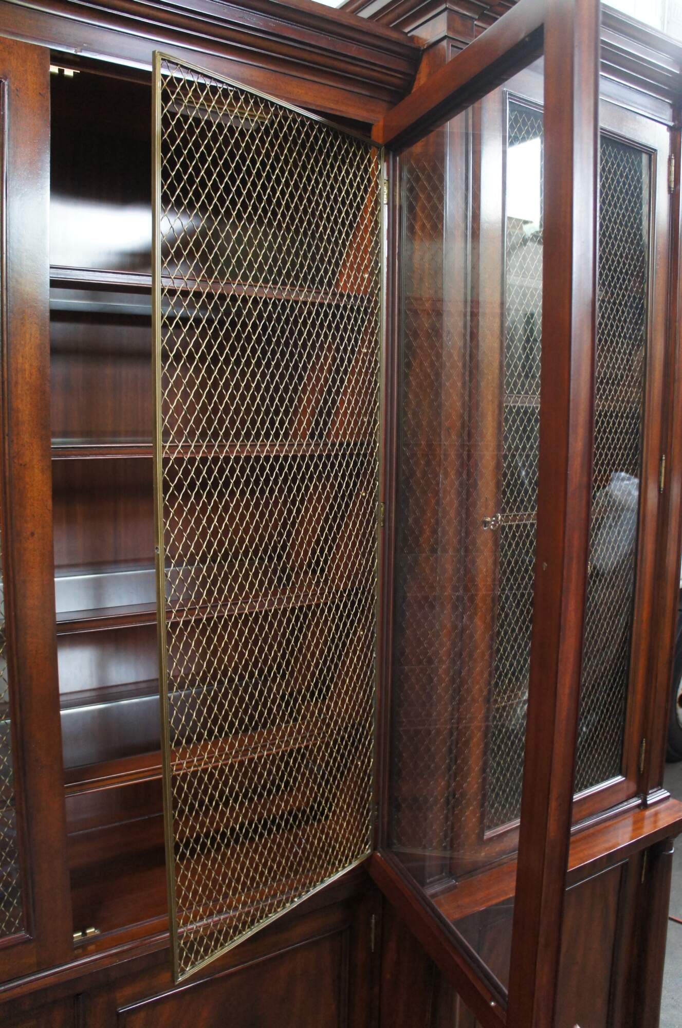 Ralph Laurens Noble Estate Bunching China 1840-22 , circa last quarter 20th century. An exceptional display cabinet drawing inspiration from English Georgian and Chippendale styling. Made from mahogany with two outer cabinets that break forward from the central unit adding depth and dimension. Features an illuminated interior with brass lattice covered doors and wooden shelves with glass inserts. The lower cabints showcase flame mahogany doors flanked by beautifully turned columns. Opens to shelving for additional storage and a silverware drawer. Interior lighting is adjusted to one of three settings by the touch of a button. Lattice brass hinges open for ease of cleaning the glass.