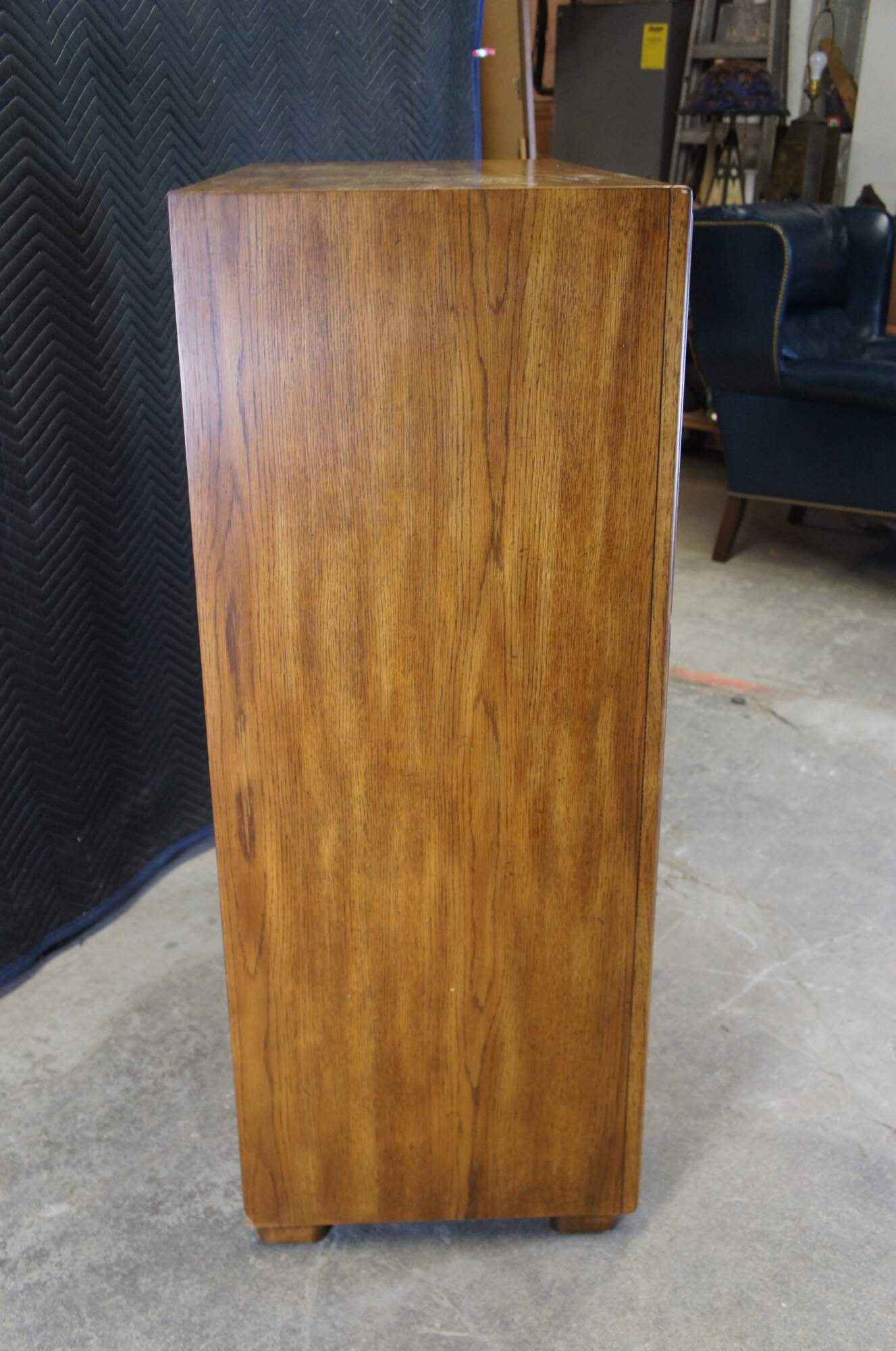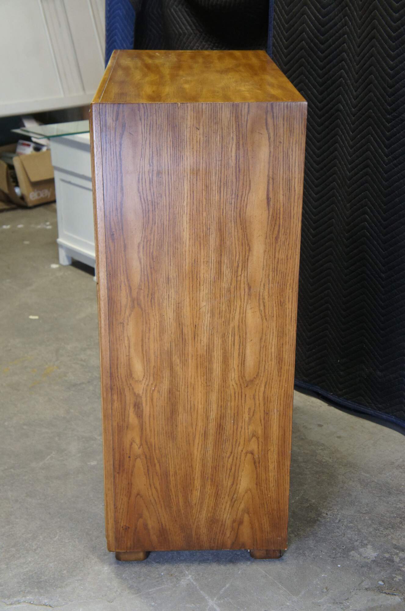 Drexel Heritage Passage Collection Highboy Dresser, circa 1988, no 915-410-2. Features a rectangular frame made from oak with 5 dovetailed drawers featuring inset brass drawer pulls. A great addition to any mid century modern space.
