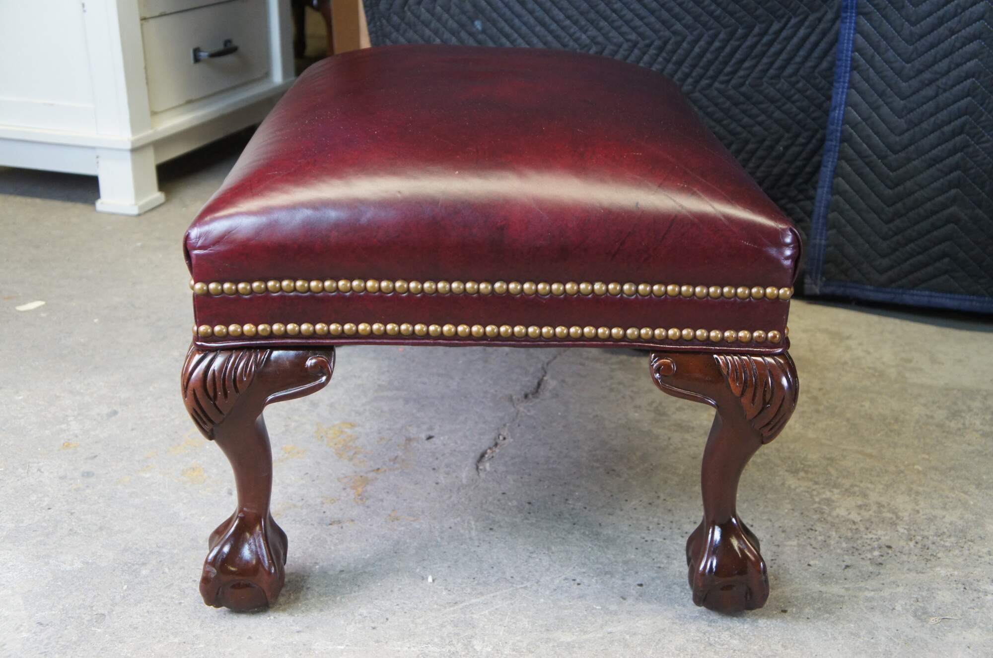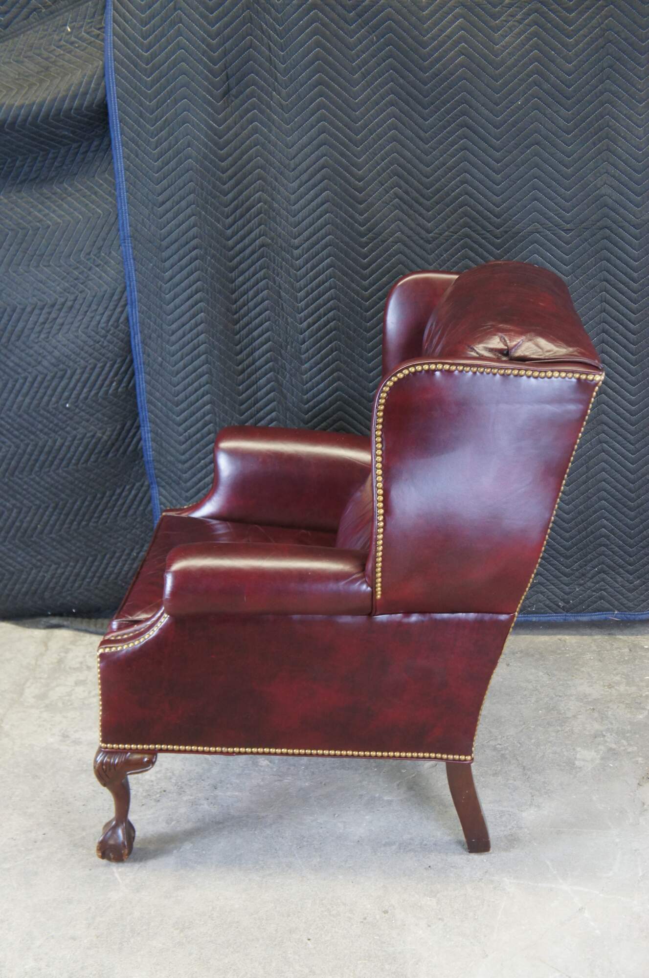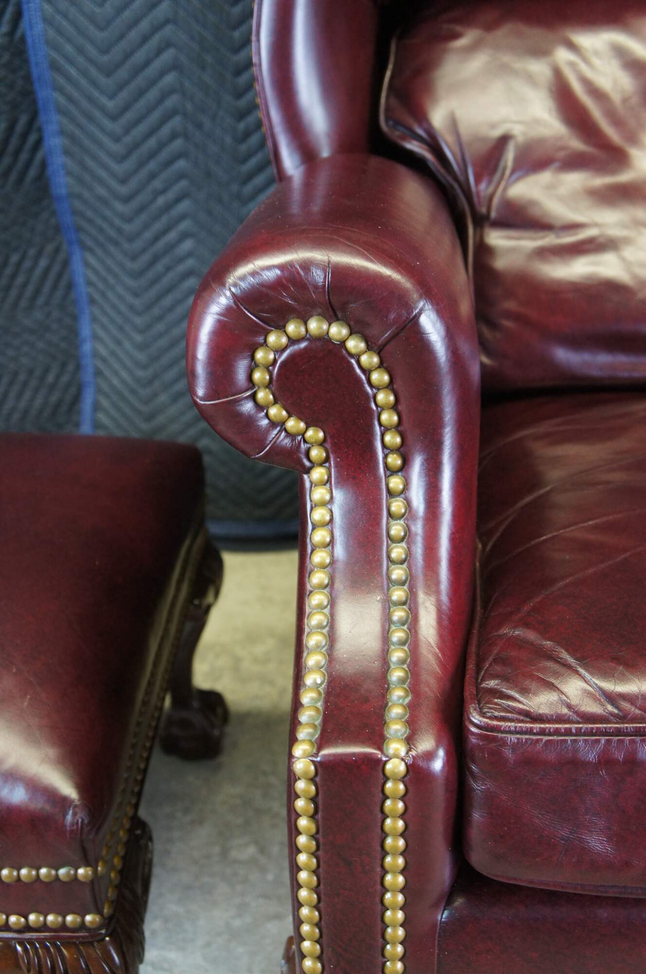 An eye catching wingback chair and ottoman by Hancock & Moore, circa last quarter 20th century. Inspired by classic English Georgian styling. Features a hooded back with rolled arms and brass nailhead trim. The chair is supported by carved mahogany ball and claw feet with acanthus accents. A plush comfy seat that will make a great addition to any space. Includes matching ottoman.