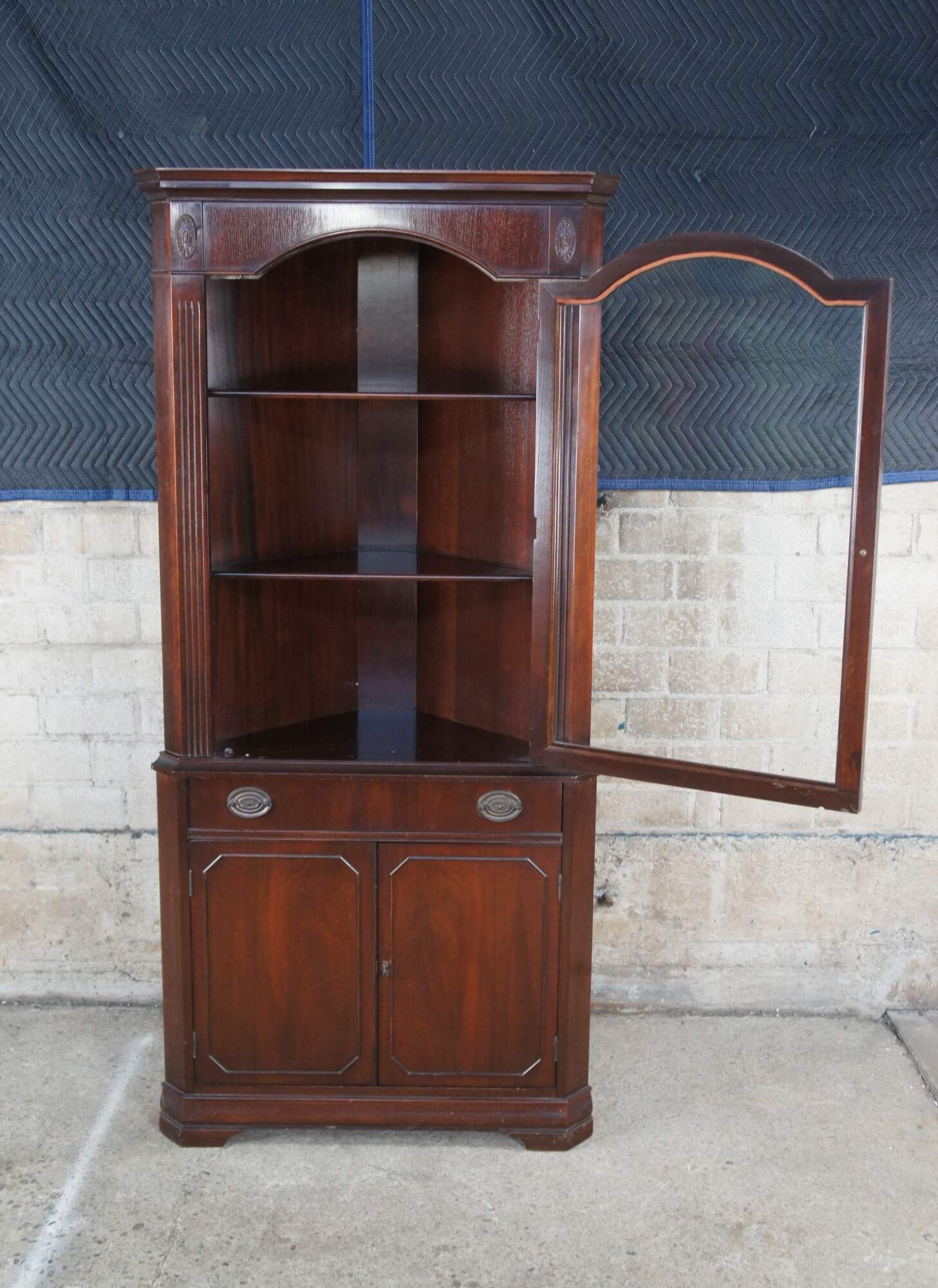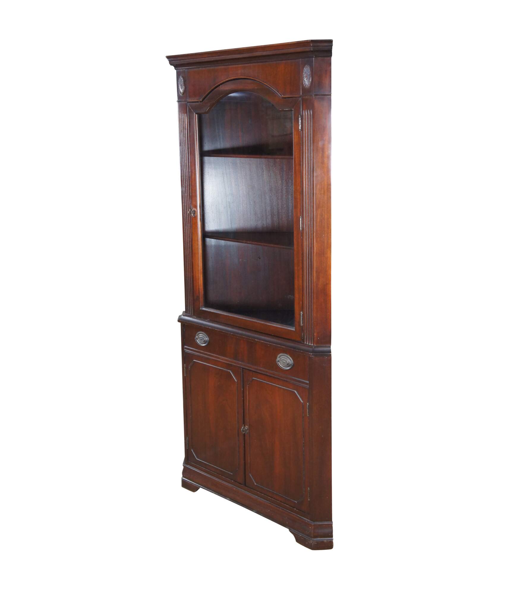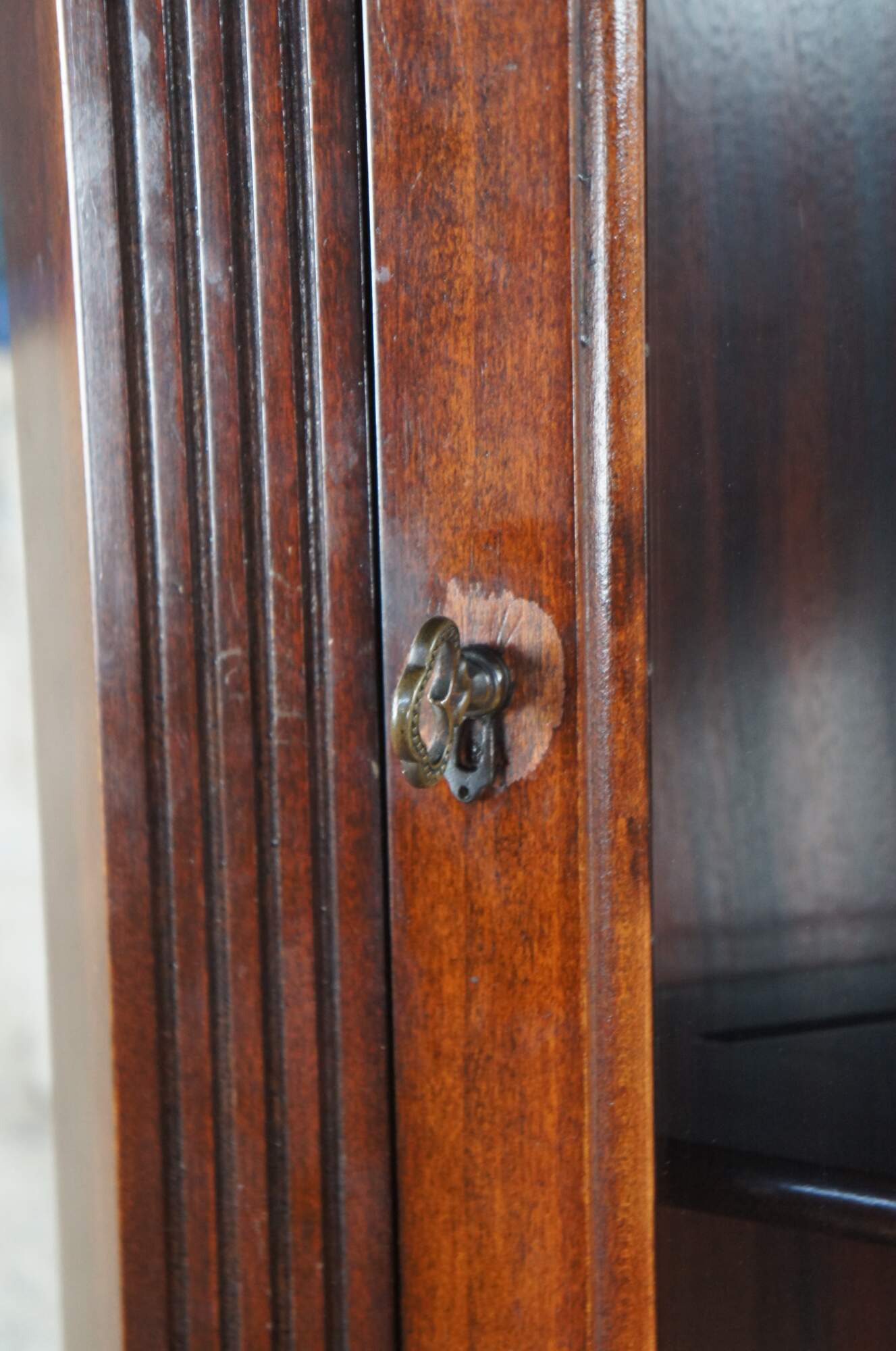 Mid century china cabinet or cupboard. Made of mahogany featuring upper domed curio cabinet with three plate groove shelves, fluted accents, medallions, and lower cabinet and drawer over bracket feet.