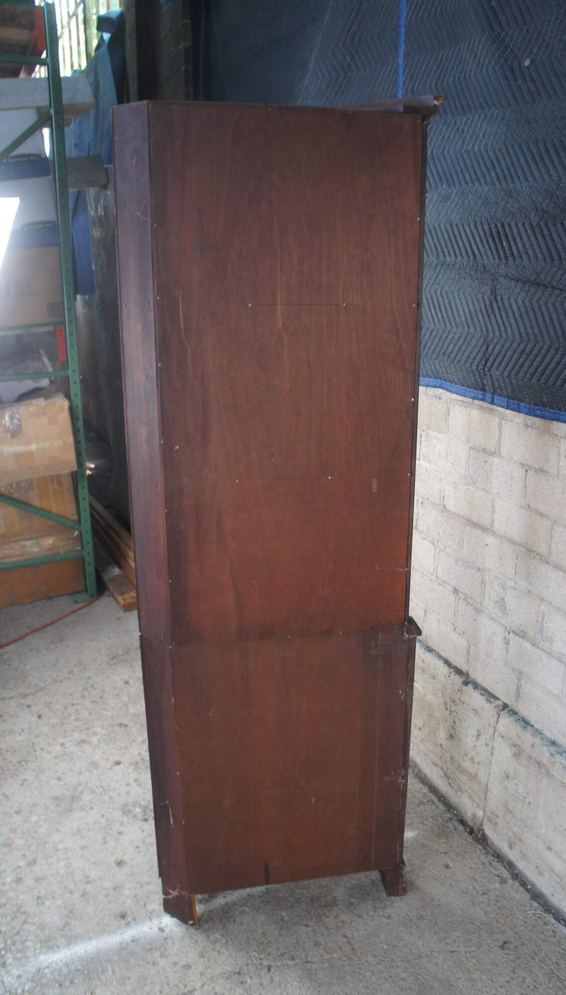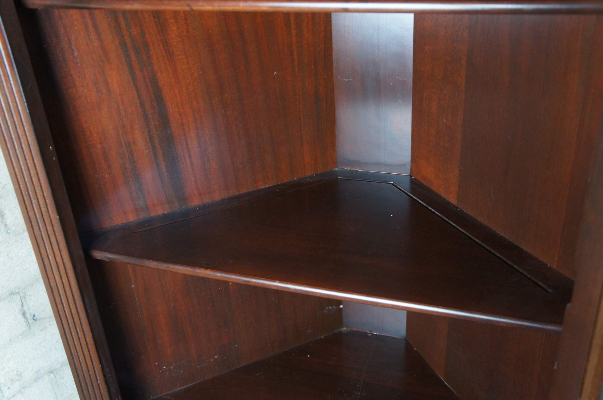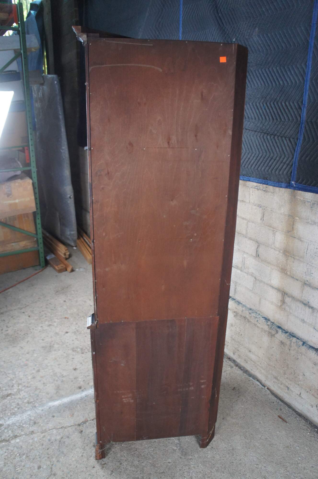 Mid century china cabinet or cupboard. Made of mahogany featuring upper domed curio cabinet with three plate groove shelves, fluted accents, medallions, and lower cabinet and drawer over bracket feet.