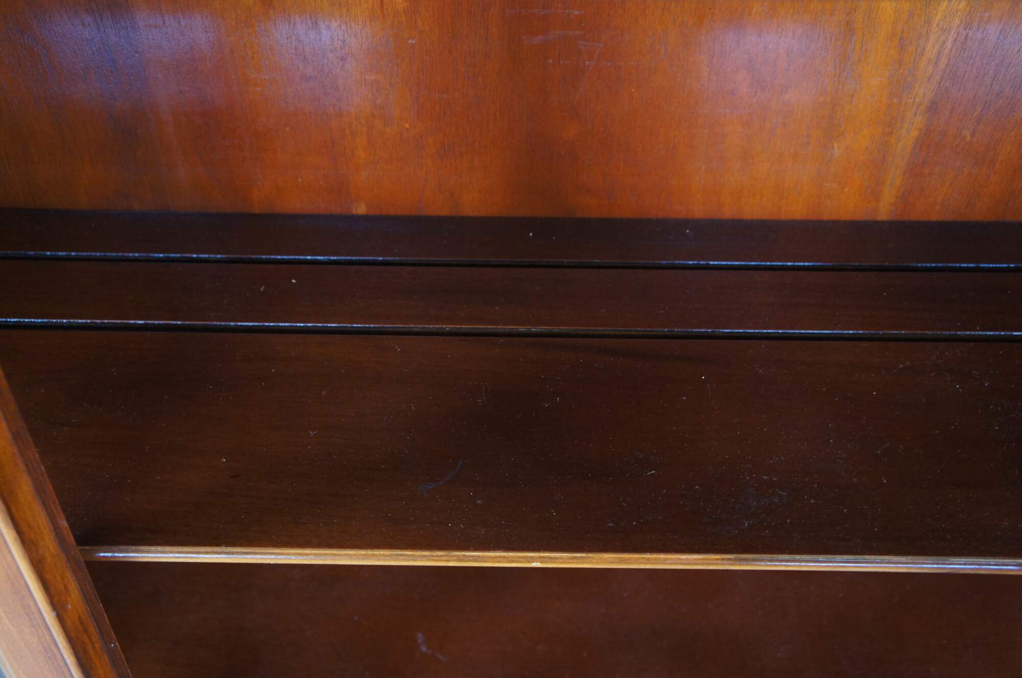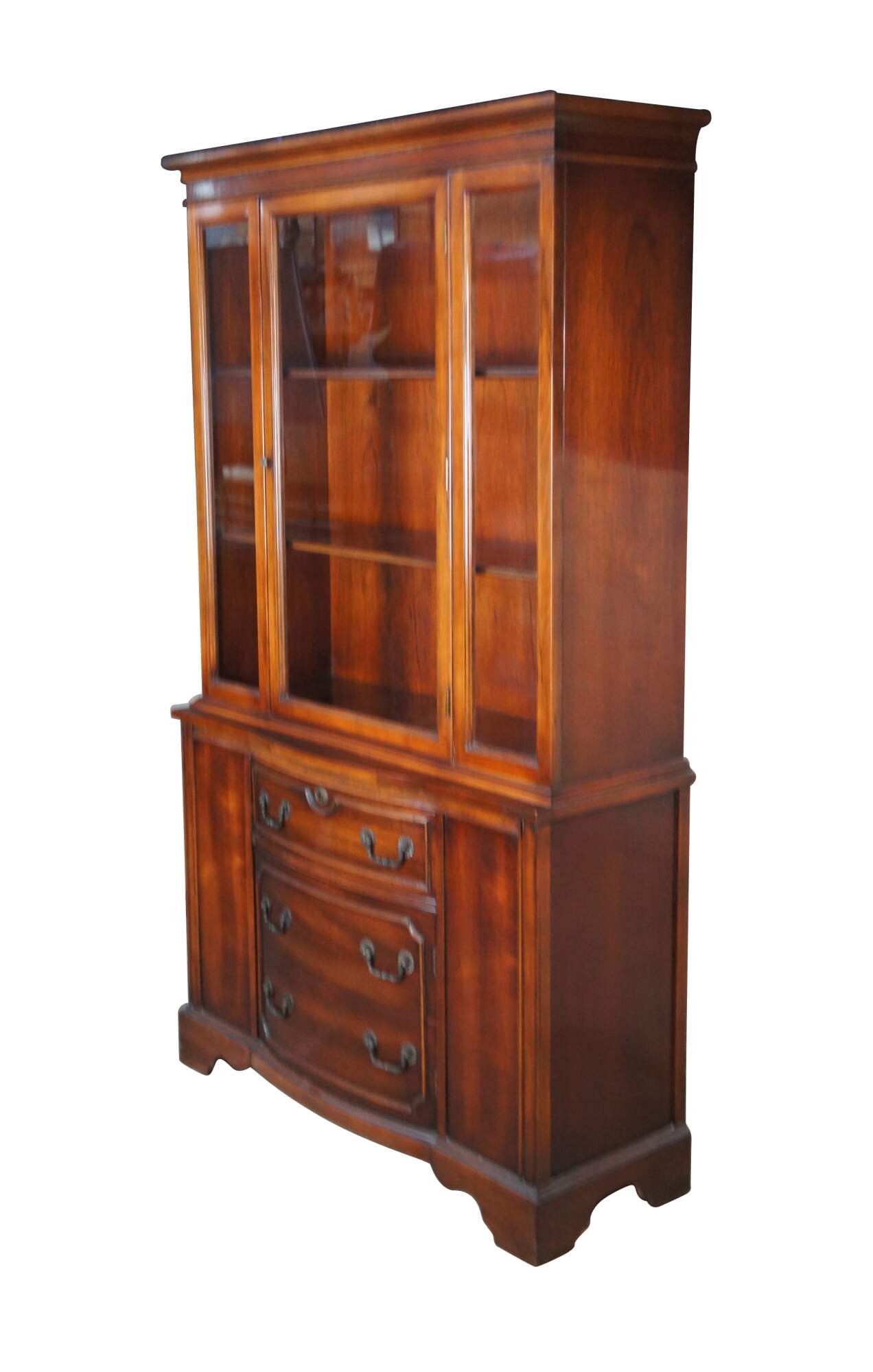 Mid century china cabinet or cupboard. Made of mahogany featuring upper curio cabinet with three plate groove shelves and lower cabinet and drawer over bracket feet.
