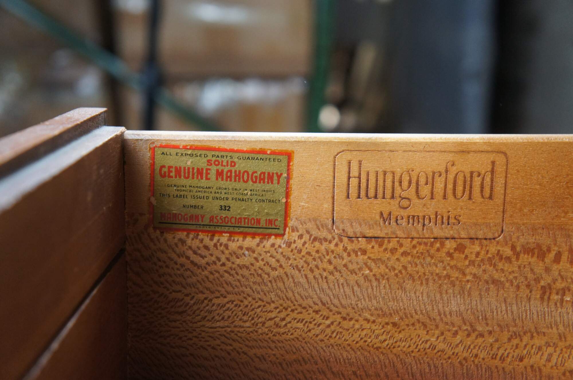 Mid Century Modern Hungerford of Memphis dresser or chest of drawers with vanity mirror. Made of mahogany featuring nine drawers with brass hardware, capped feet and rectangular mirror.