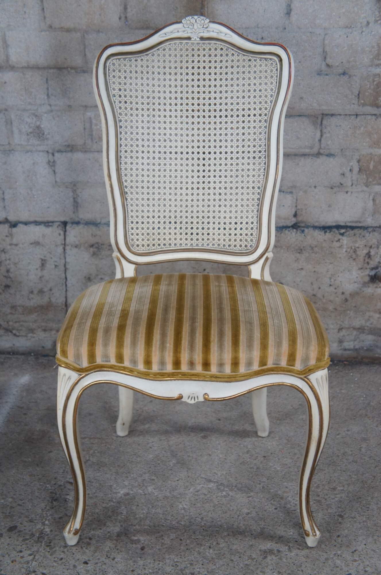 Vintage set of six Kindel Furniture Co. french provincial dining chairs featuring serpentine form with caned back, fauteuil arms, white and gold painted accents and striped velvet fabric. Made by Michigan Chair Co of Grand Rapids, circa 1978.