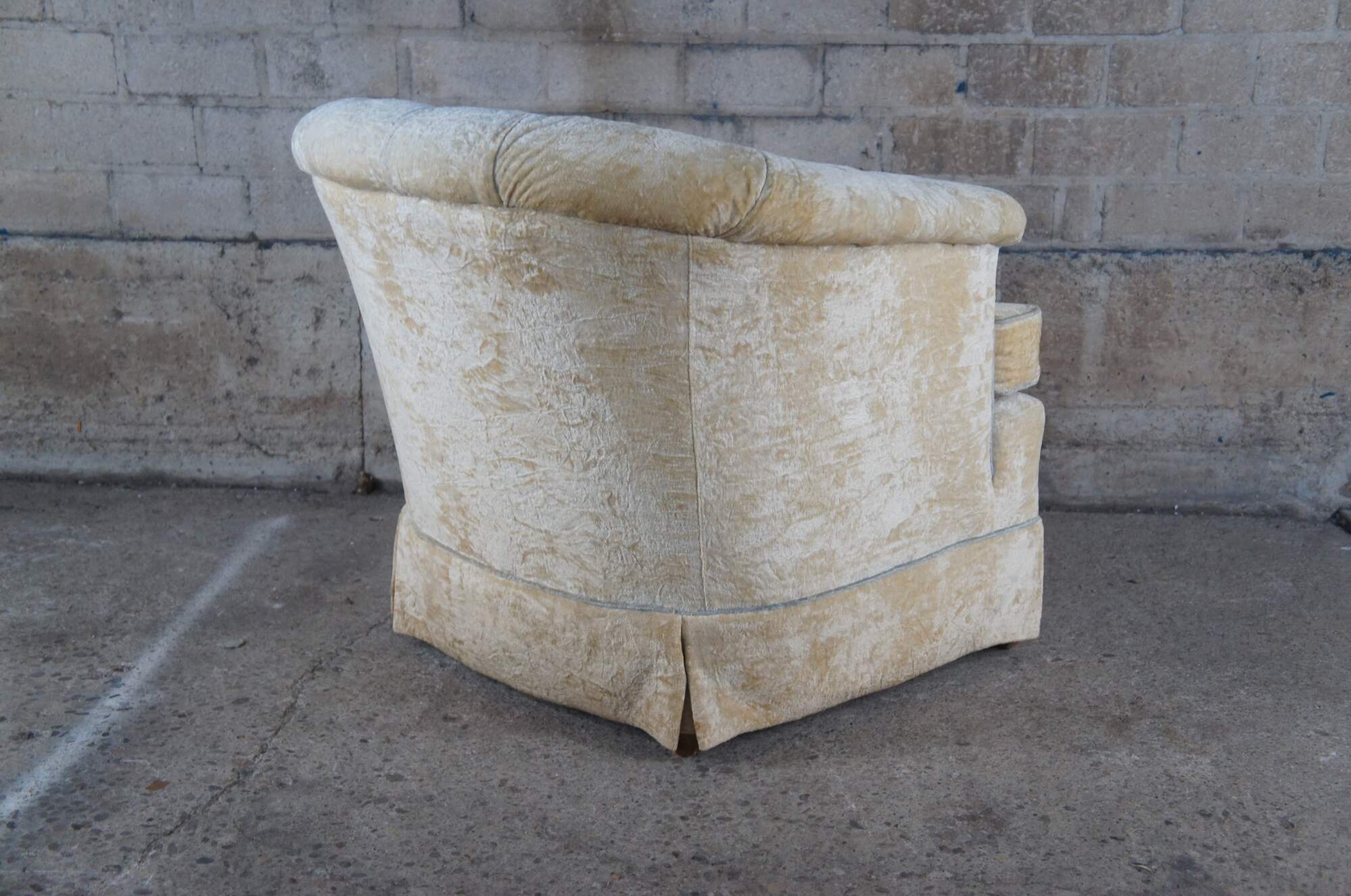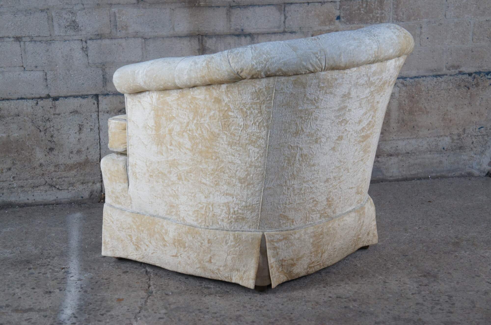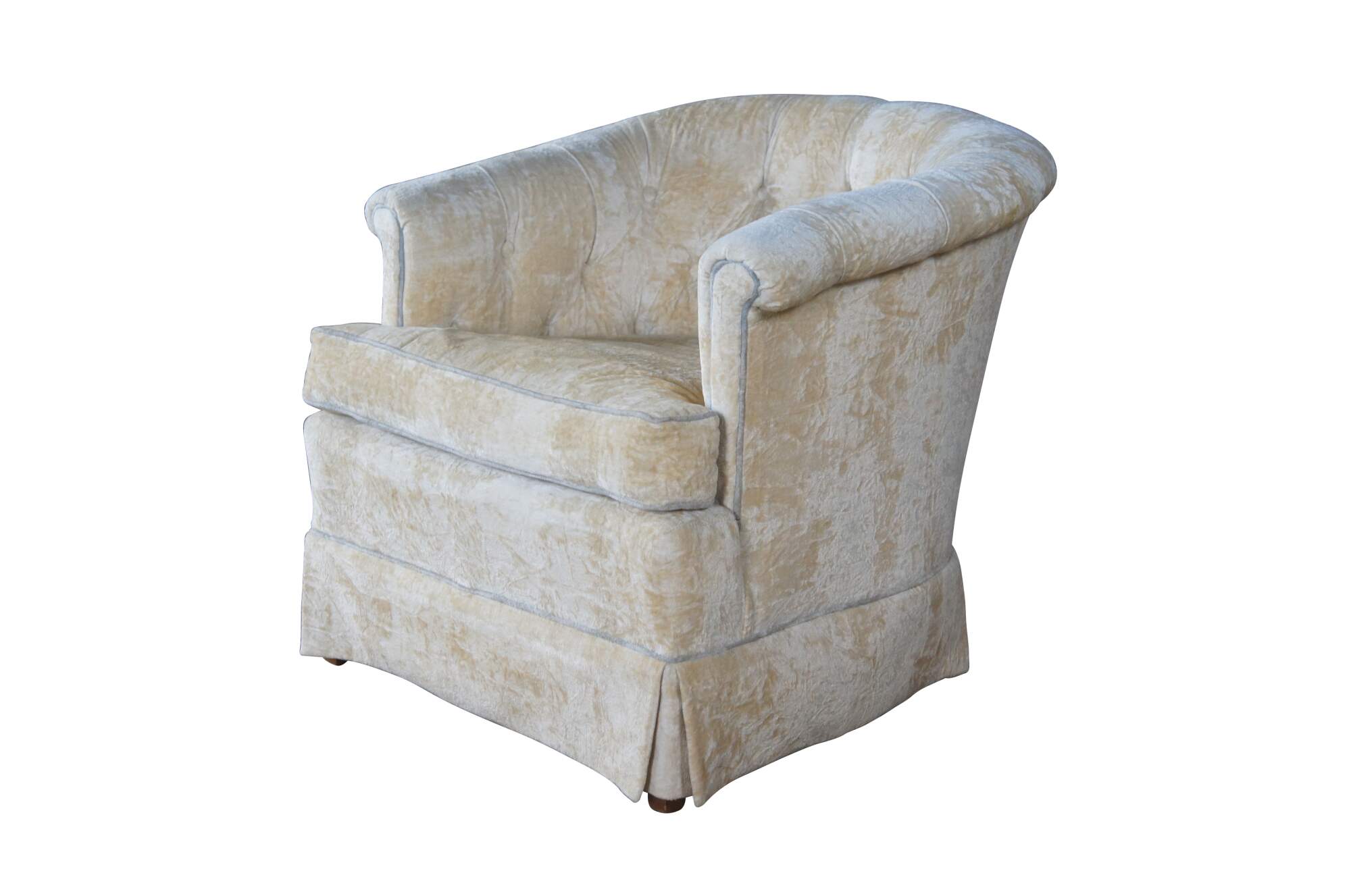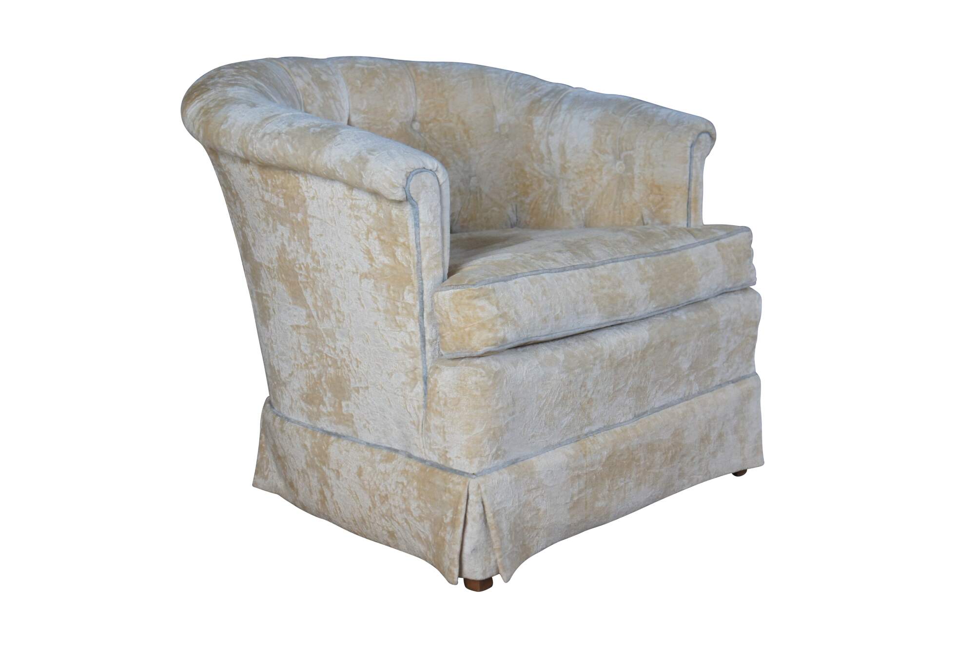 Mid century Hickory Tavern barrel back club chair featuring off cream and baby blue textured velvet with tufted back and skirted base. Made in Hickory North Carolina.