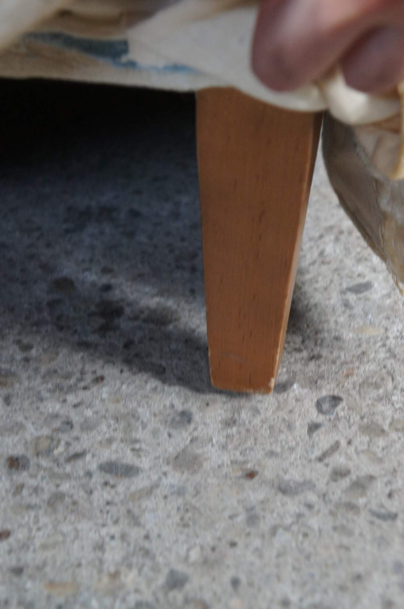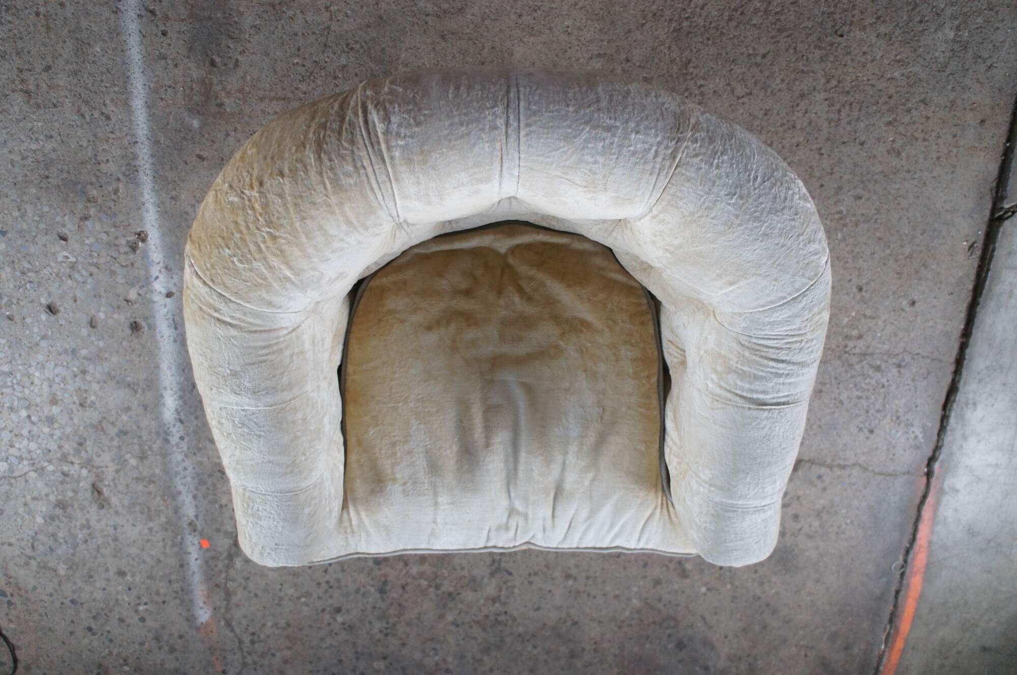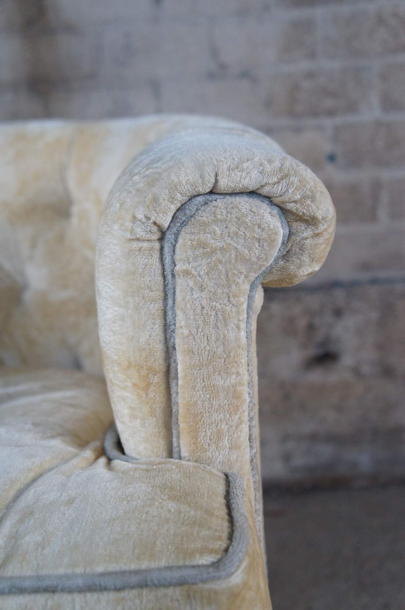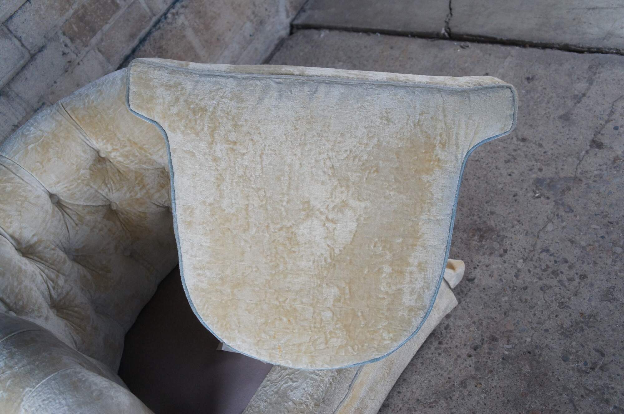 Mid century Hickory Tavern barrel back club chair featuring off cream and baby blue textured velvet with tufted back and skirted base. Made in Hickory North Carolina.