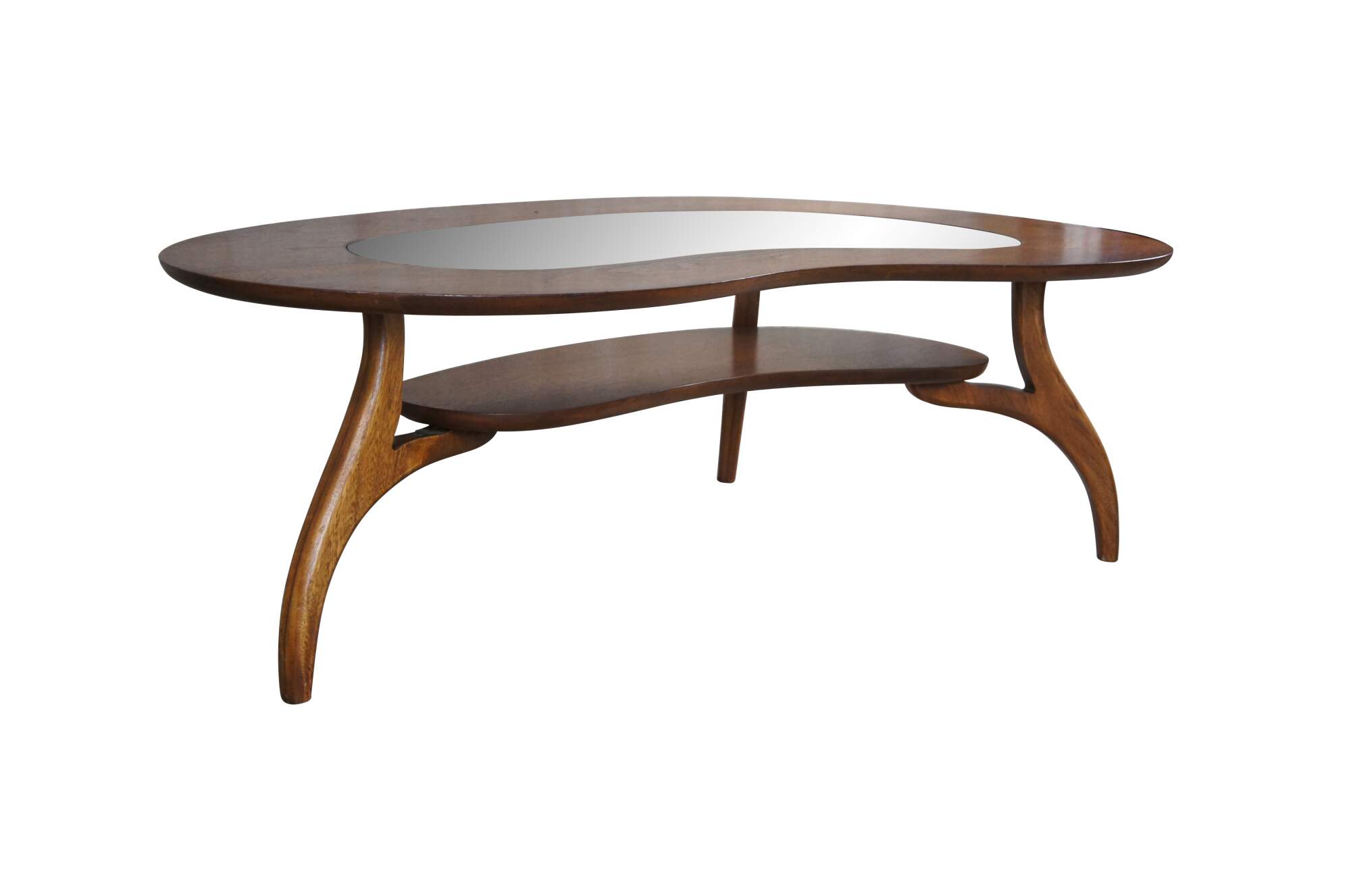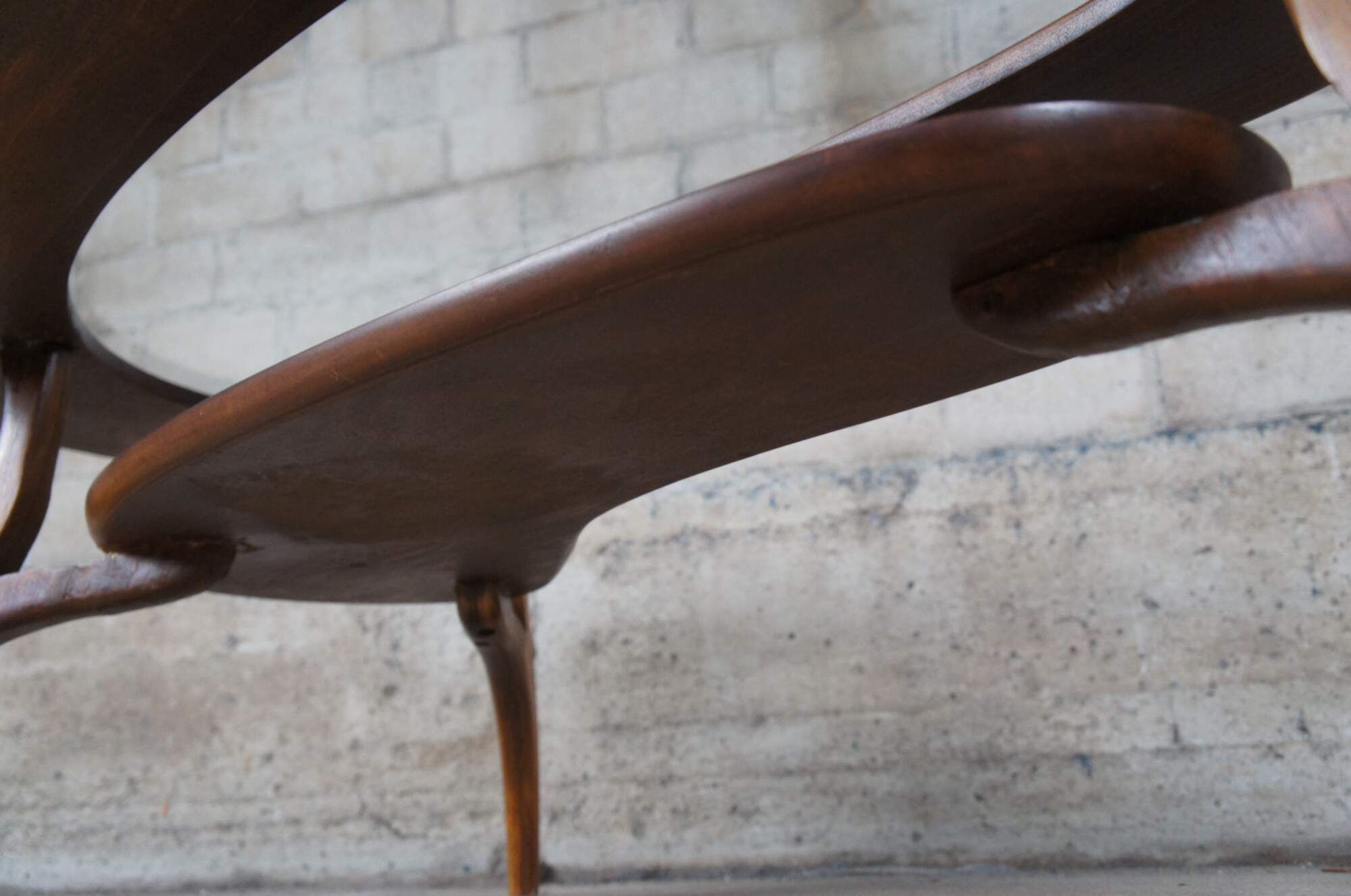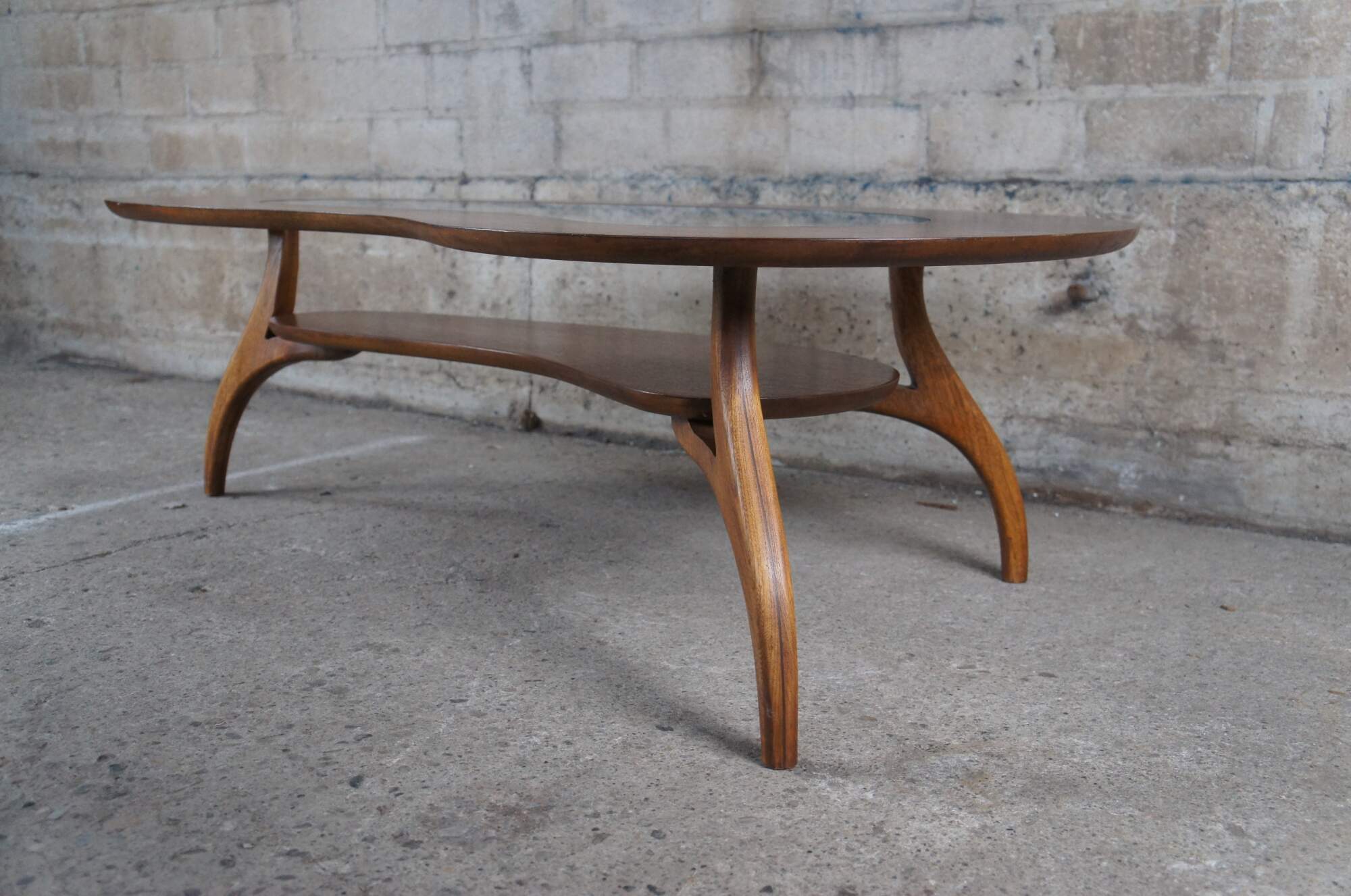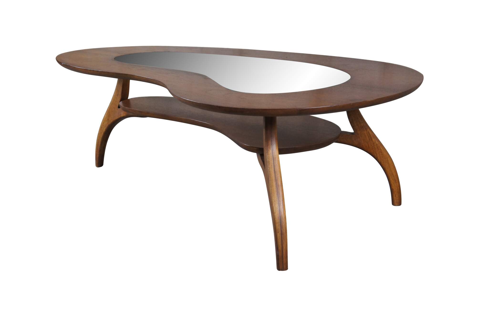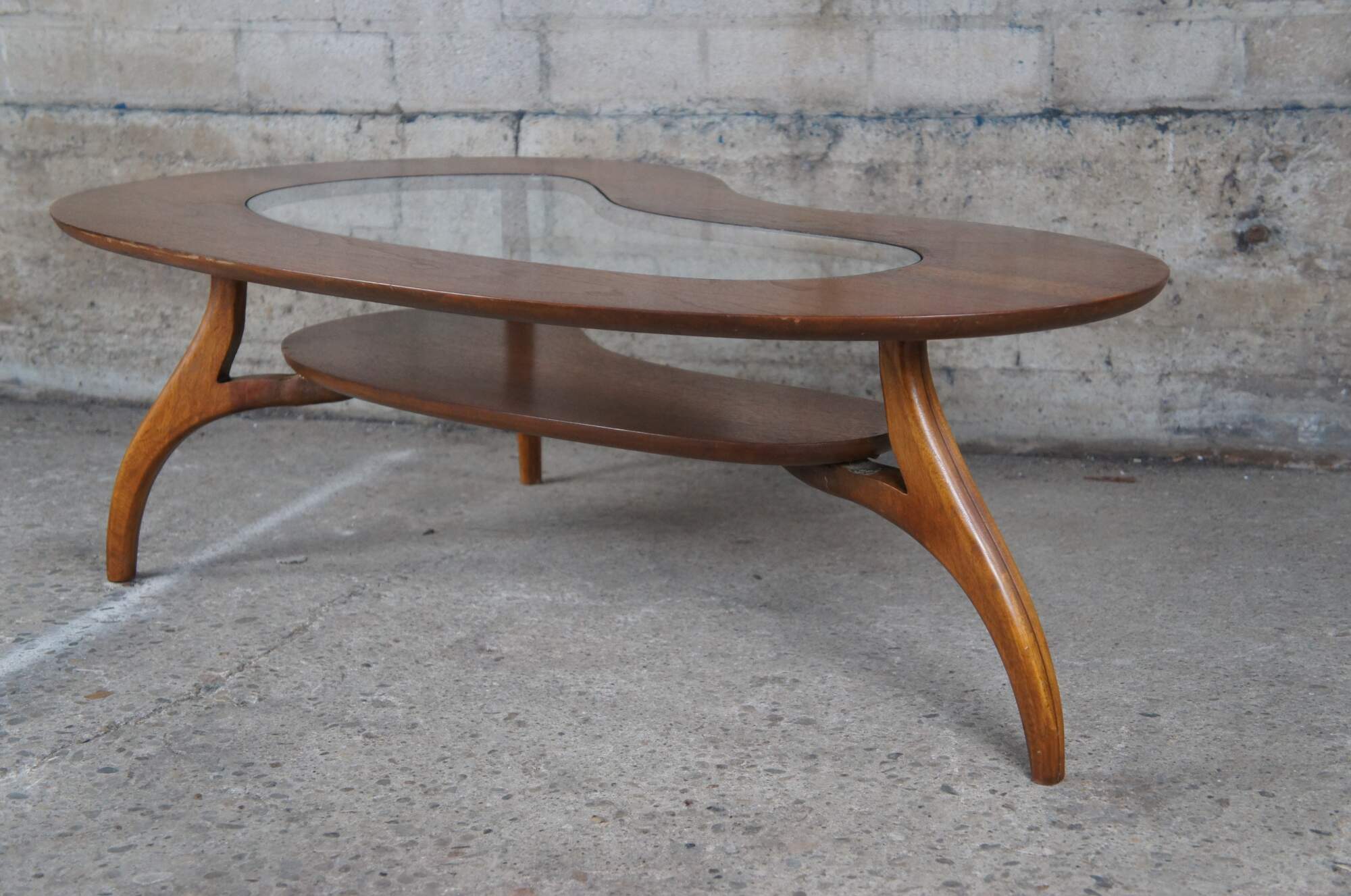 Mid century modern sculptural free form kidney bean shaped coffee table. Made of walnut featuring tiered design with glass top and three legs.
