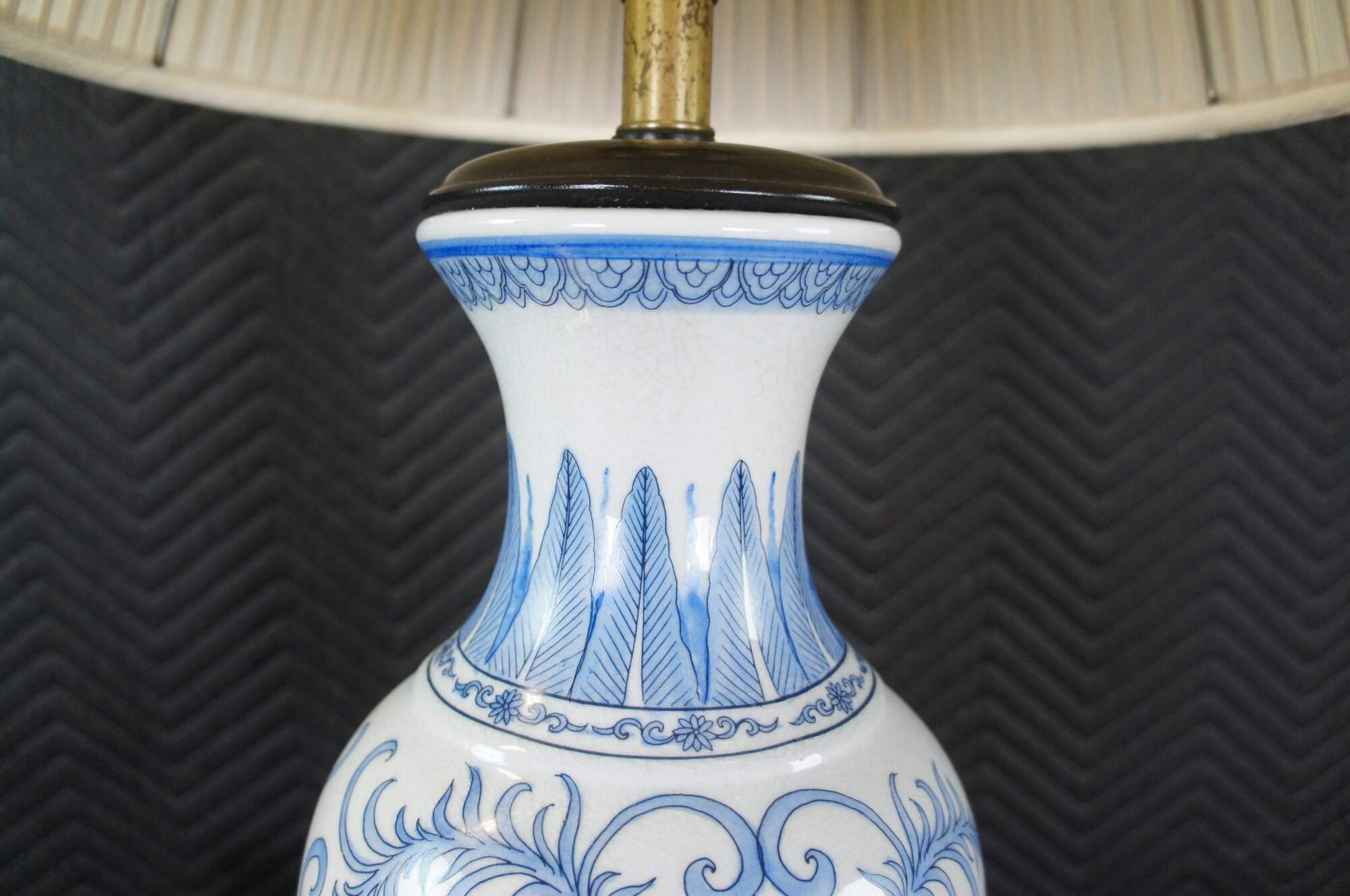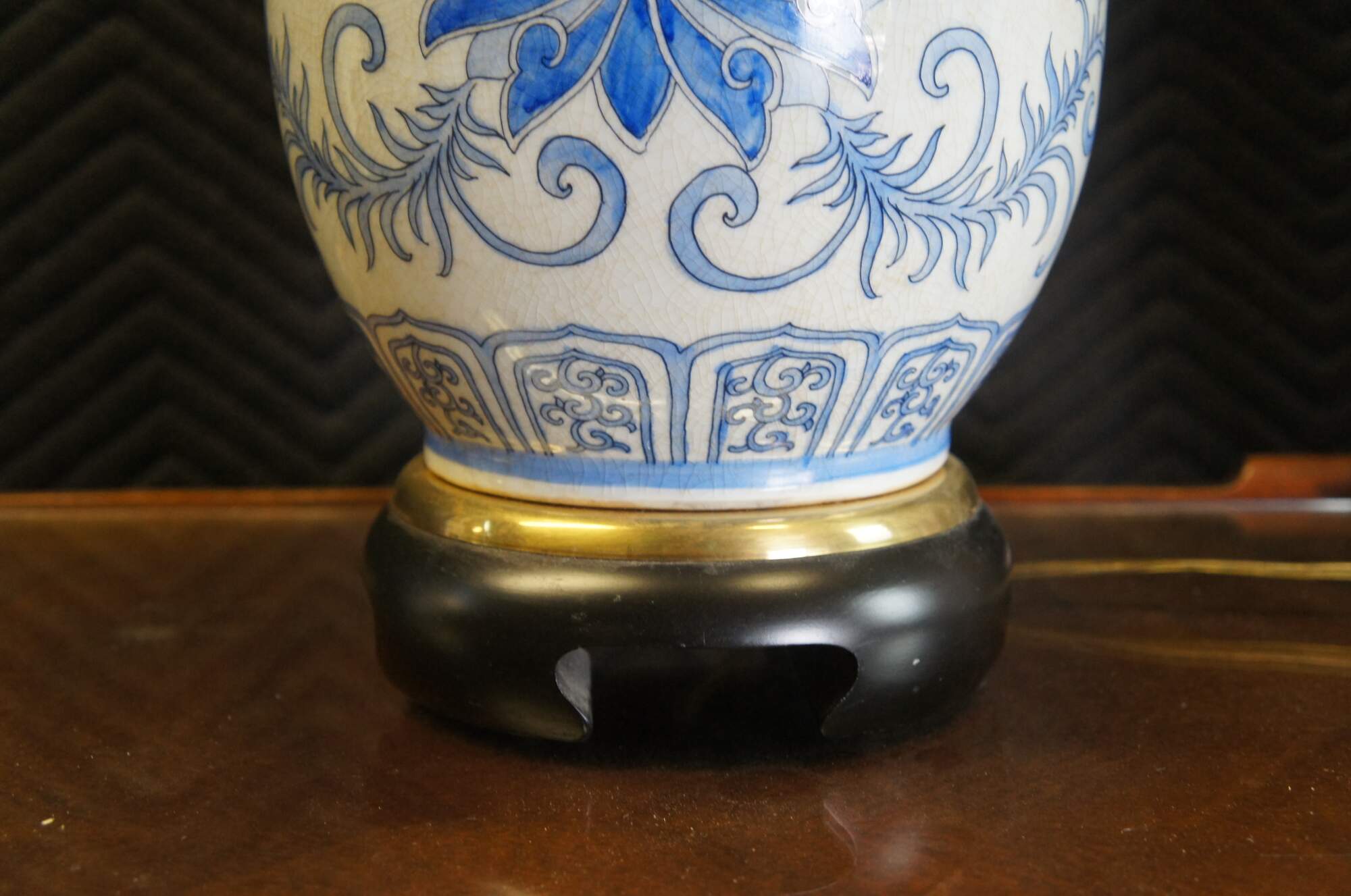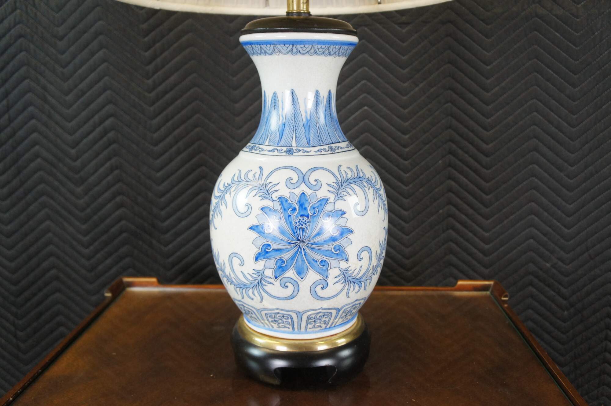 Vintage Frederick Cooper blue and white porcelain table lamp featuring a floral chinoiserie designed vase / urn / jar