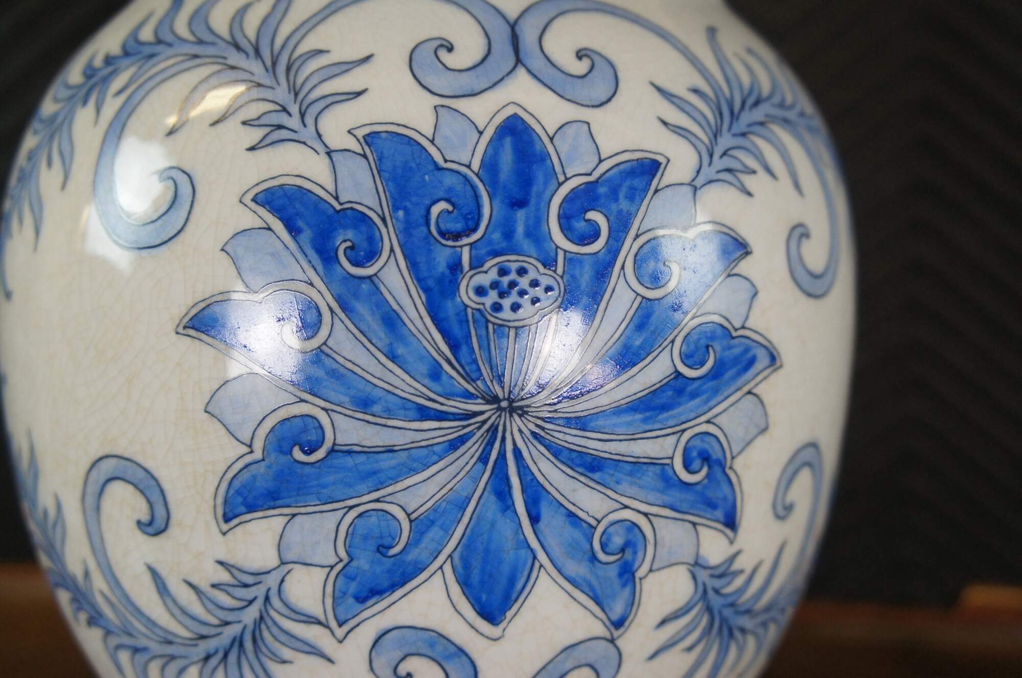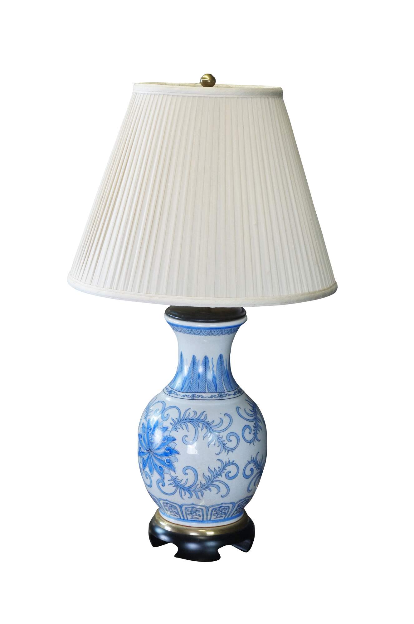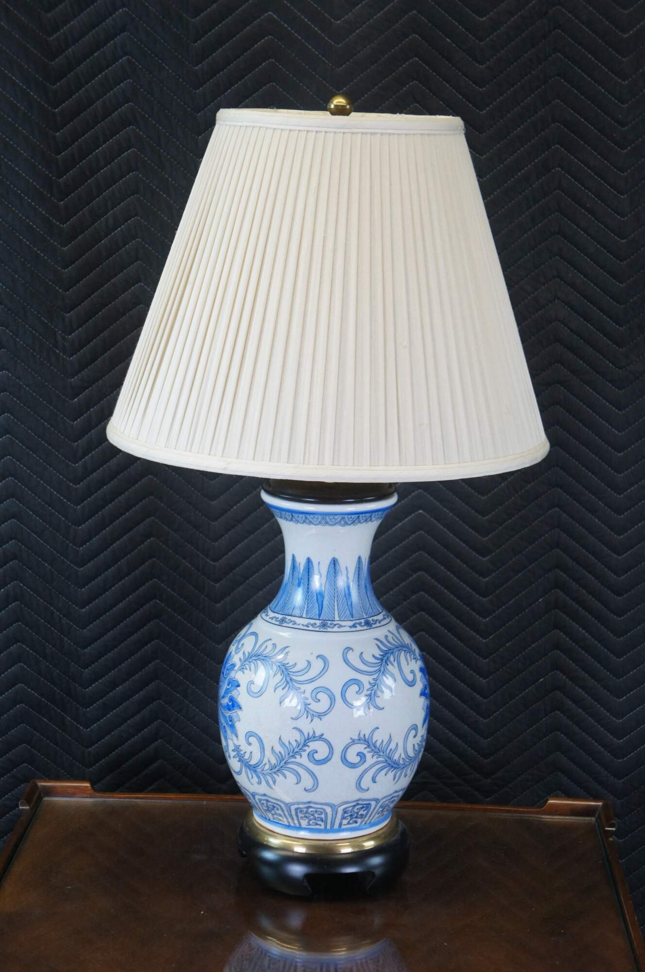 Vintage Frederick Cooper blue and white porcelain table lamp featuring a floral chinoiserie designed vase / urn / jar