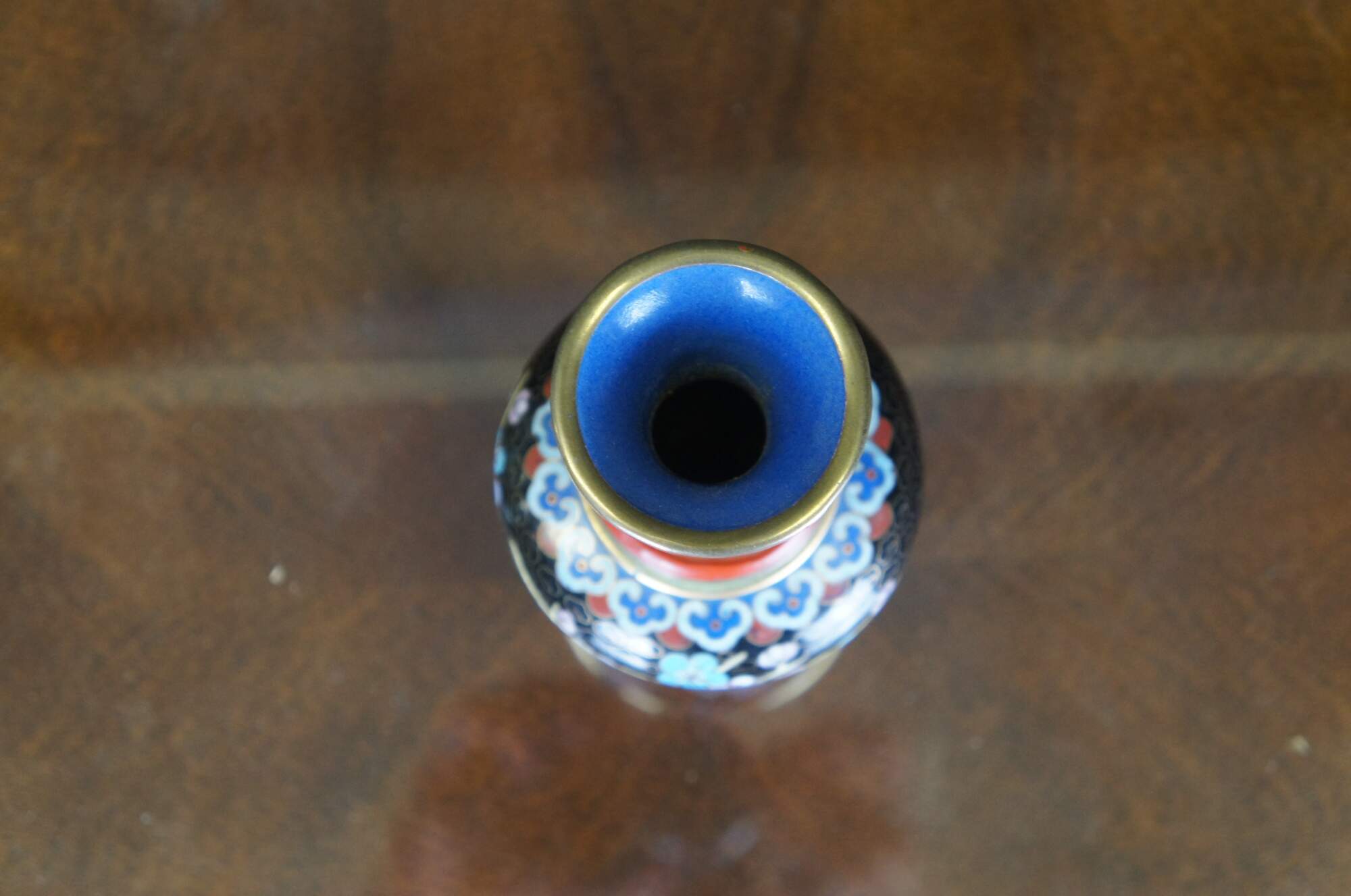 Antique Chinese Chinoiserie vase featuring carved Cinnabar with brass accents and enameled Cherry Blossoms on a field of black clouds. Includes footed base stand.