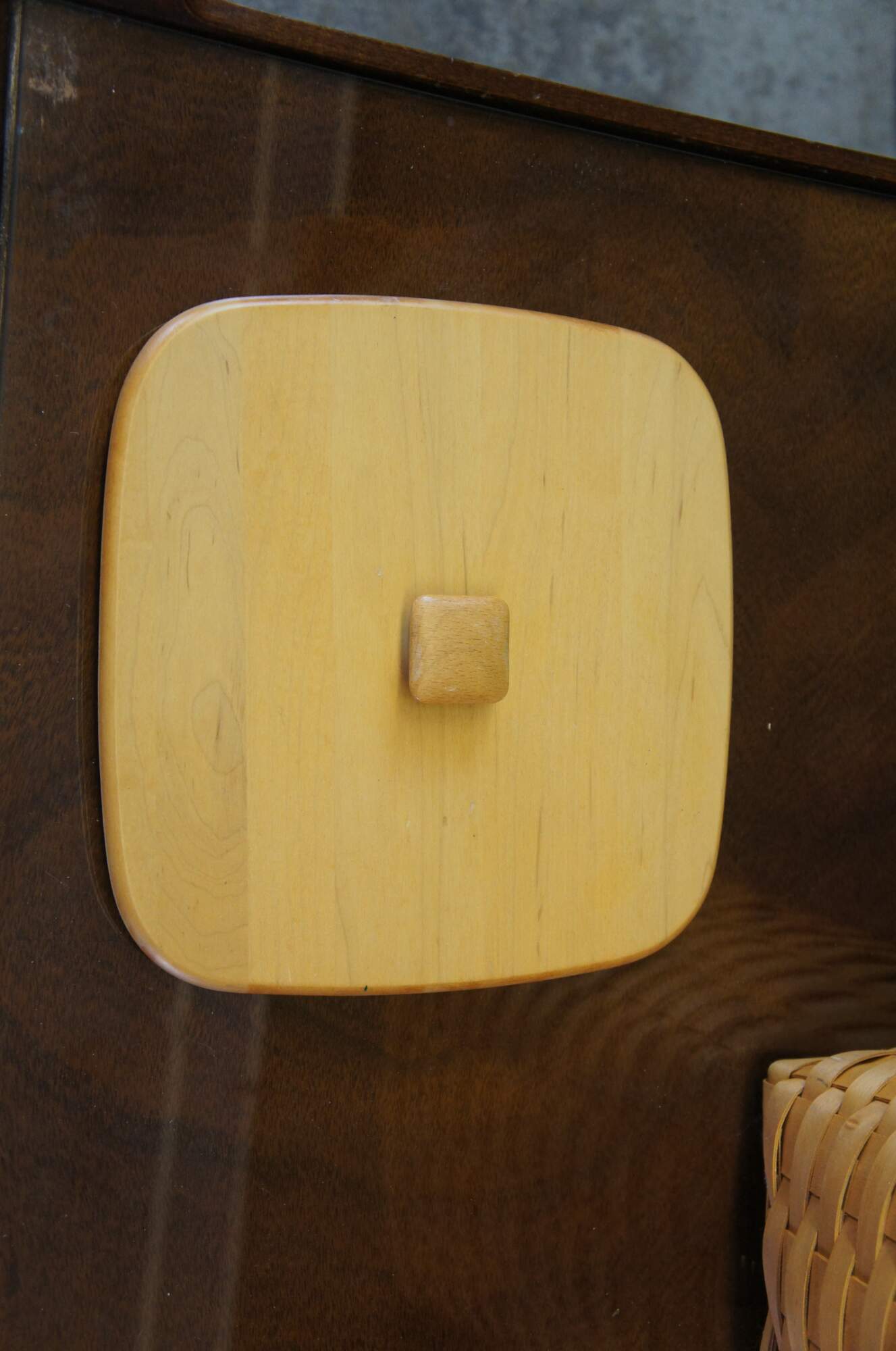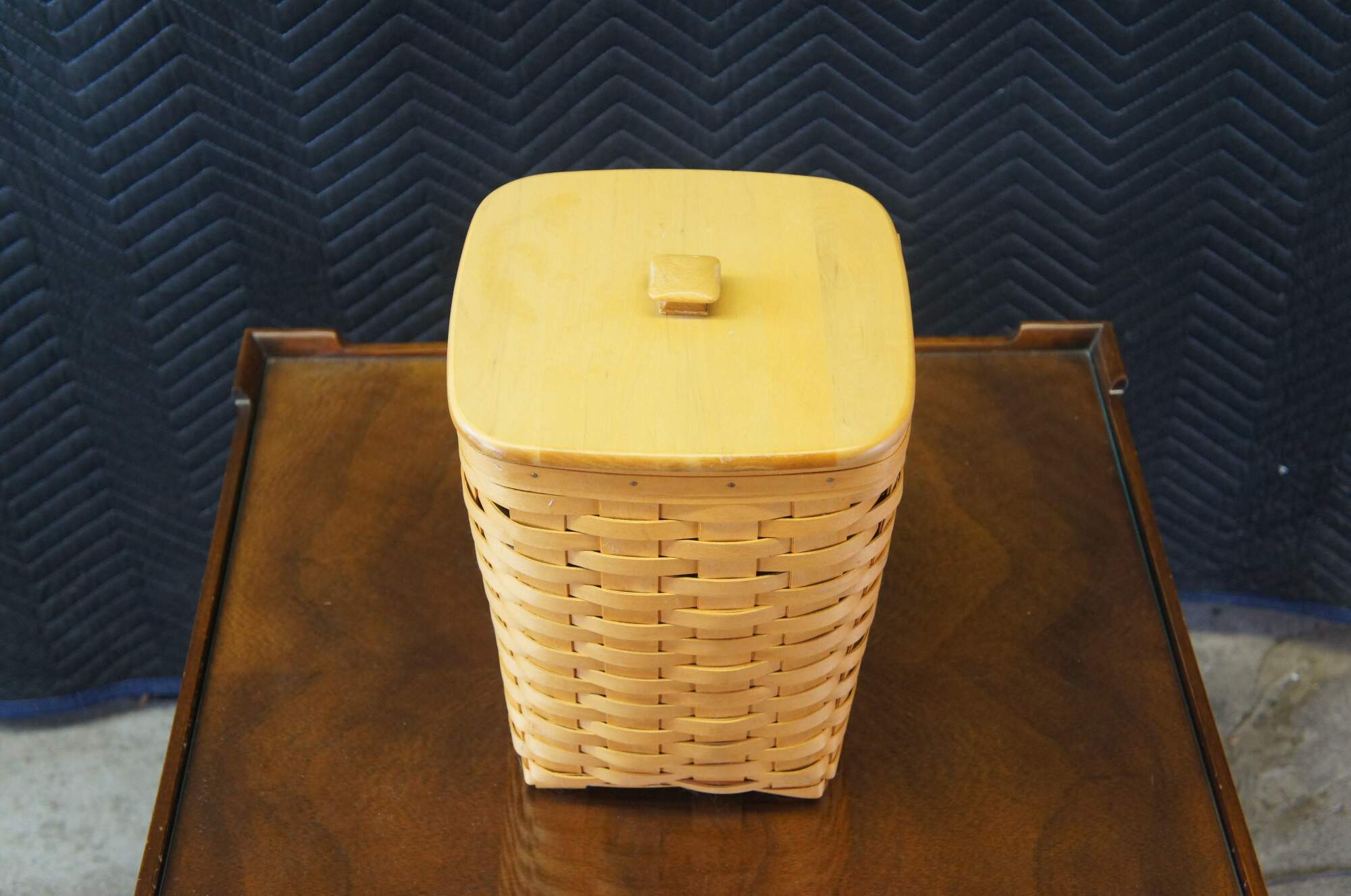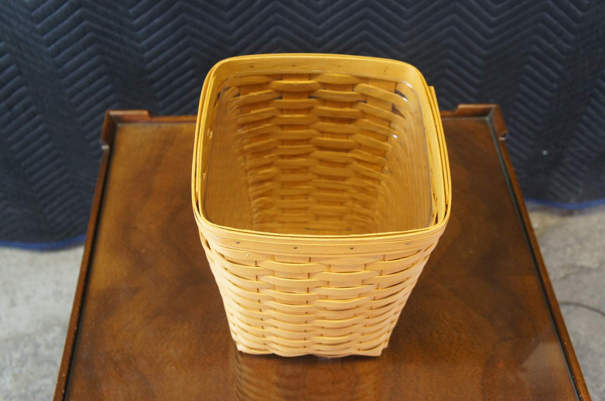 Longaberger woven trash can, circa 1999. Features a plastic insert and lid.
