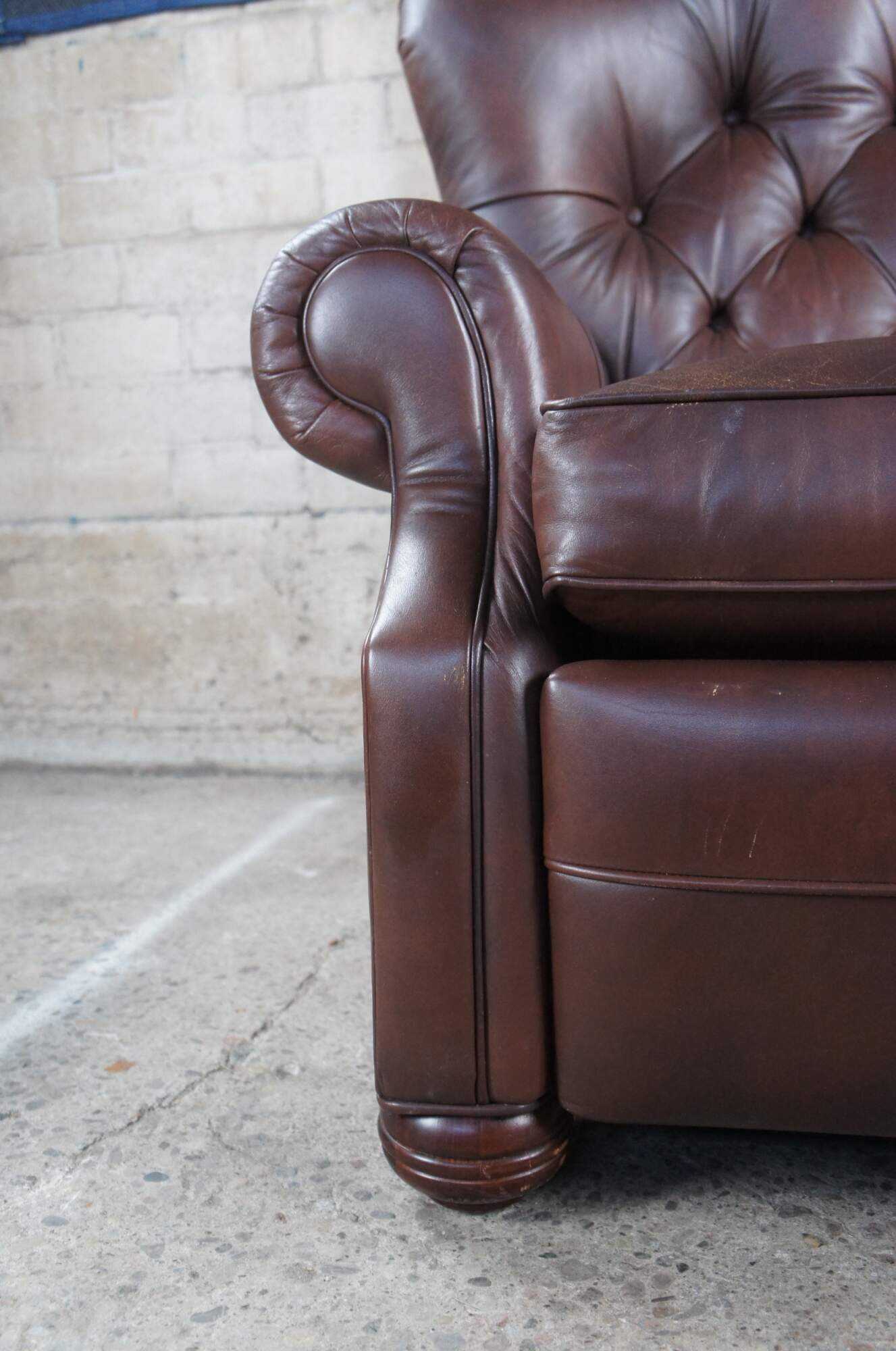 Vintage Ethan Allen brown leather Cromwell recliner featuring tufted back, rolled arms, wingback and bun feet.