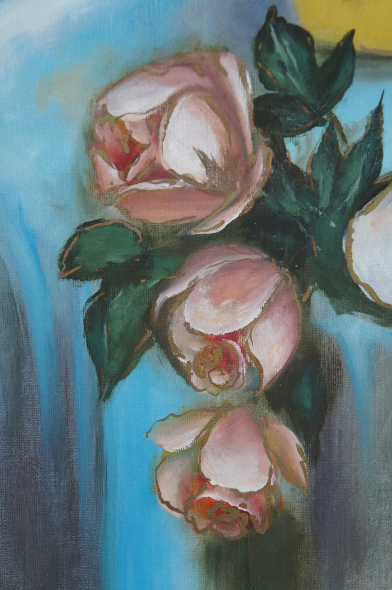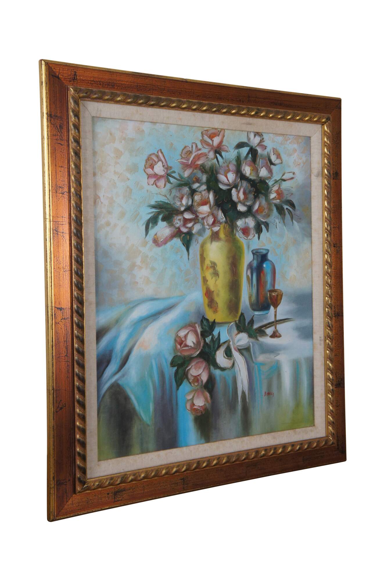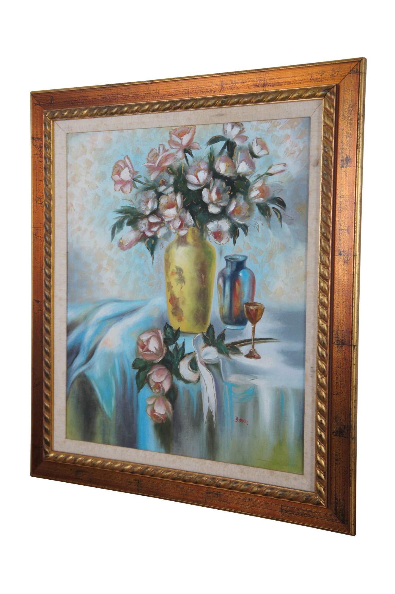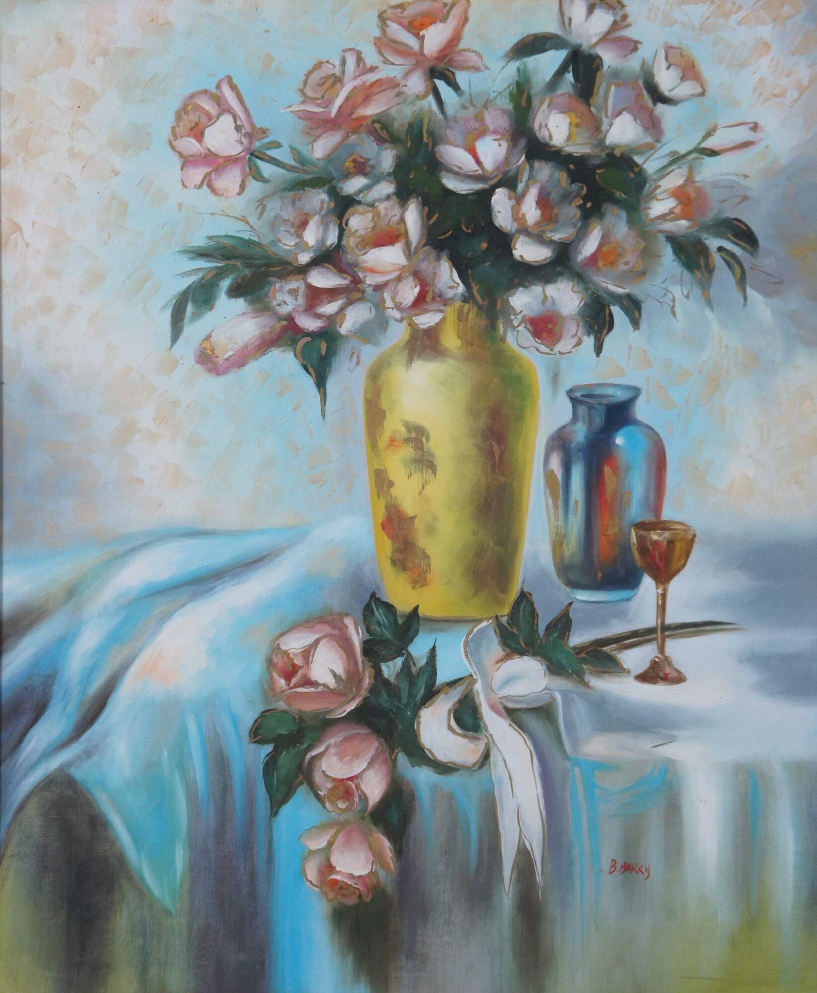 Vintage expressionist oil on canvas still life painting showing a bouquest of pink flowers in a yellow center vase, next to a vase and brass goblet on a blue and white tablecloth. Signed B. Barry in lower right.