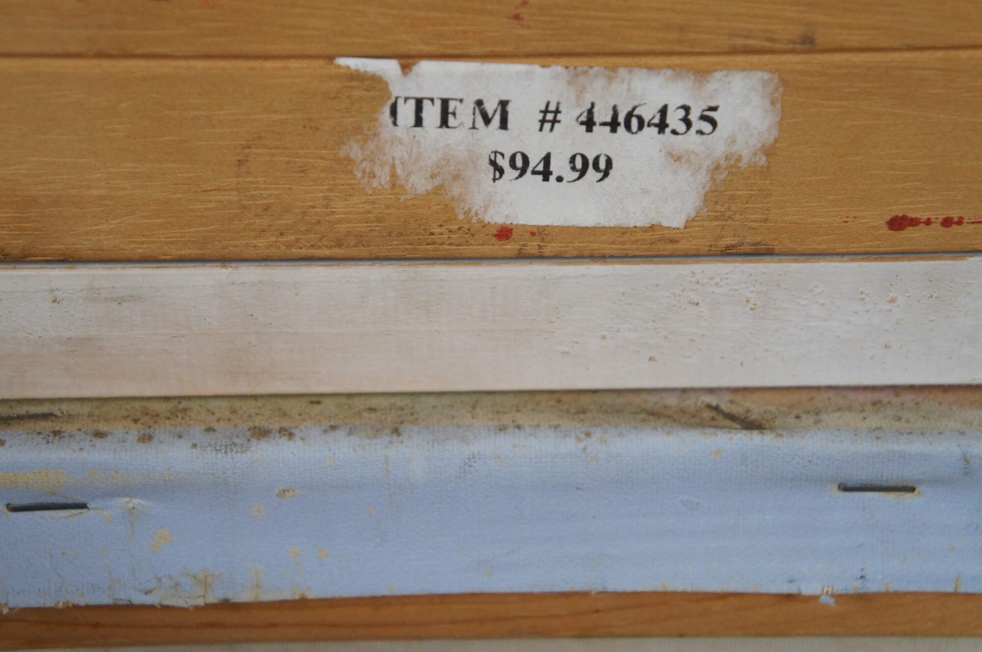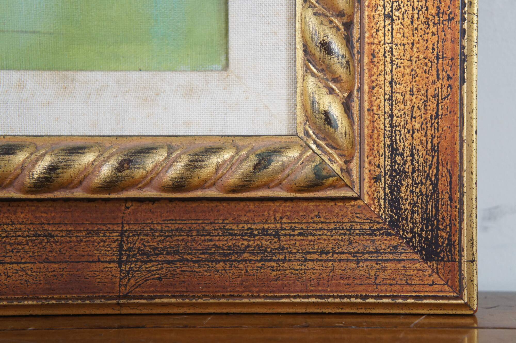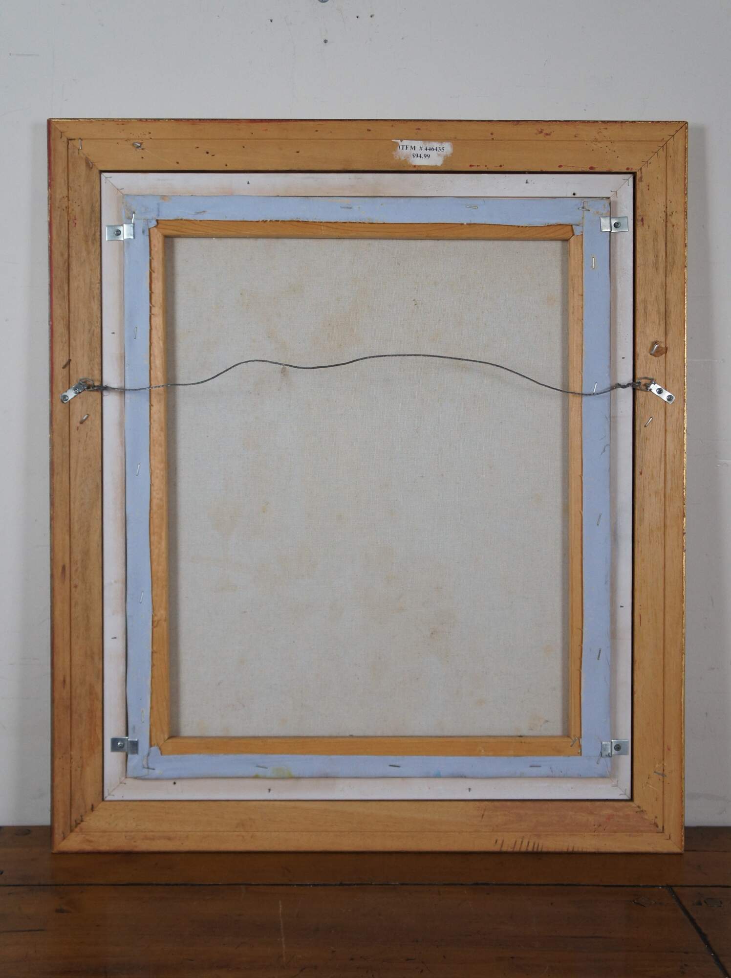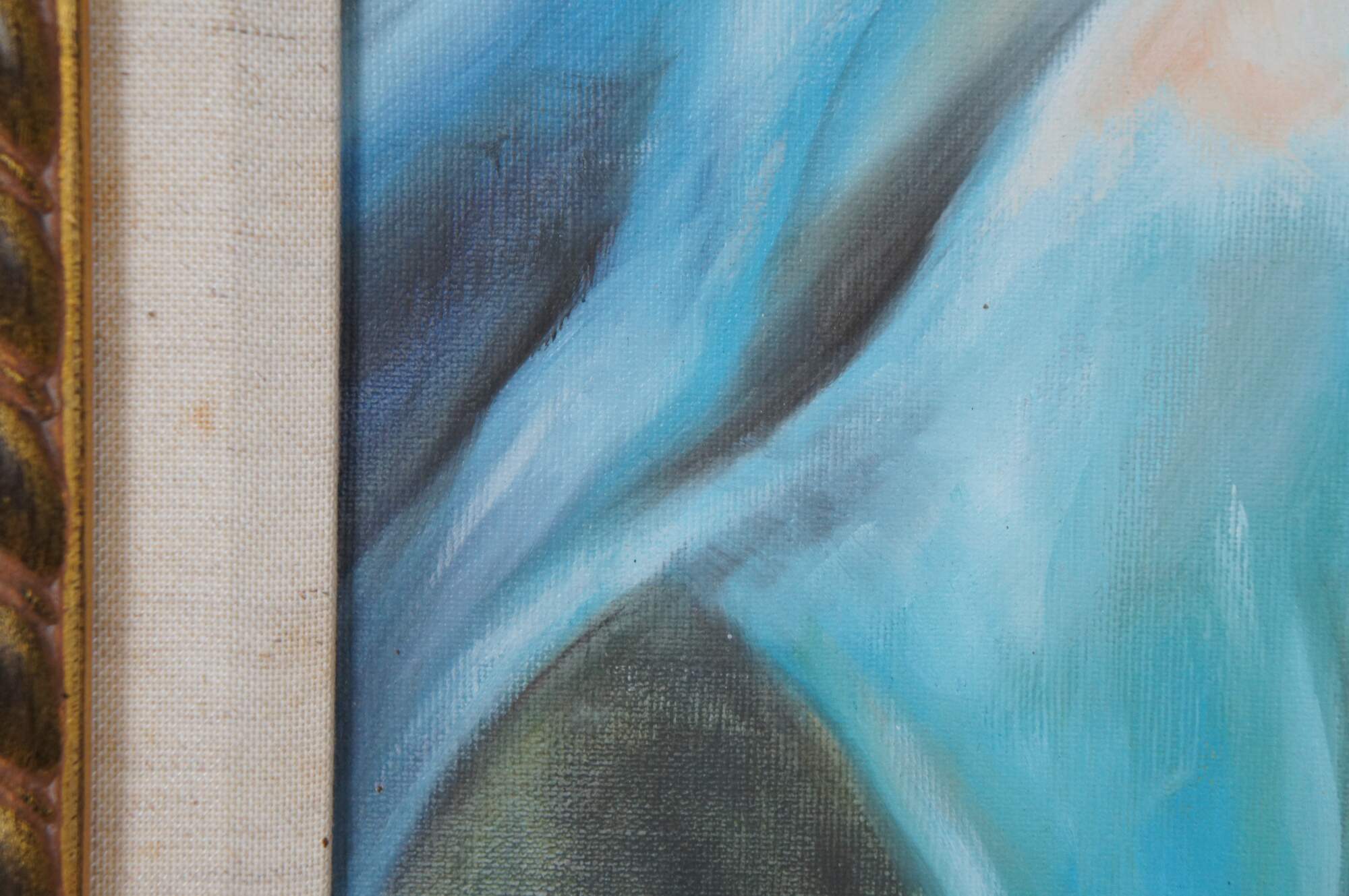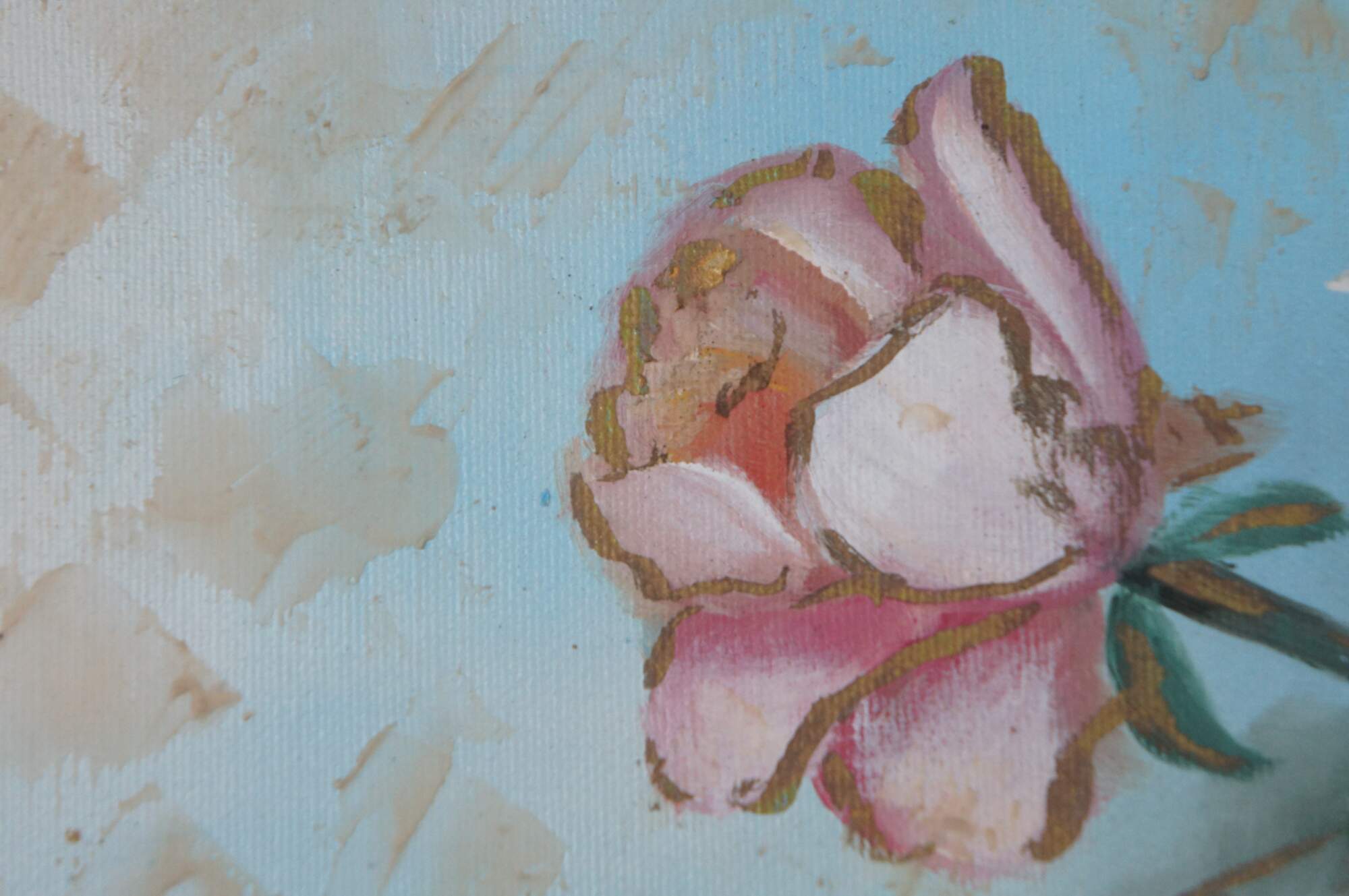 Vintage expressionist oil on canvas still life painting showing a bouquest of pink flowers in a yellow center vase, next to a vase and brass goblet on a blue and white tablecloth. Signed B. Barry in lower right.