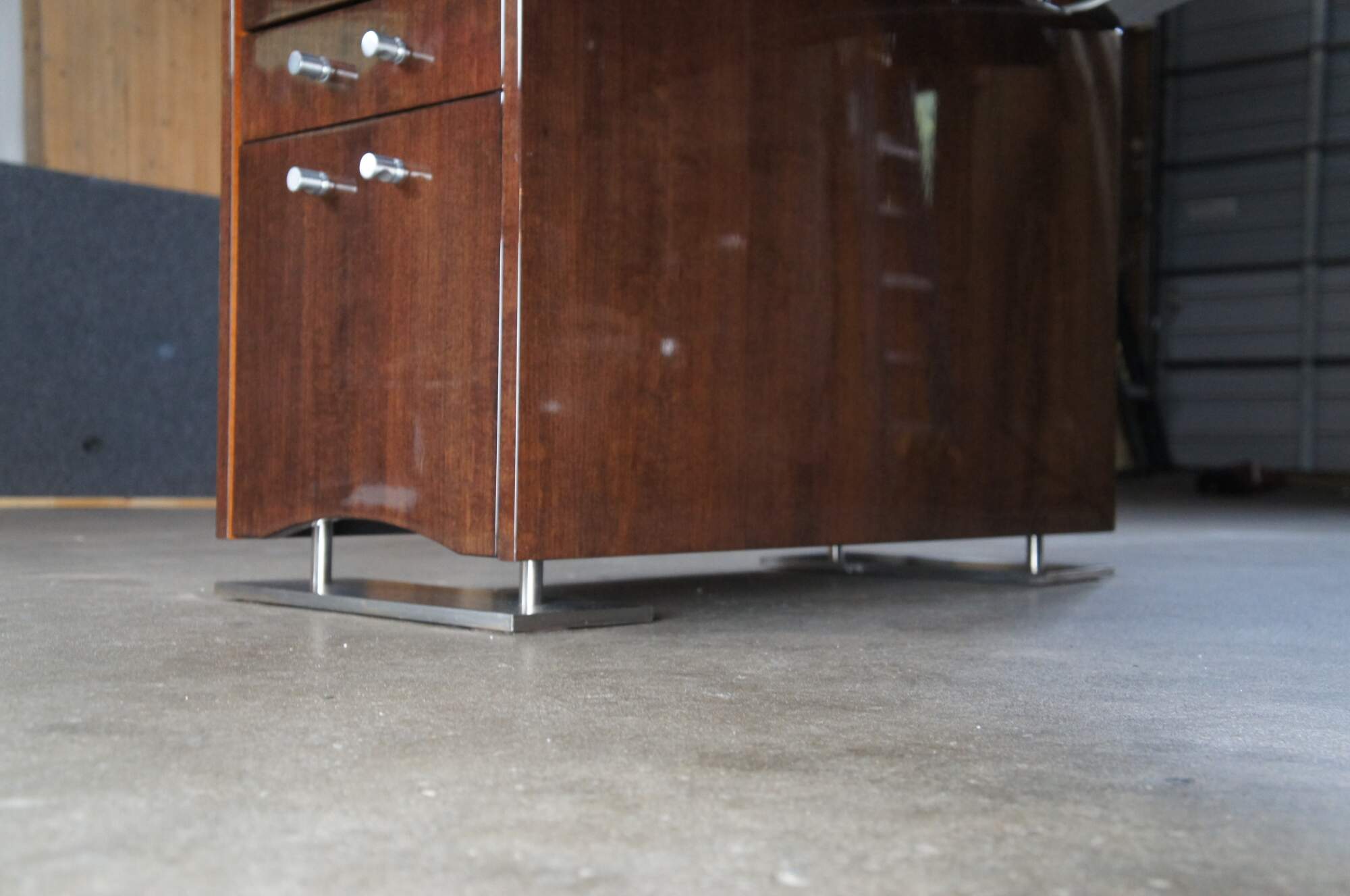 Vintage Dakota Jackson post modern Art Deco style executive partners desk featuring mahogany with leather insert and stainless steel frame. A V-Shape pattern veneer top with Black Leather inset. 2 pedestal cabinets below: each with 2 standard drawers and 1 file drawer, front and back. Polished Stainless Steel drawer pulls, post, floor plates, and arced trestle supporting desktop. DJ Chelsea Black Leather, Polished Polyresin finish.
