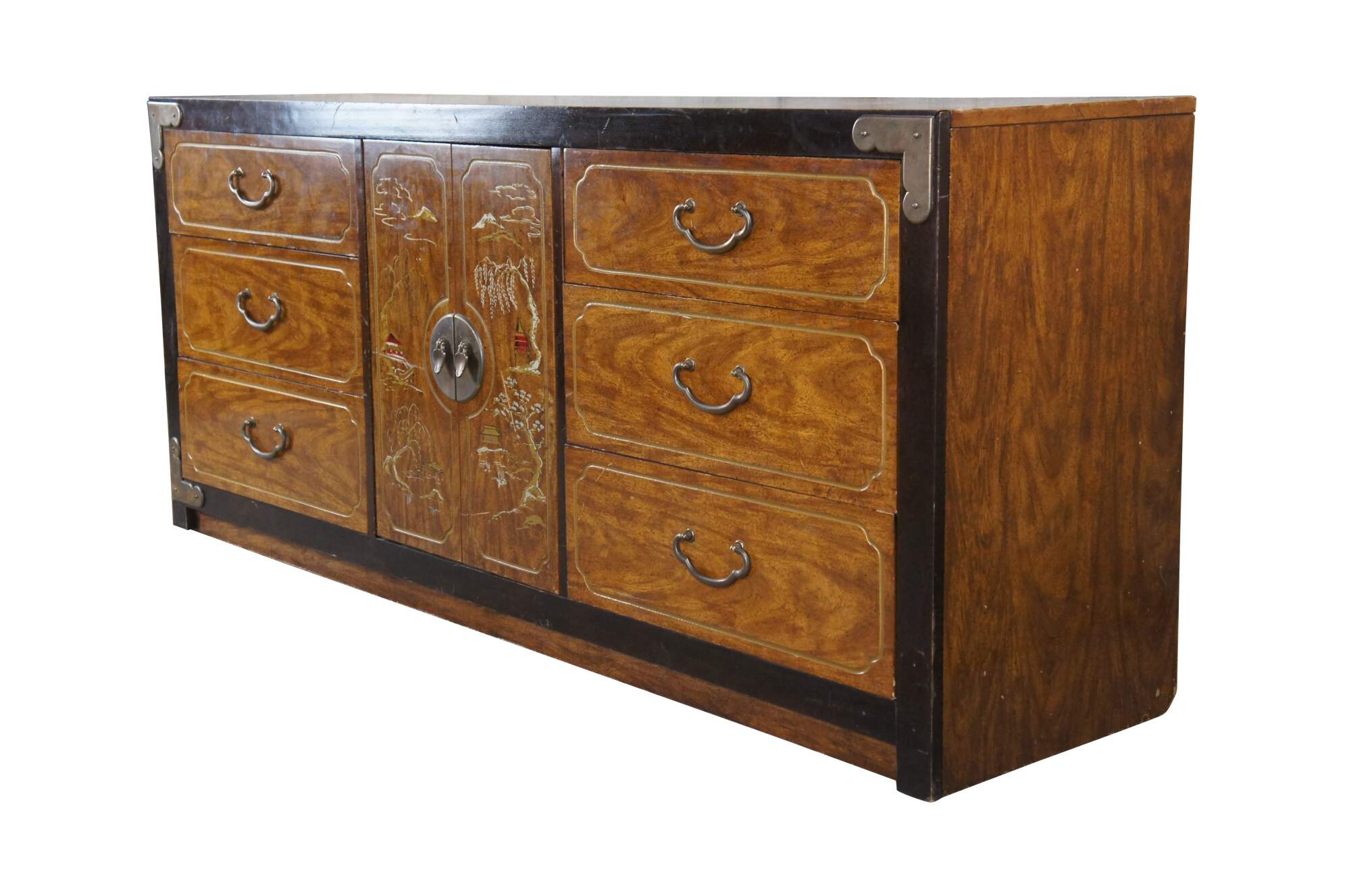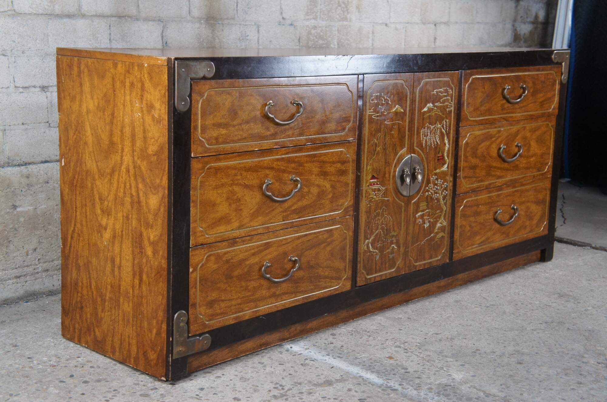 Vintage Chinese Chinoiserie campaign style buffet, credenza or dresser featuring nine drawers, brass hardware and a pagoda and mountain landscape scene.
