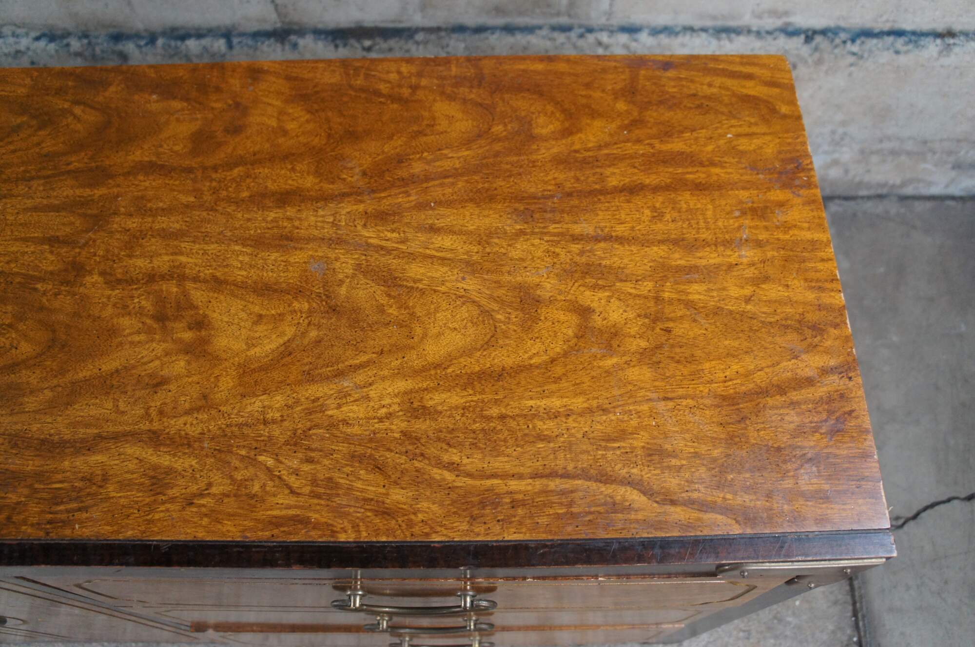 Good overall, wear and distressing commensurate with age and use, marking / scuffing / finish loss, surface adn edge wear, missing lower right brass accent.