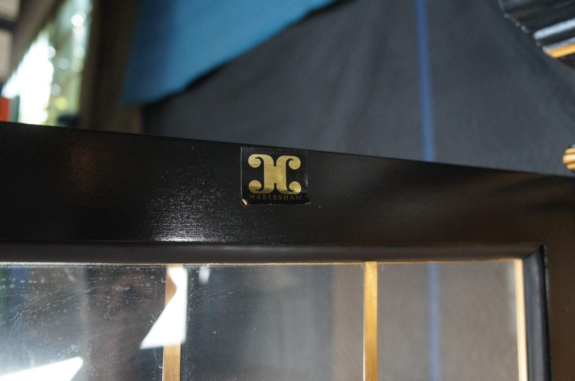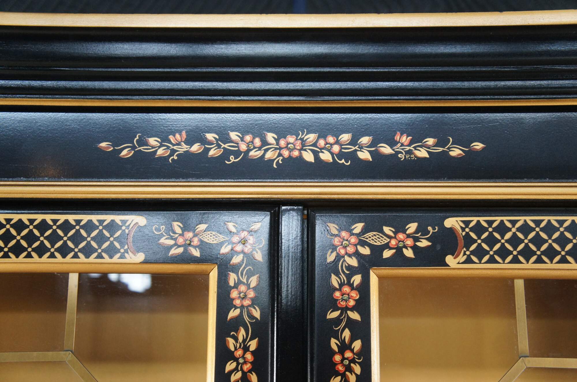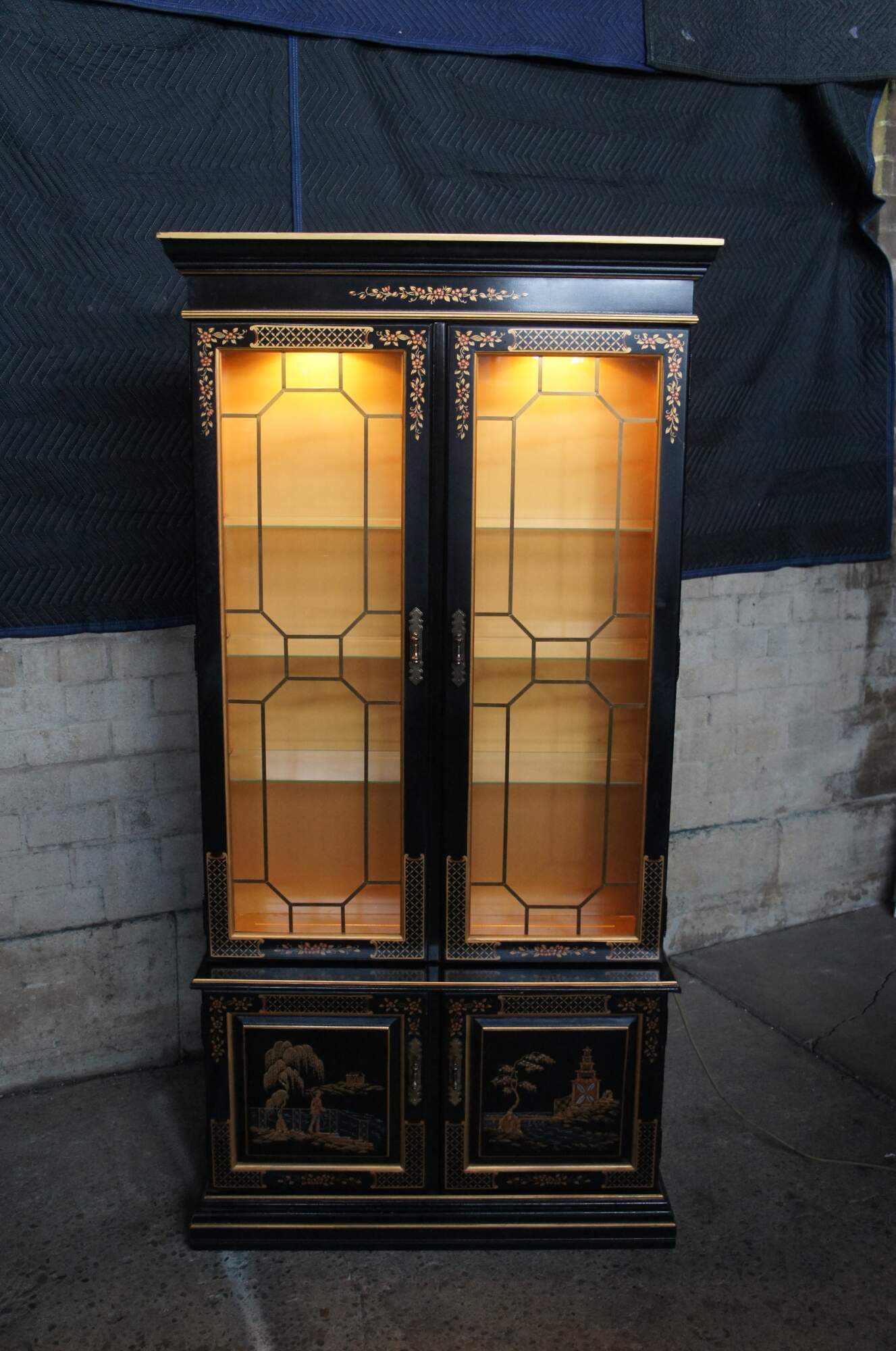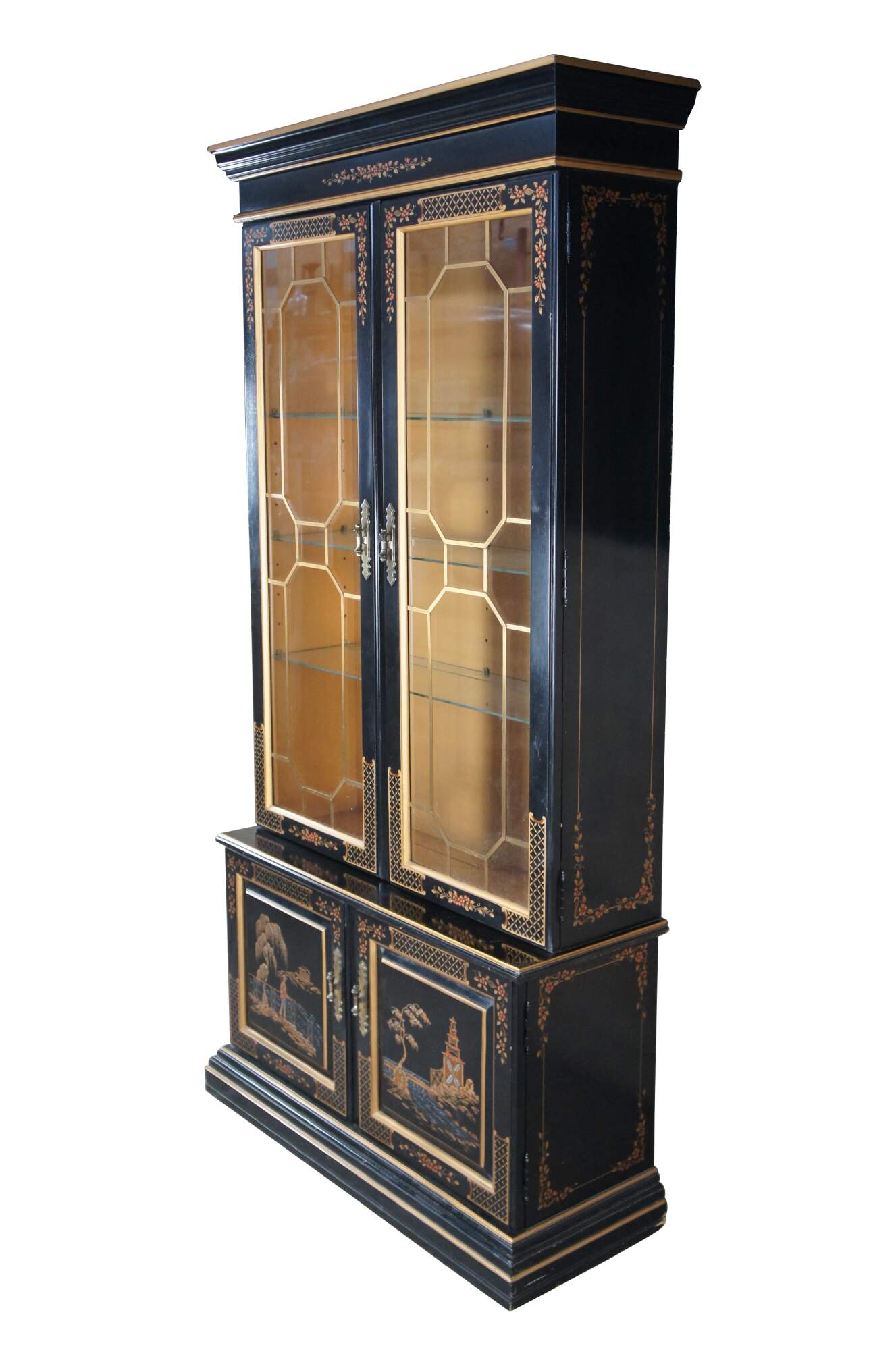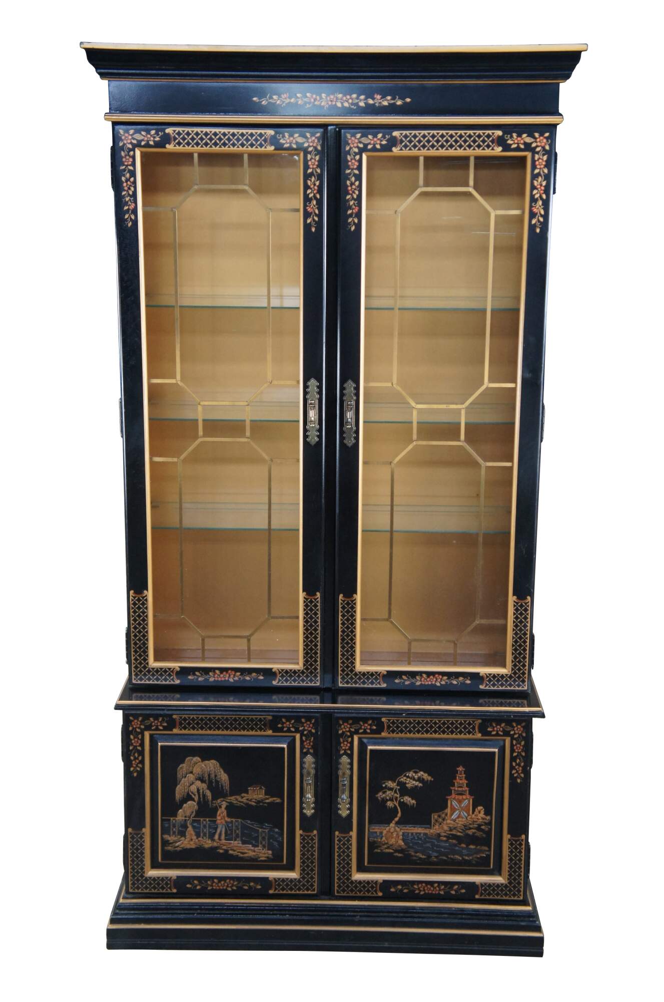 Vintage Habersham black lacquer illuminated china display cabinet. Chinese Chippendale / Chinoiserie styling with upper lattice doors decorated with floral motif, over lower cabinet that features a landscape / seascape with pagoda and fisherman.