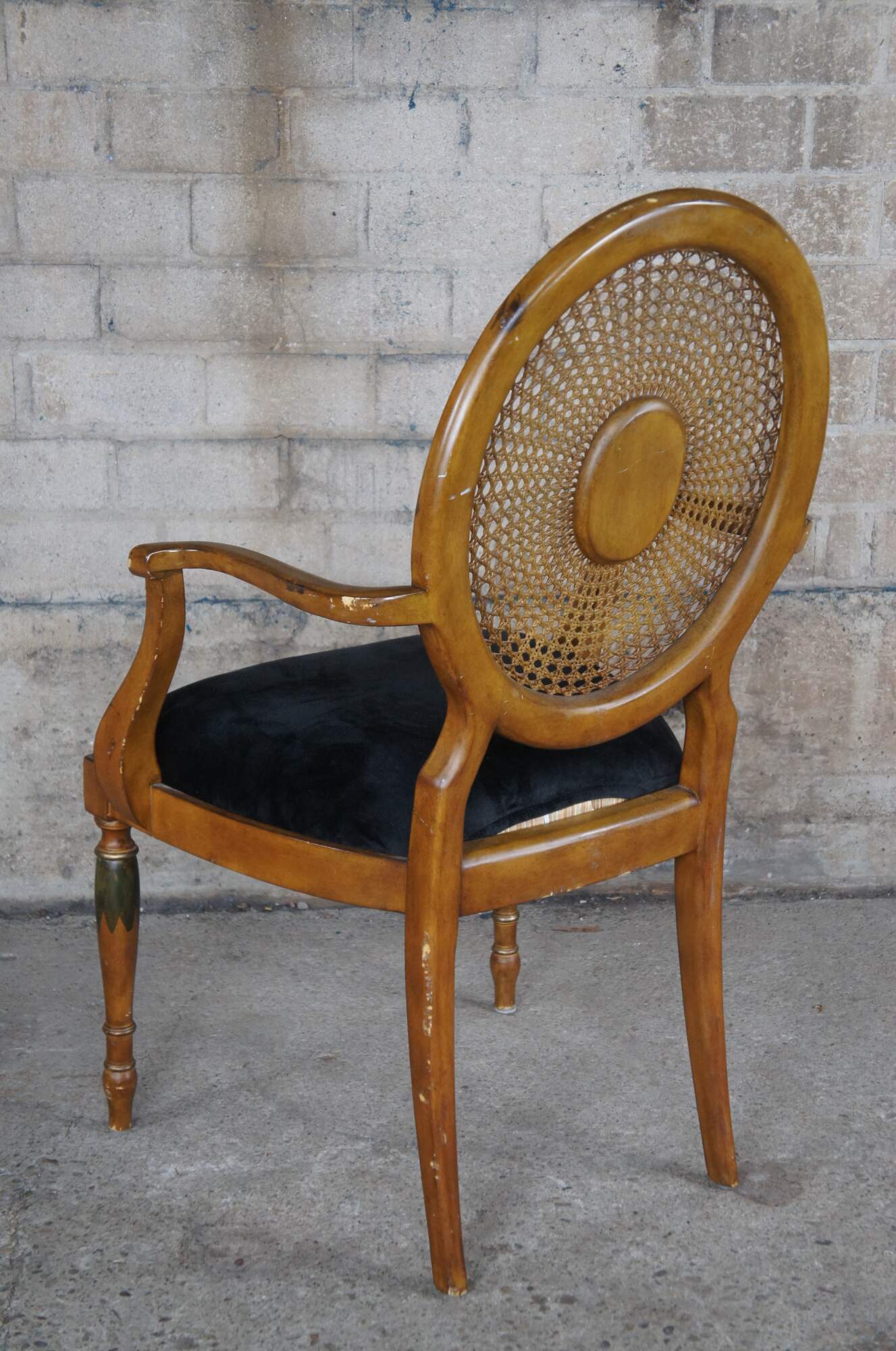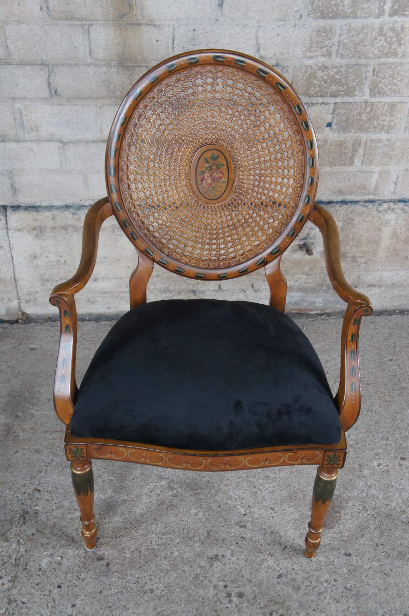 Vintage Pulaski Furntiure armchair. Featuring Louis XVI styling with caned wheel back, flared arms and hand painted details. Made in Italy.