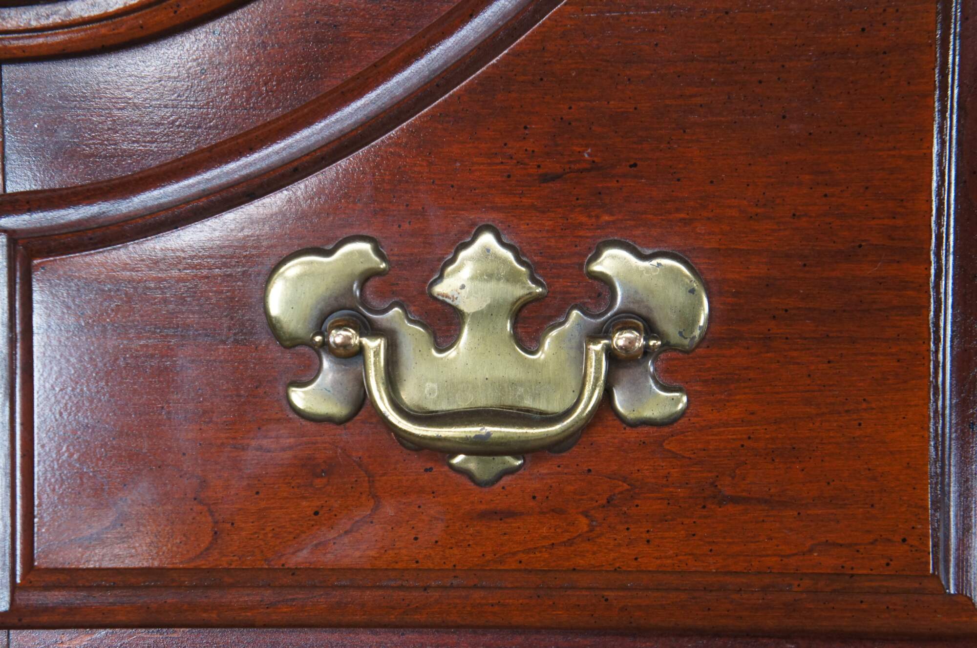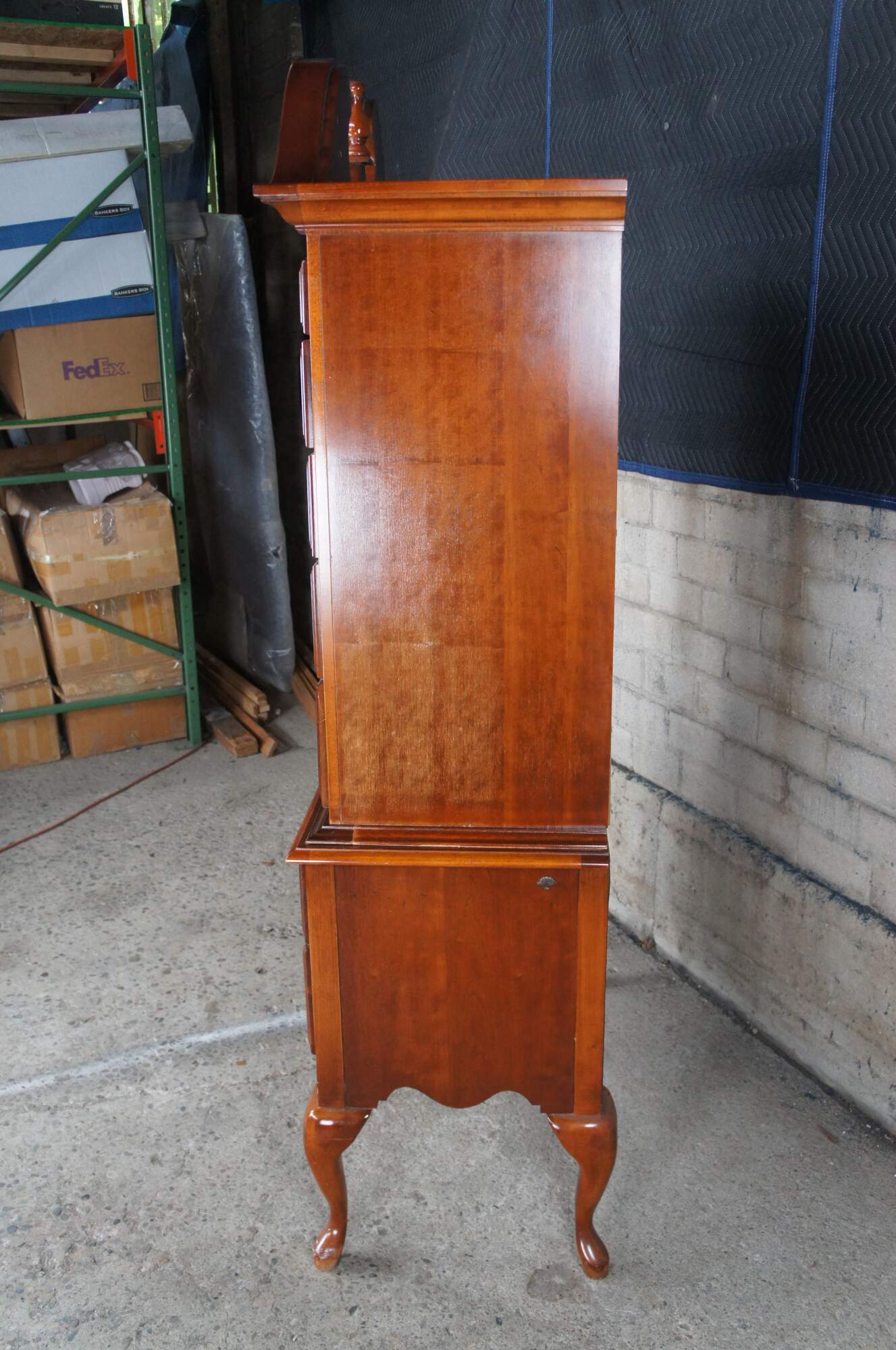 Vintage American Drew highboy chest or dresser. A chest on chest design made of cherry featuring Queen Anne styling with open pediment crown over nine drawers with Federal style brass hardware and sepentine cabriole legs.
