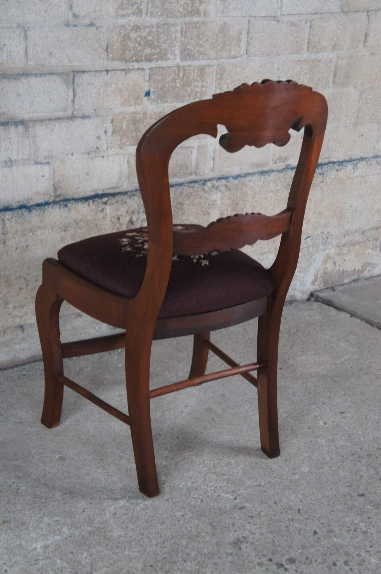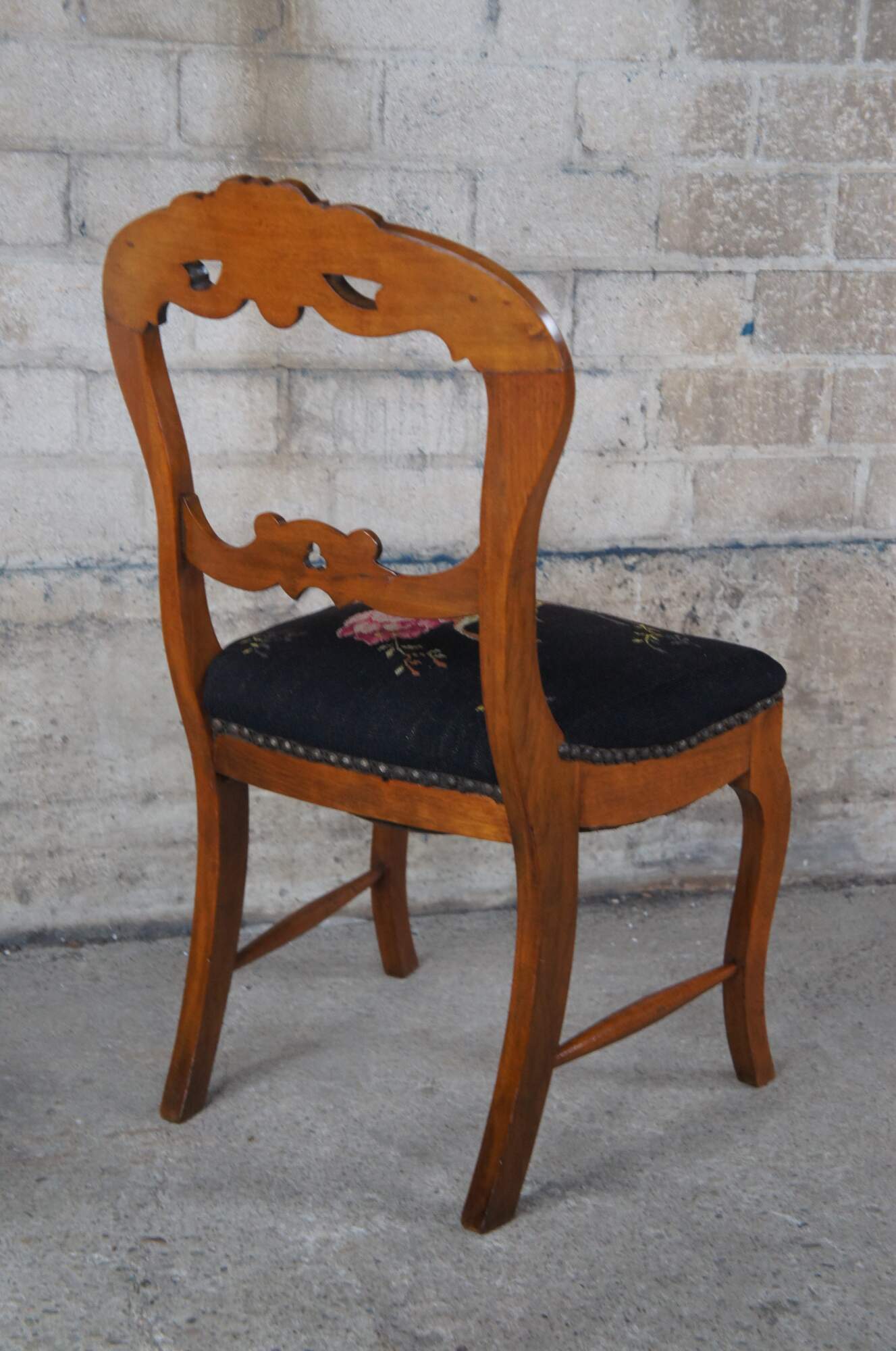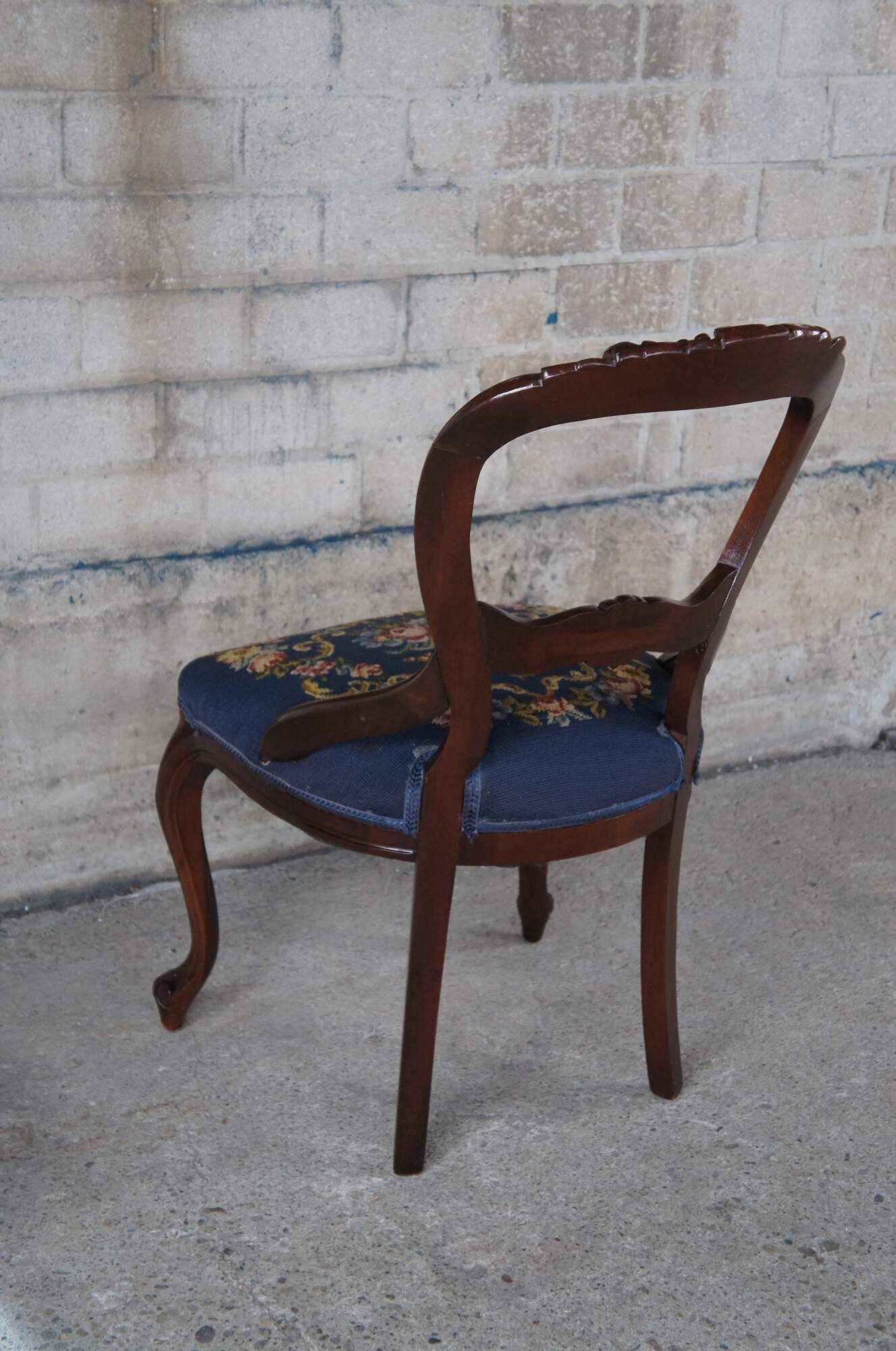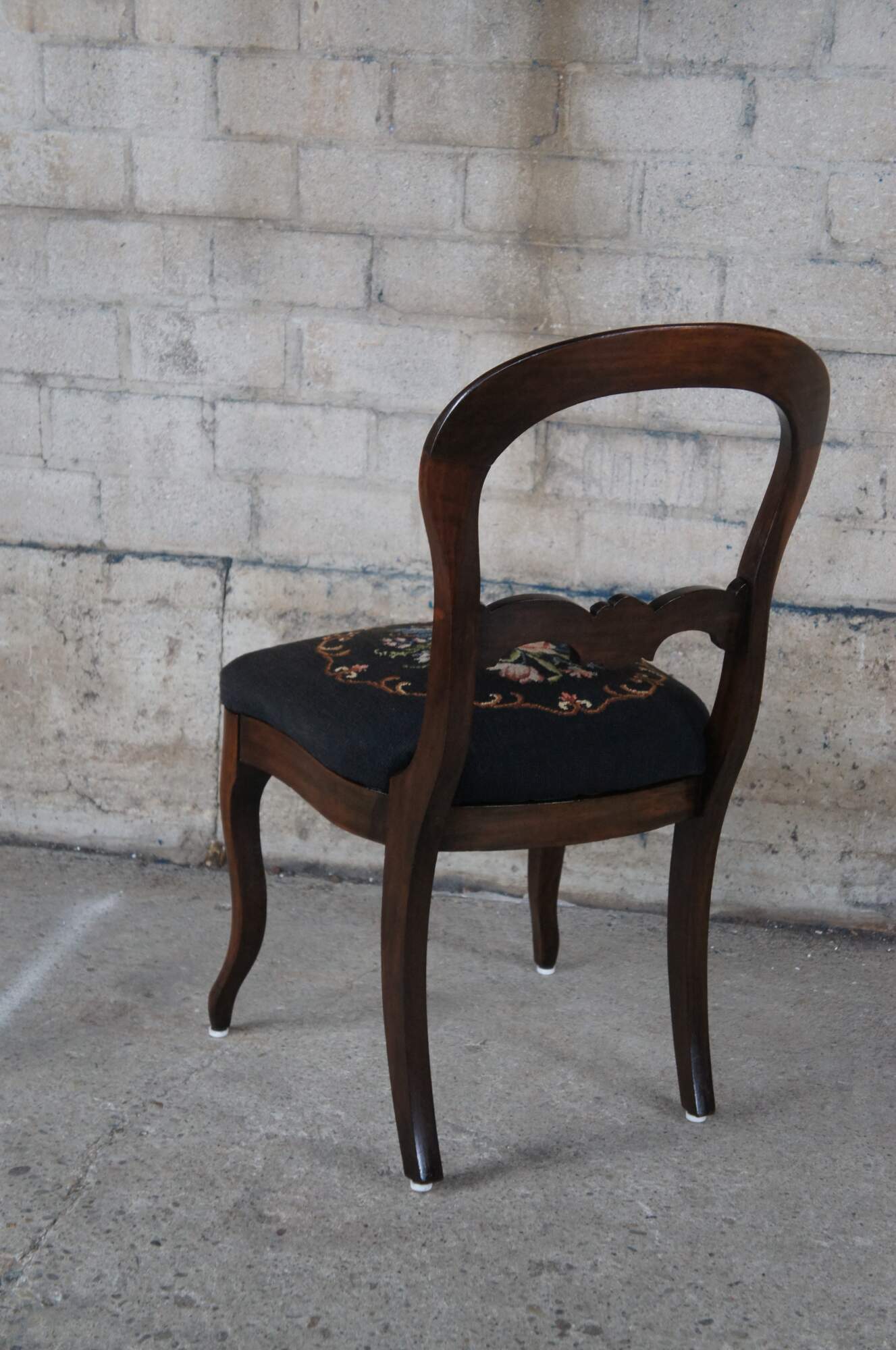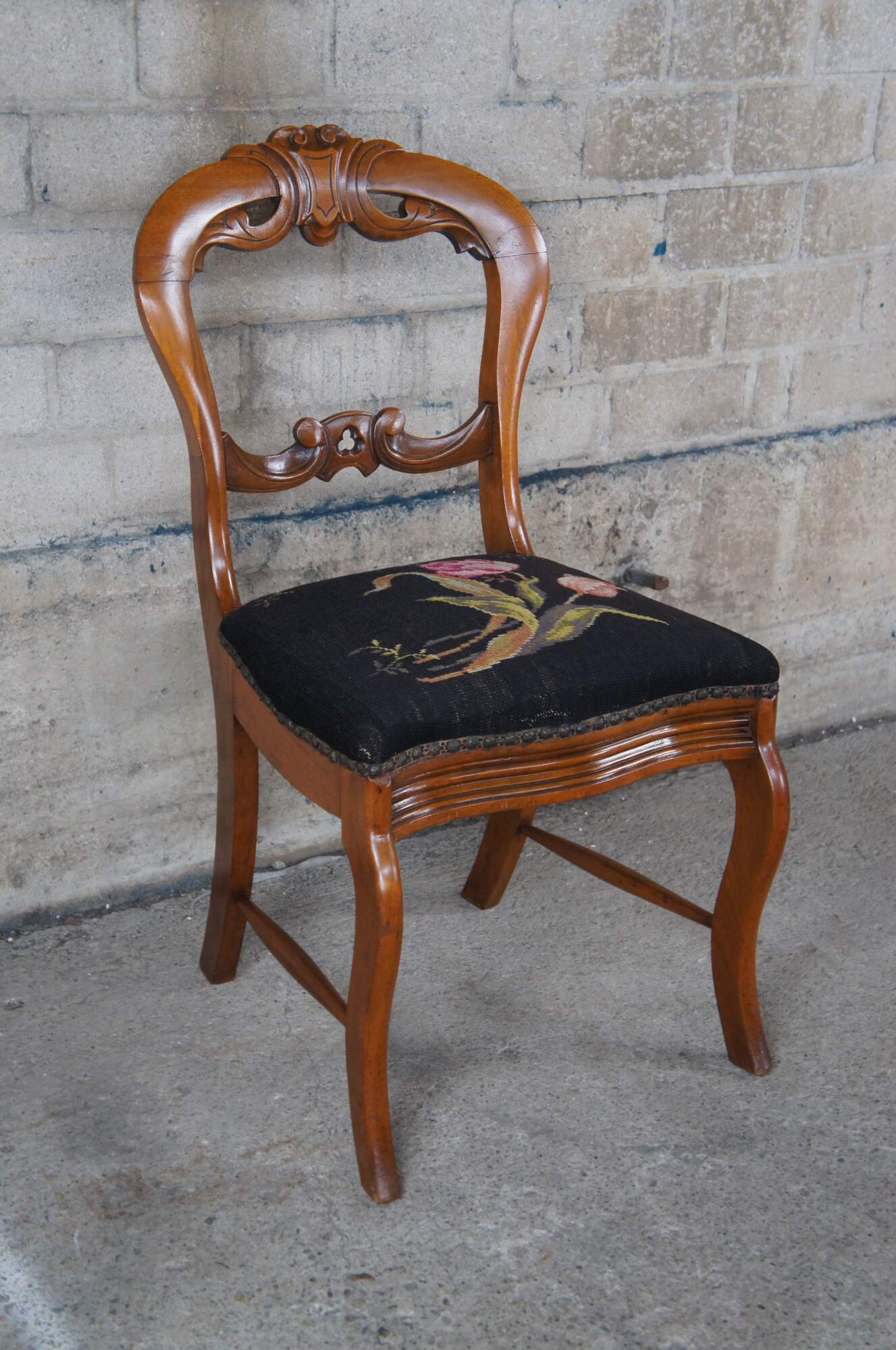 Lot of 4 Victorian Dining or side chairs from the last half of the 19th century. Each is made from mahogany with a carved balloon back and floral needelpoint. Each of the chairs has a serpentine front apron and contoured or cabriole legs.