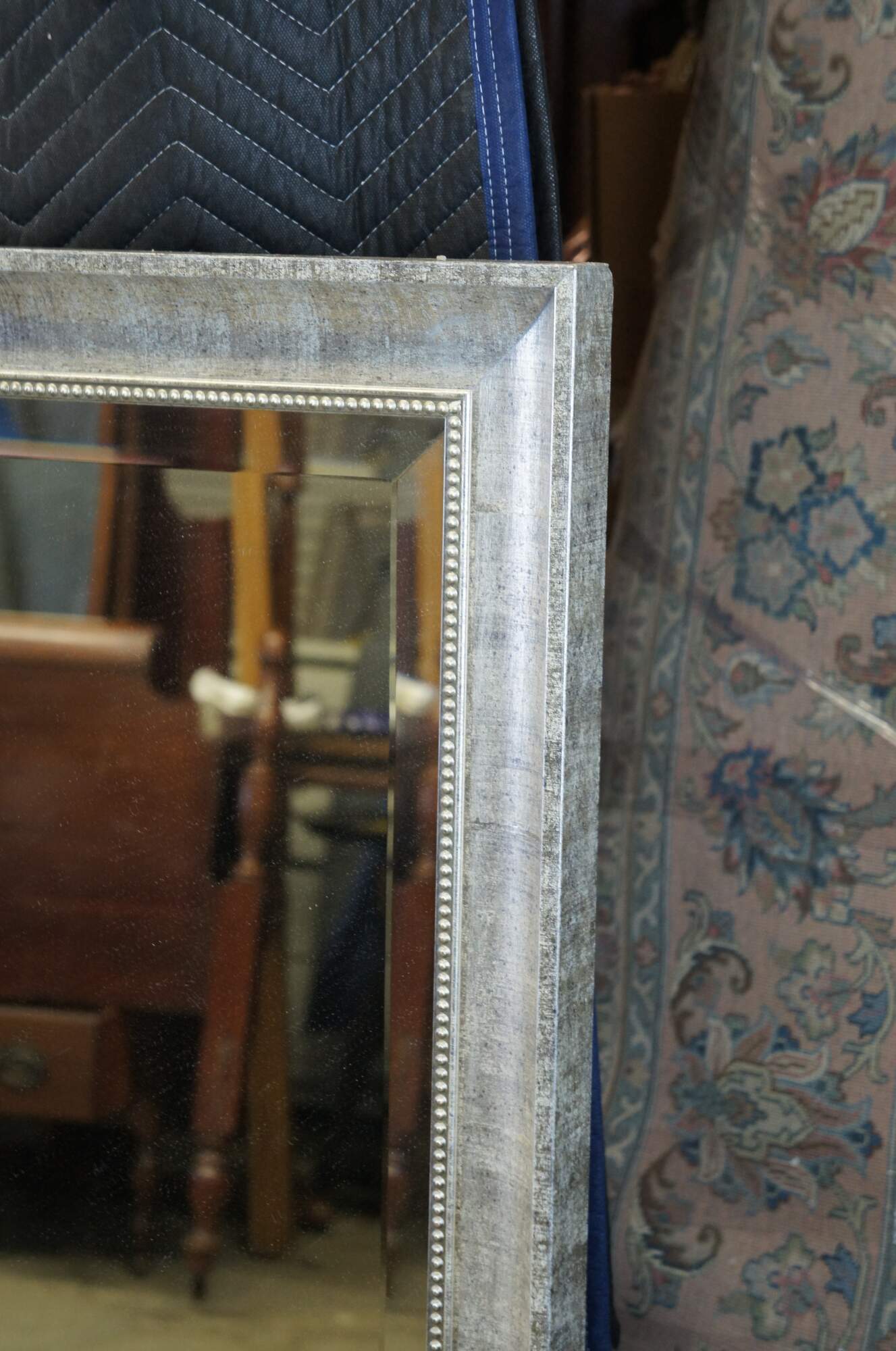 A massive silver full length modern leaner mirror. Features beaded trim and beveled plate glass. Can be used as a leaner, hung along the wall or even over a mantel / behind a bar.