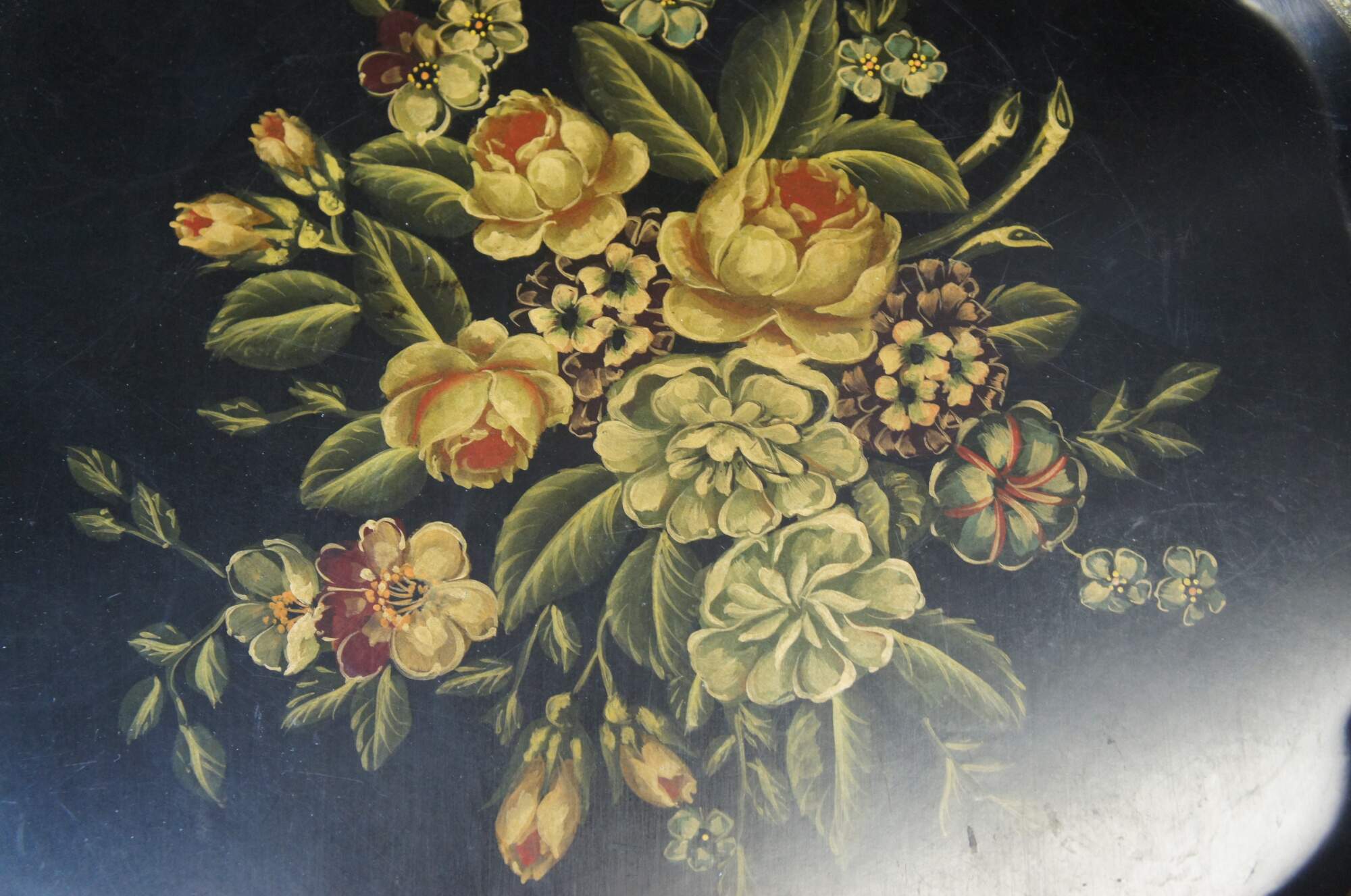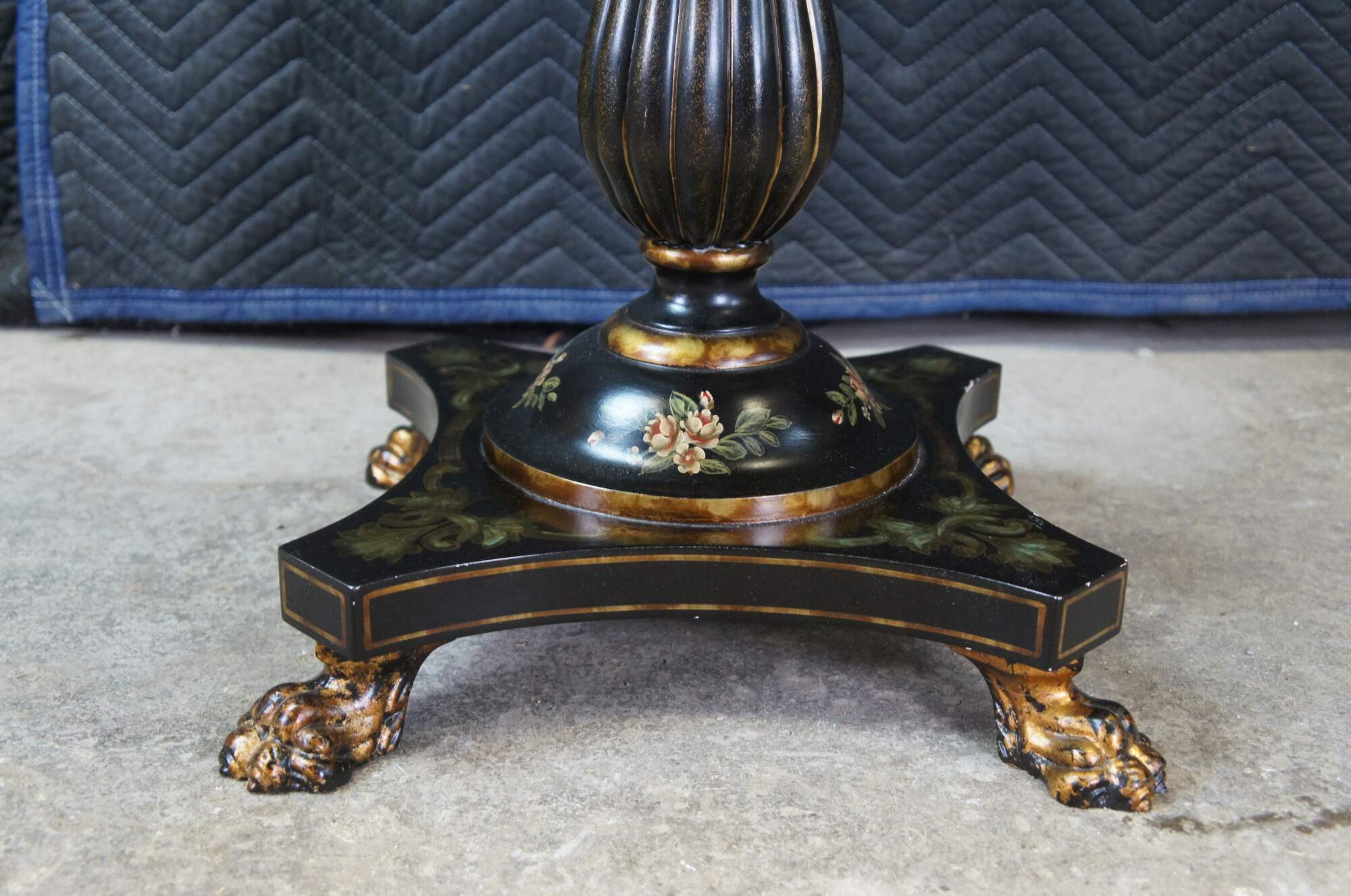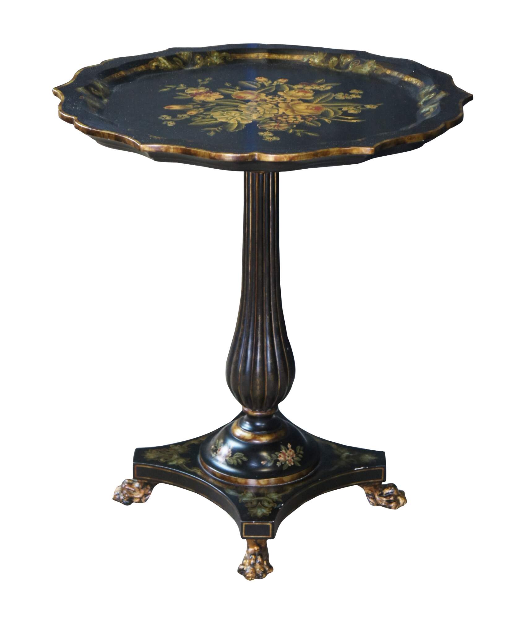 Maitland Smith ebonized pedestal tabel, circa last quarter 20th century. Drawing inspiration from Victorian and French Empire styling. Features a scalloped and floral painted top over a reeded baluster leading to an iron claw foot base.