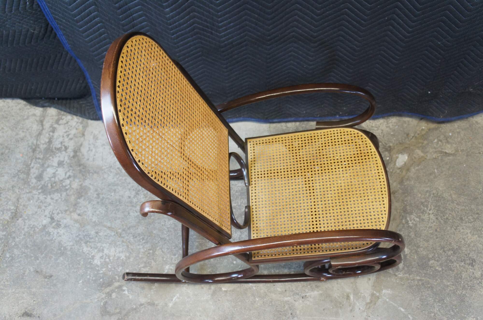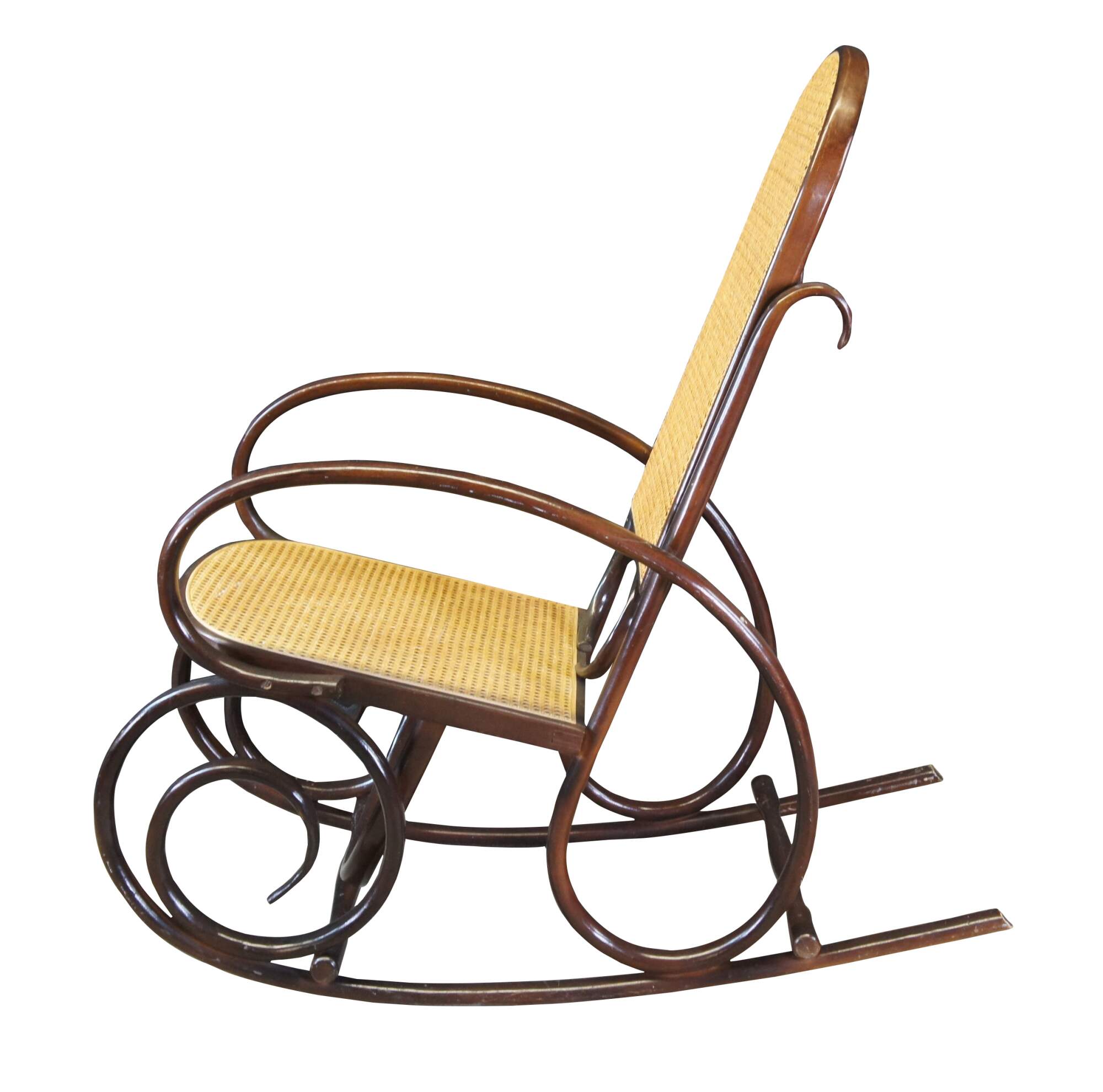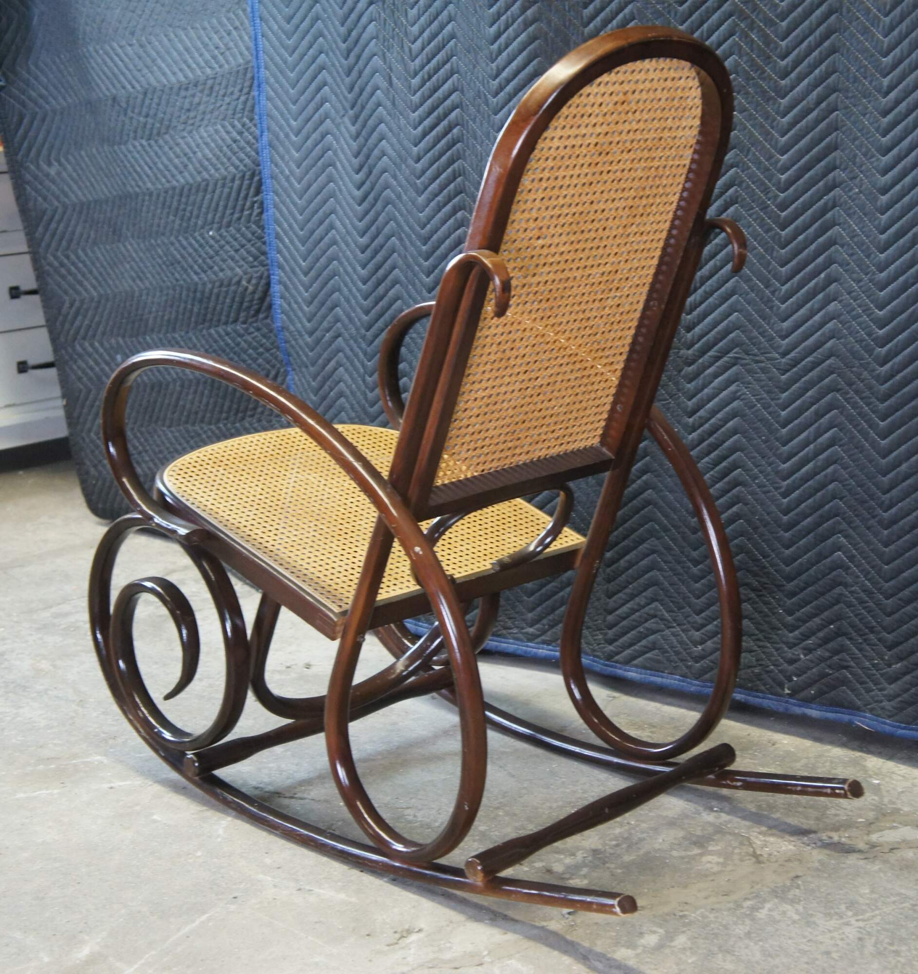 Thonet style attributed rocking chair. Circa mid century. Made from hardwood in classic bentwood styling with rattan back and seat.