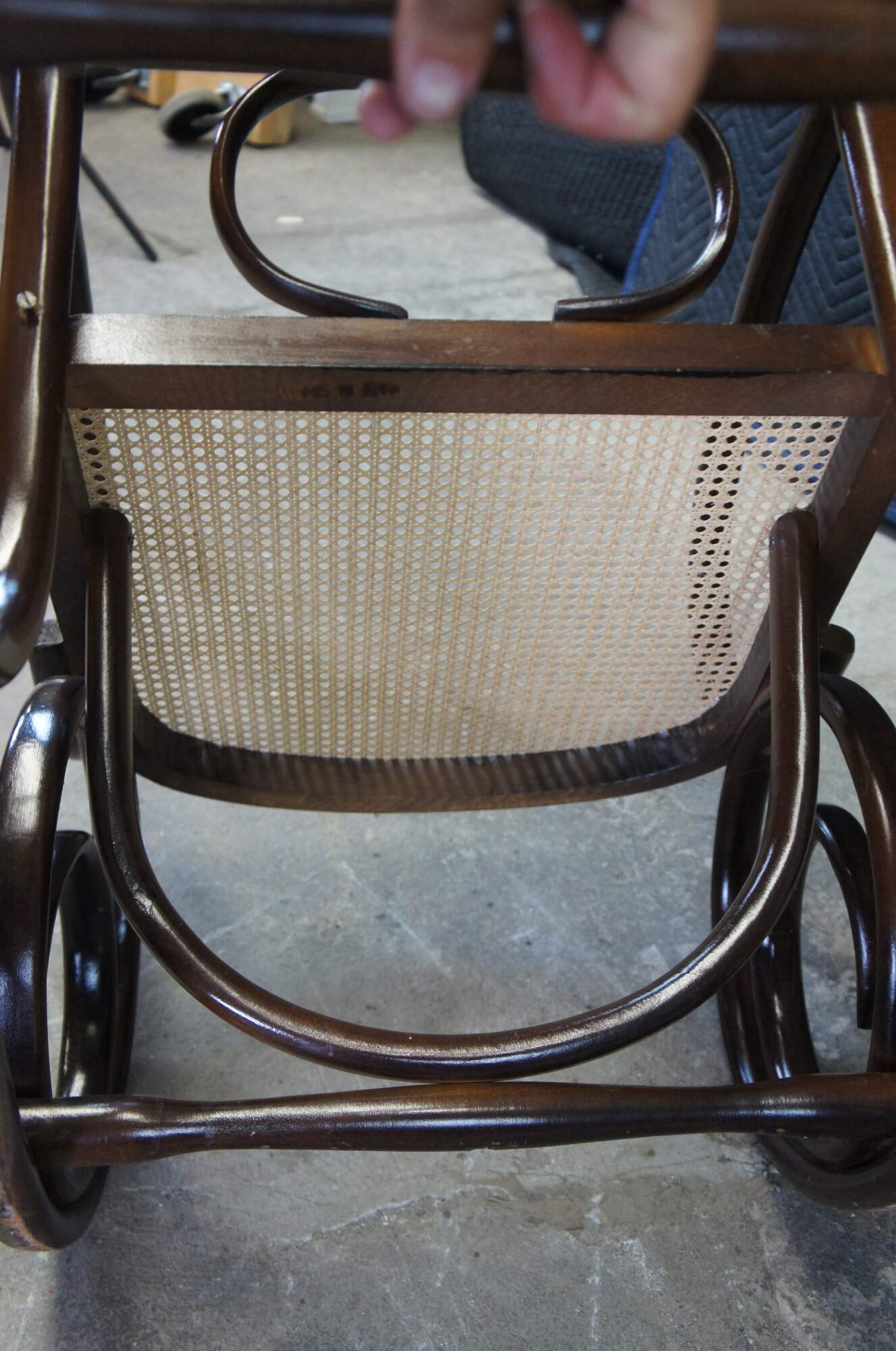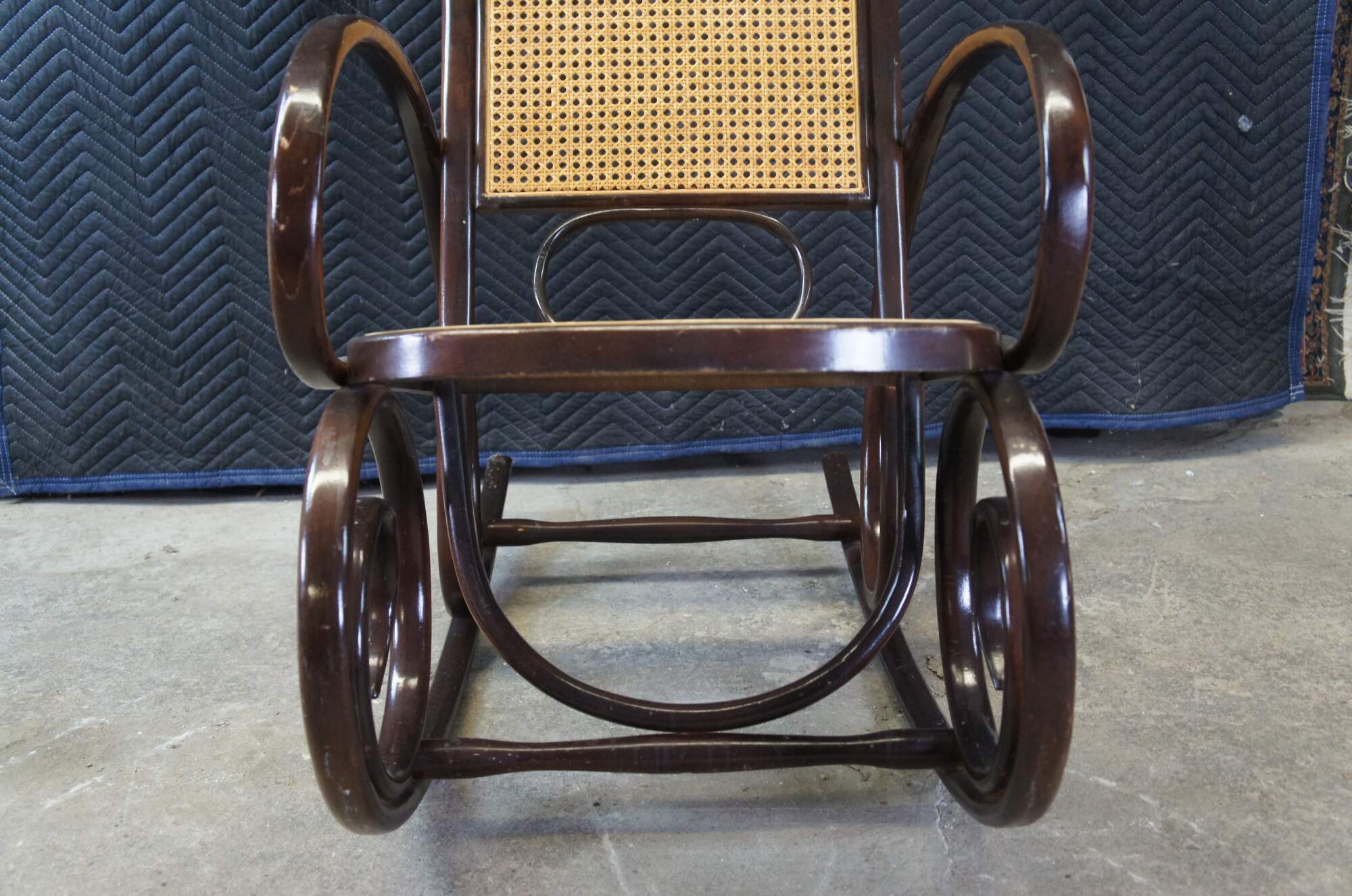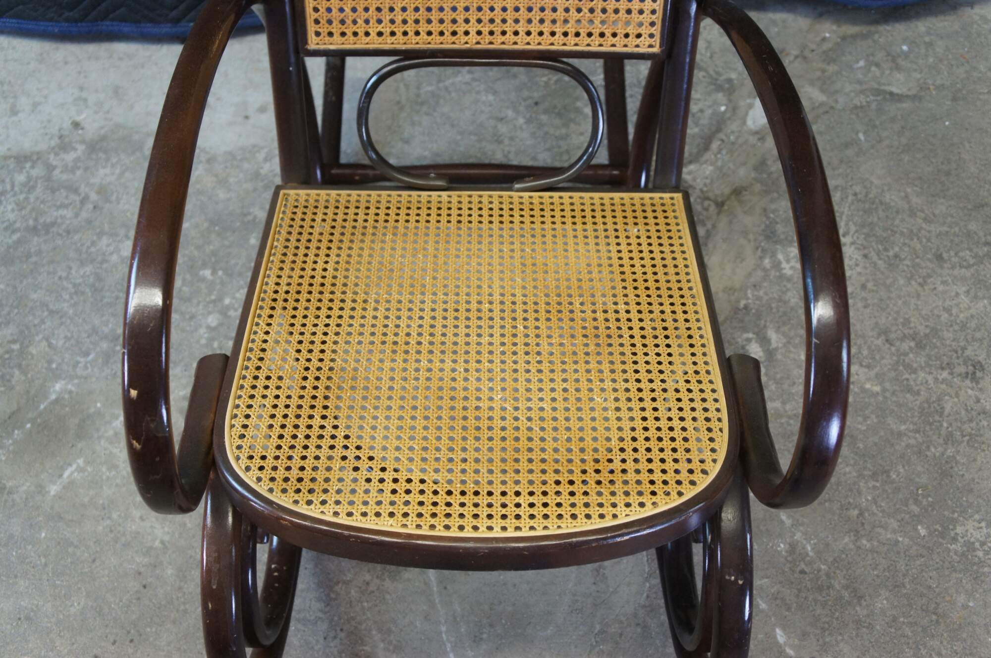 Thonet style attributed rocking chair. Circa mid century. Made from hardwood in classic bentwood styling with rattan back and seat.