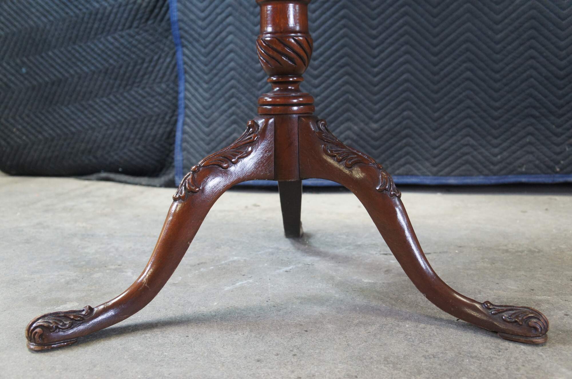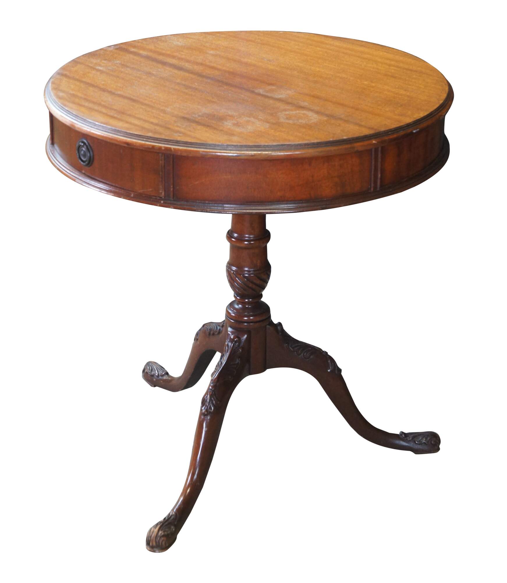 An antique Georgian style drum table. Made from mahogany with rounded top featuring a drawer within the frieze over a turned and carved column leading to downswept tripod base with scrolled pad feet.